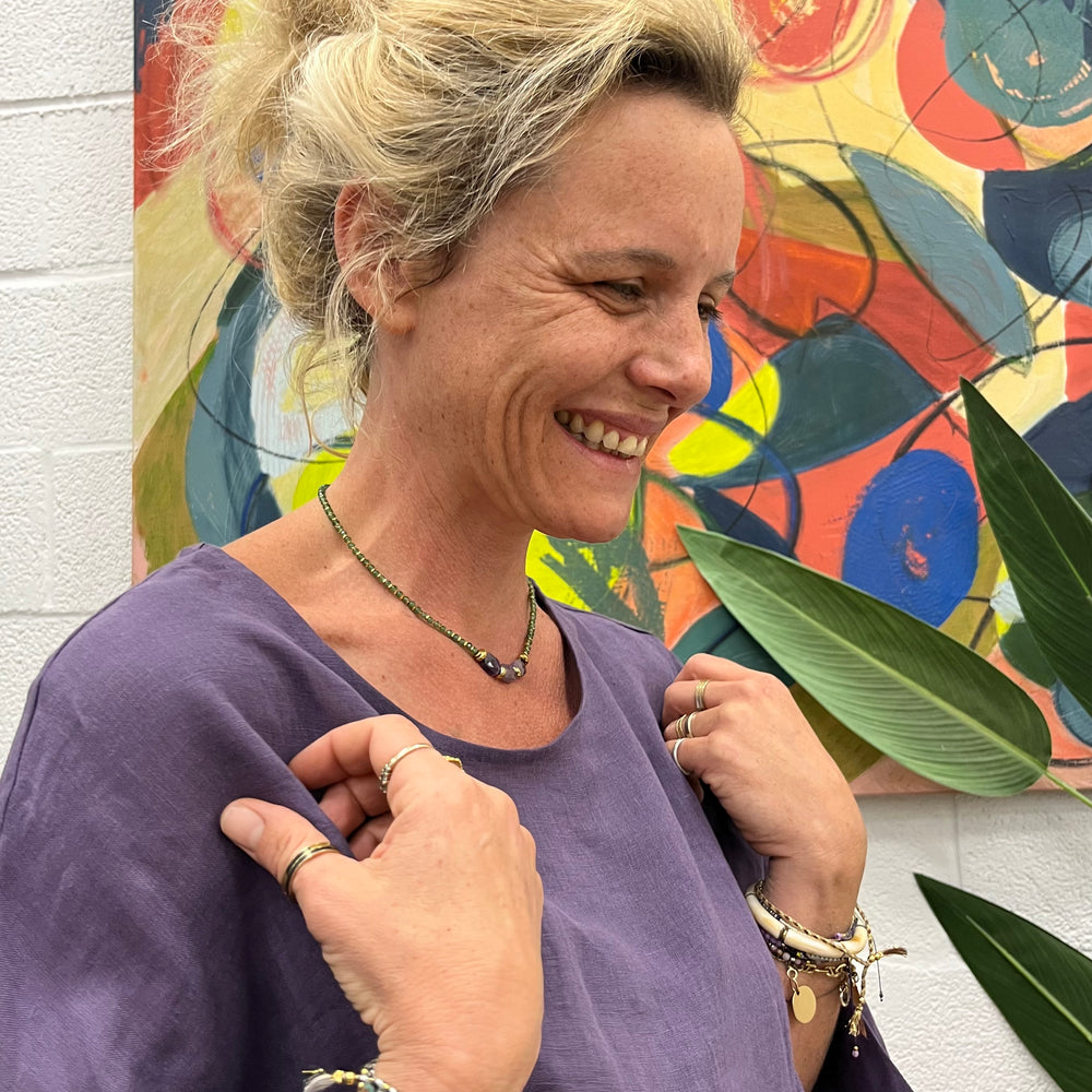 "Odyssée" se présente comme un collier court élégant, mariant harmonieusement les pierres d'aventurine verte facettées et les perles dorées.