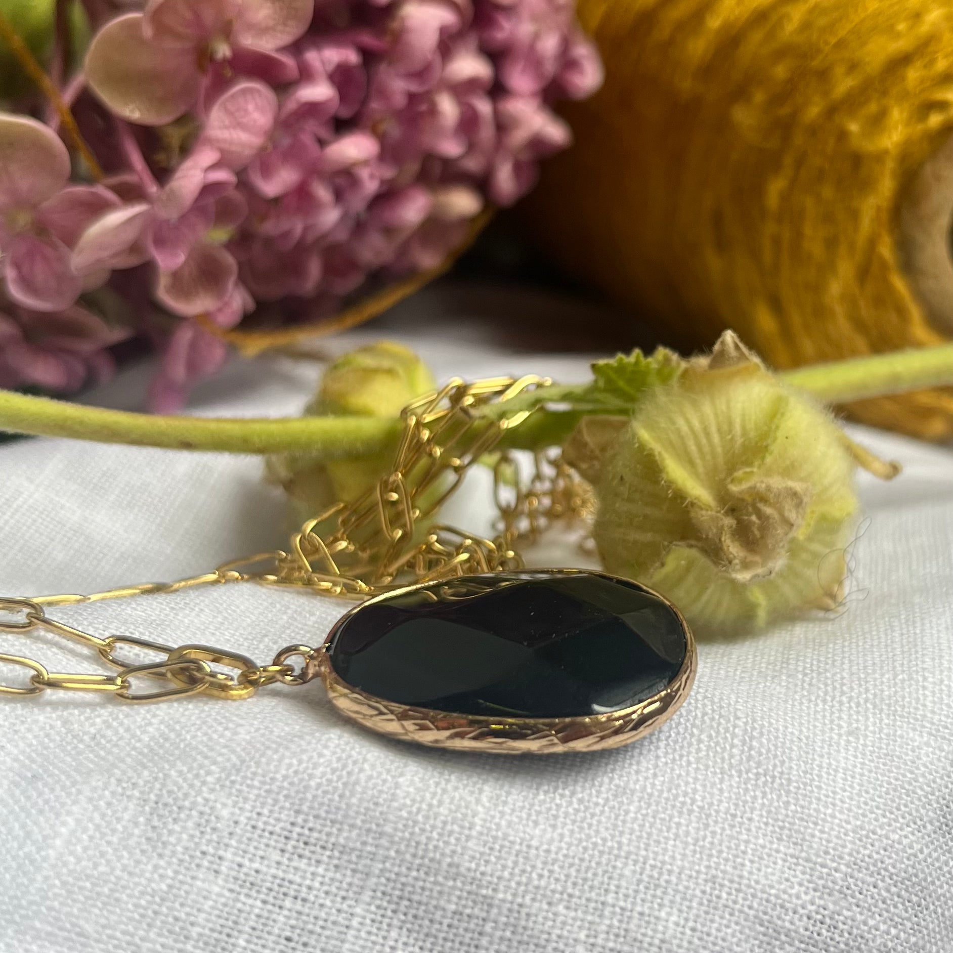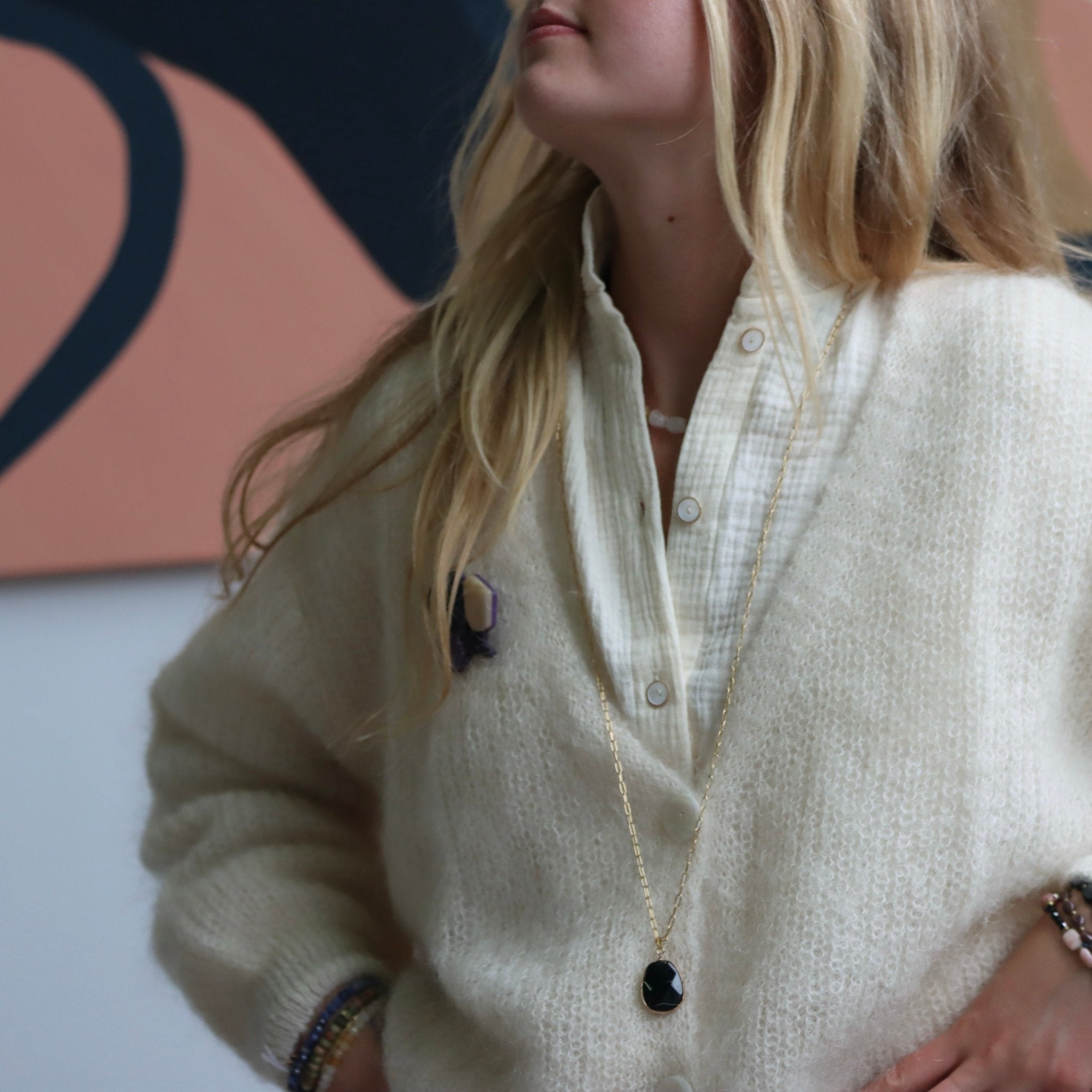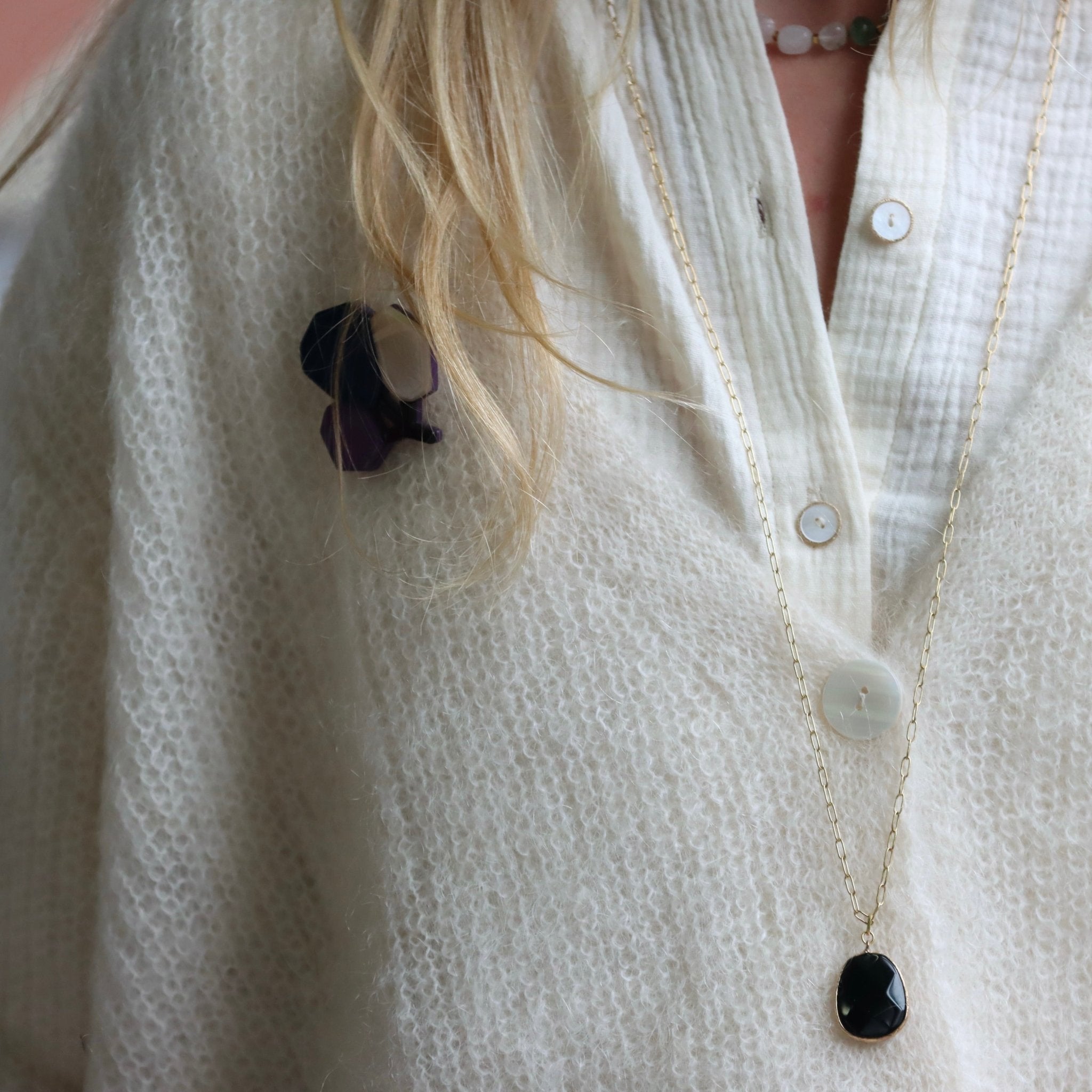 Pétale est une longue chaîne avec une maille rectangulaire, agrémentée d'une pierre semi-précieuse sertie.