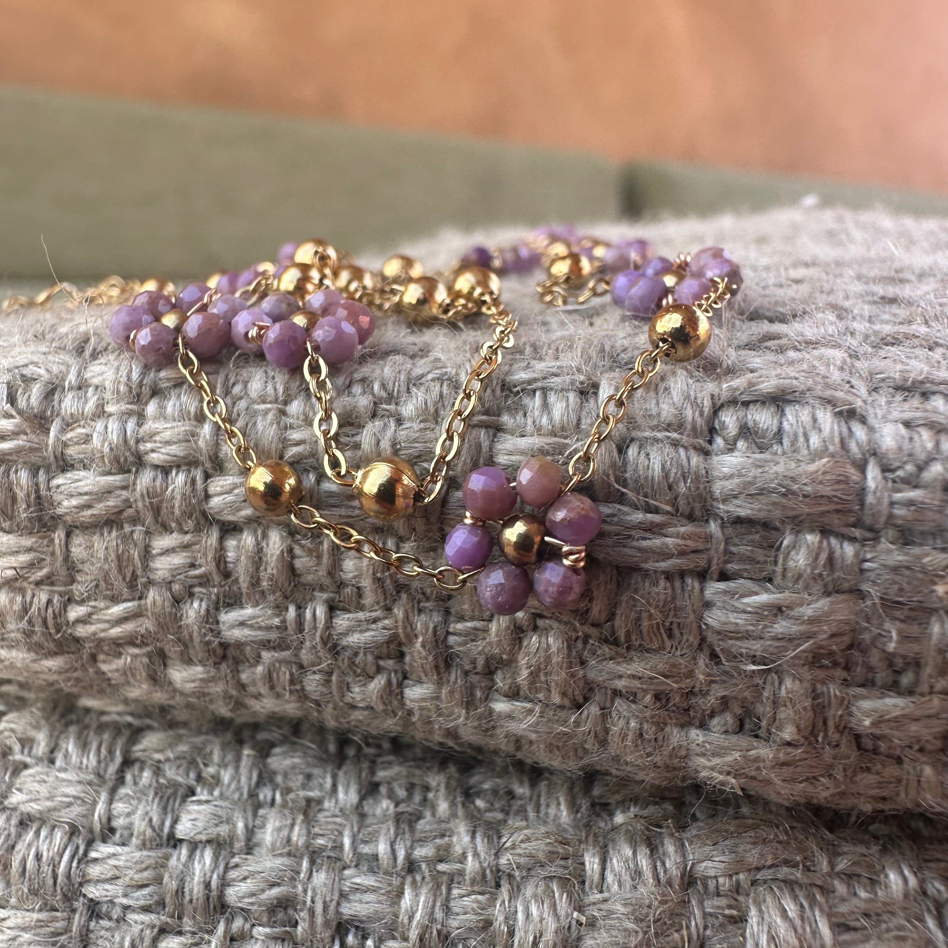 "Tendresse" est un collier délicat, composé d'une chaîne ornée de perles dorées et agrémenté de fleurs formées de petites perles vertes Aventurine.