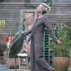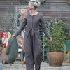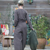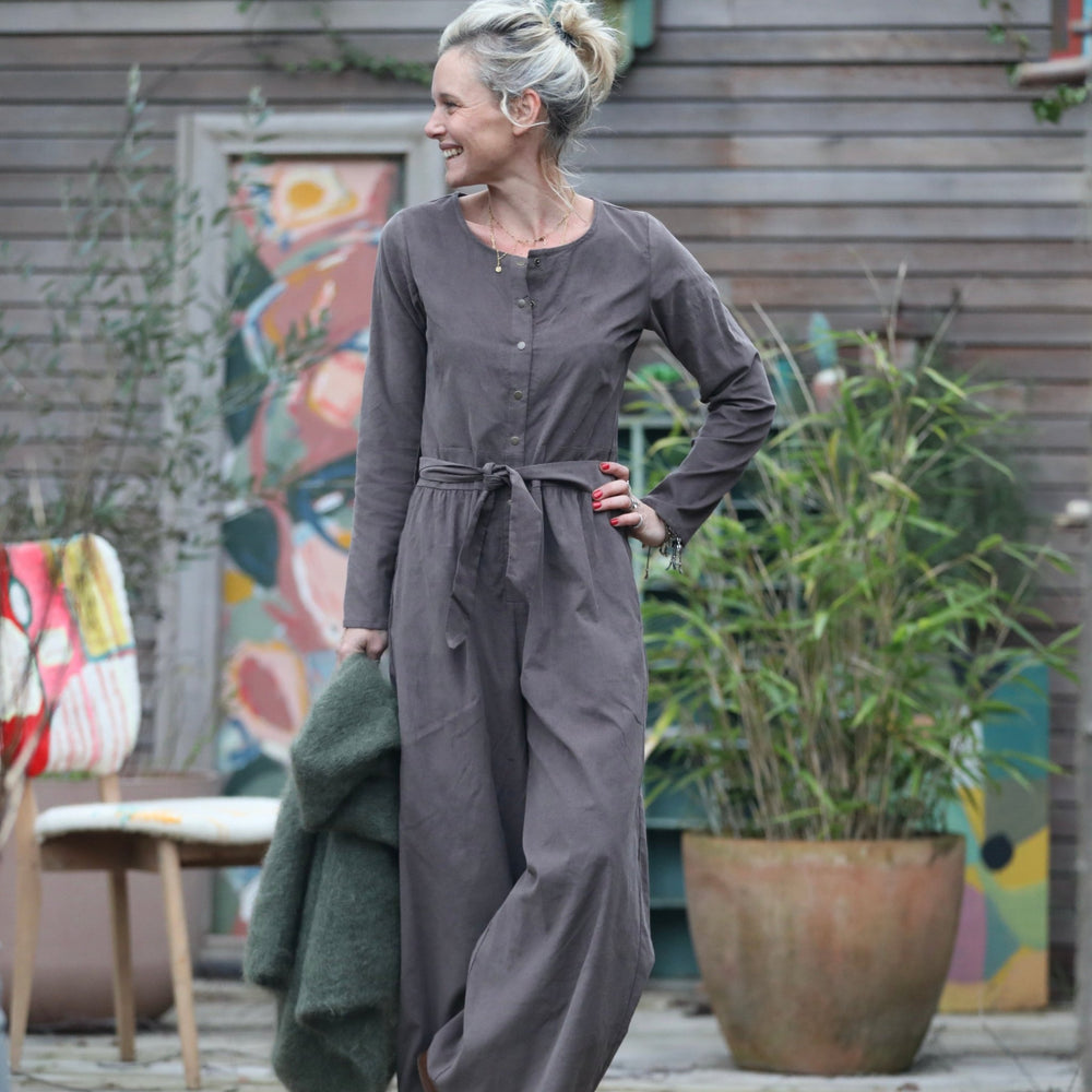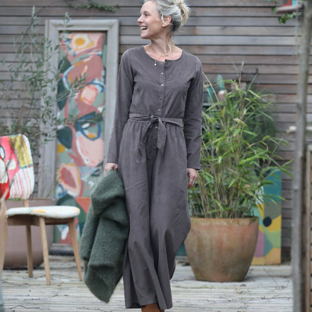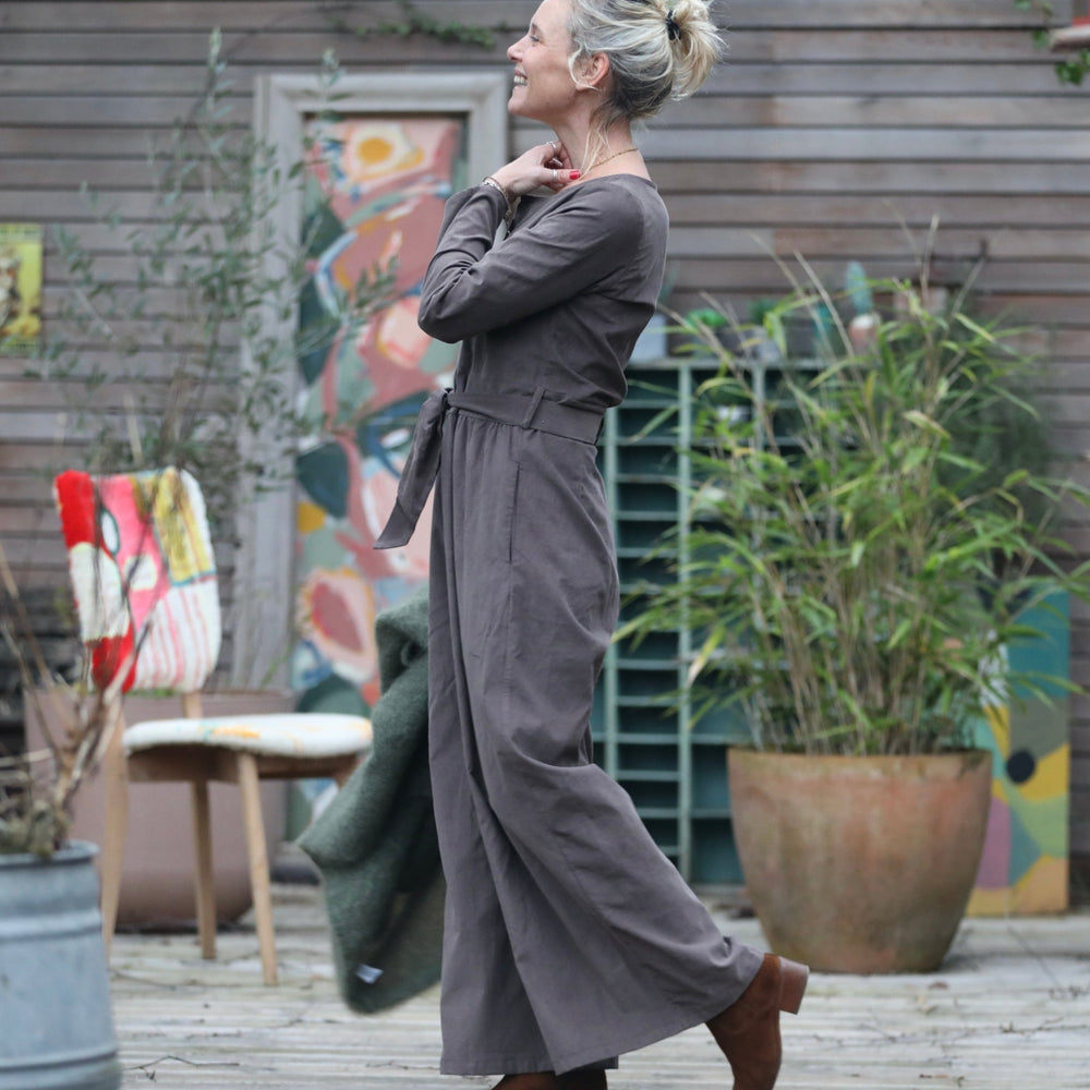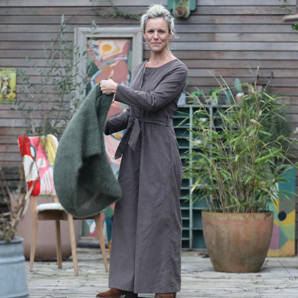 Elle est dotée de boutons-pression, de deux poches discrètes sur les côtés, d'une ceinture intégrée à la taille, ainsi que d'une ceinture amovible à passer dans des passants prévus à cet effet.