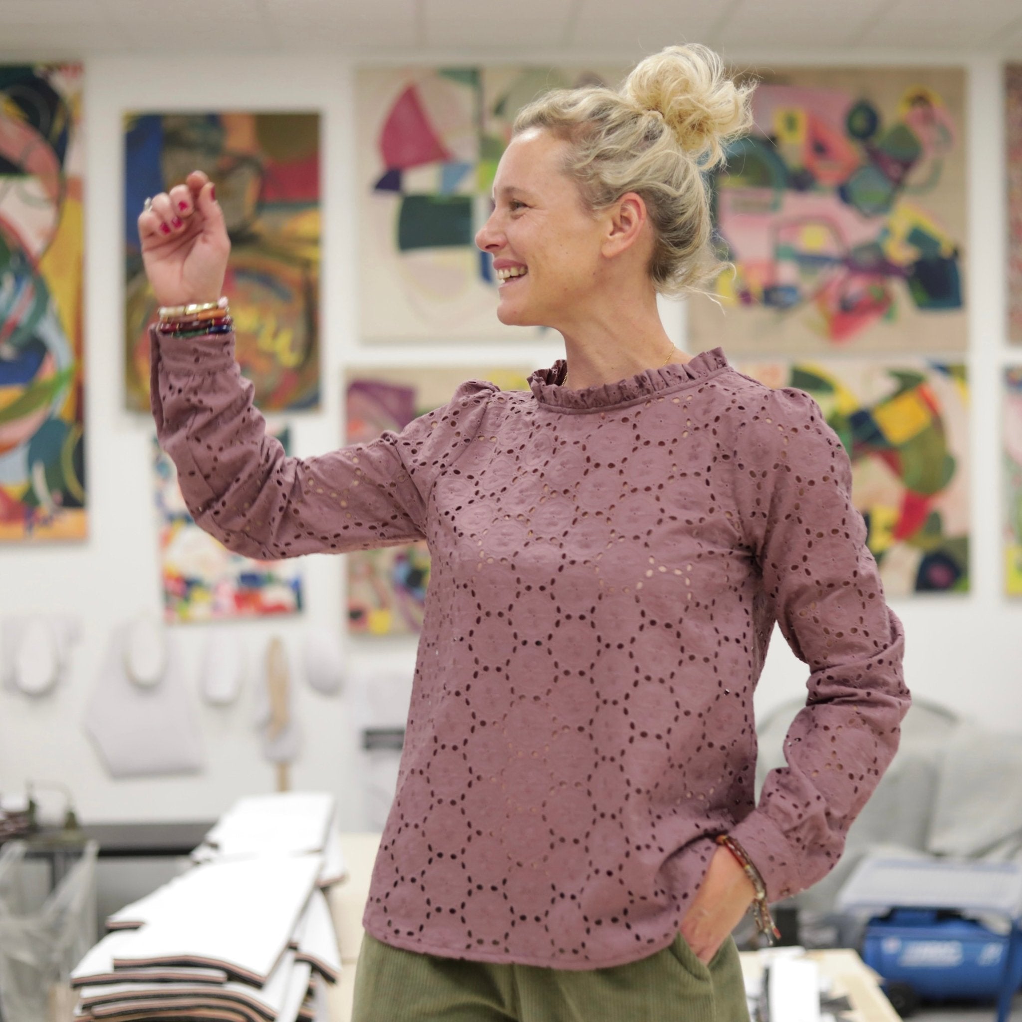 La blouse Fantine se marie aisément avec un jean clair, un pantalon blanc ou une jupe fluide. Sa teinte parme, douce et élégante, illumine la silhouette et apporte une touche de couleur délicate.