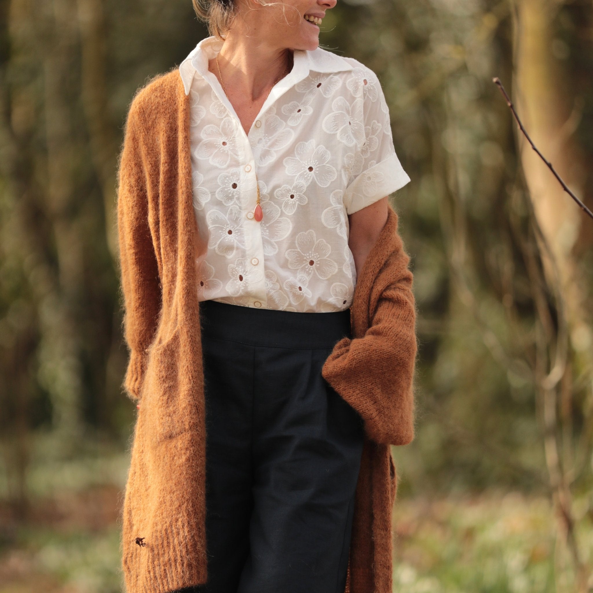 La chemise Honorine se porte facilement avec un jean brut pour un look frais et intemporel, un pantalon beige pour une allure naturelle ou une jupe fluide pour une silhouette plus romantique. Son blanc brodé en fait une pièce essentielle du vestiaire, idéale pour la belle saison.