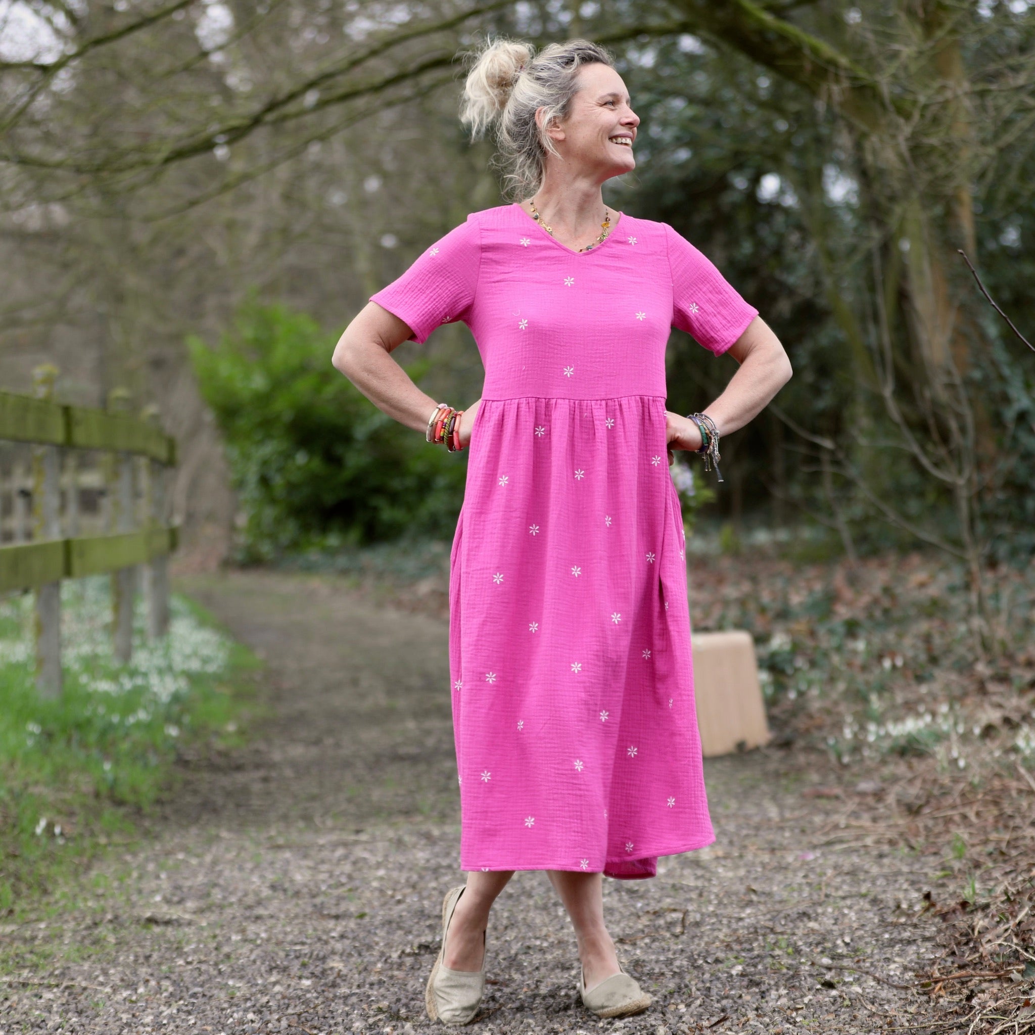 La robe Juliette se porte facilement avec des sandales naturelles pour une allure estivale, des baskets pour un esprit décontracté ou des accessoires dorés pour sublimer l’intensité du fuchsia. Sa couleur vive en fait une pièce forte qui dynamise le vestiaire.