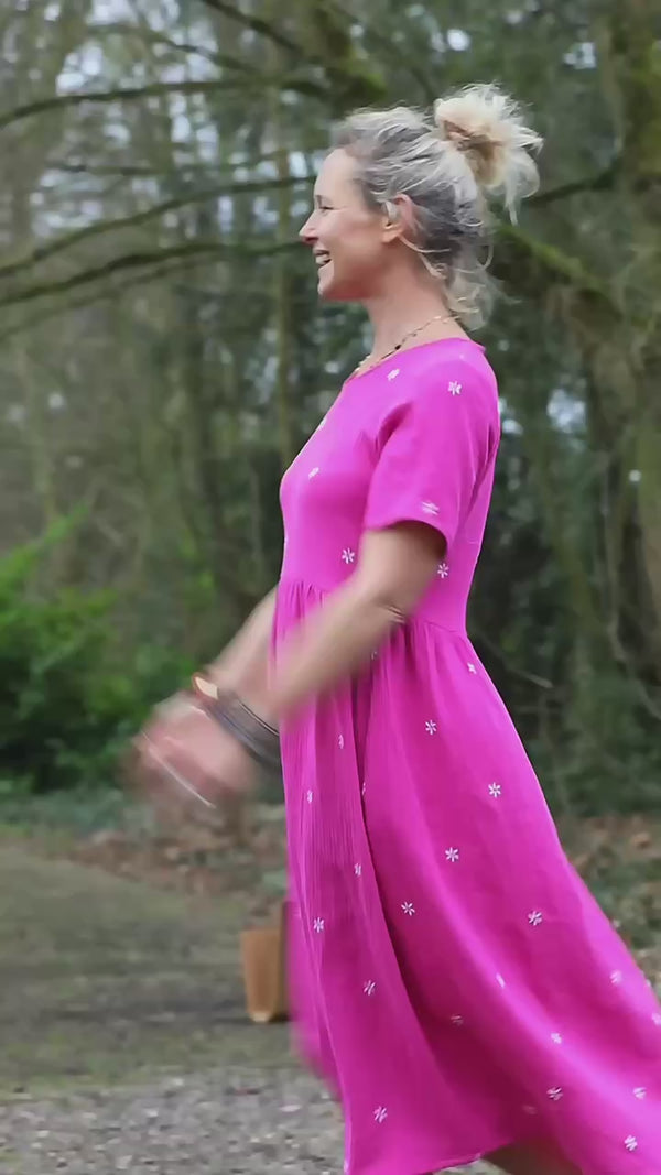 Robe Juliette - double gaze de coton fuchsia brodé