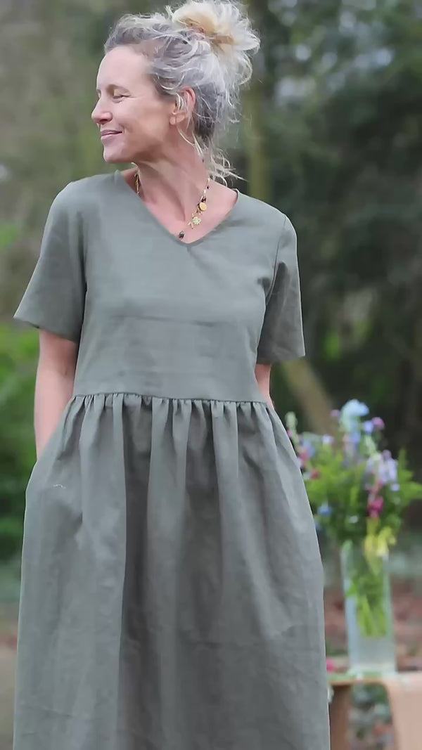 La robe Juliette se porte facilement avec des sandales en cuir naturel pour une allure estivale, des baskets pour un esprit casual ou des accessoires dorés pour réchauffer la teinte. Le kaki s’associe harmonieusement avec des tons écrus, camel ou noir.