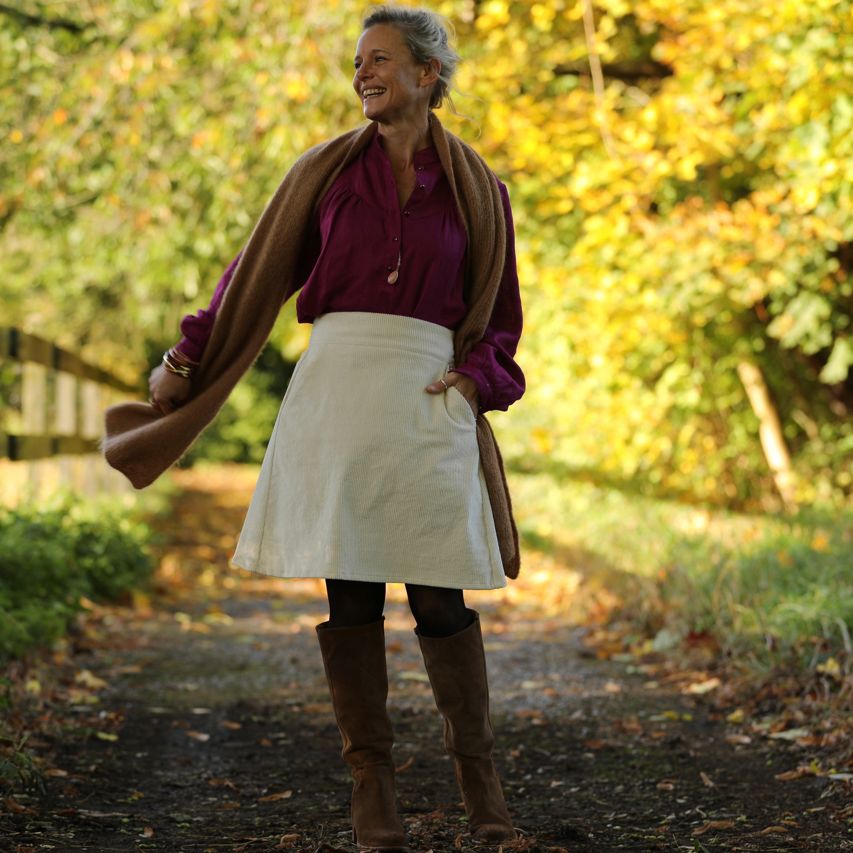 La jupe Maya en velours côtelé ivoire séduit par sa coupe trapèze élégante et intemporelle. Sa ceinture plate à l’avant et élastiquée au dos assurent un confort parfait et un tombé fluide qui met la silhouette en valeur avec naturel. Facile à enfiler, elle s’adapte à toutes les morphologies avec grâce.