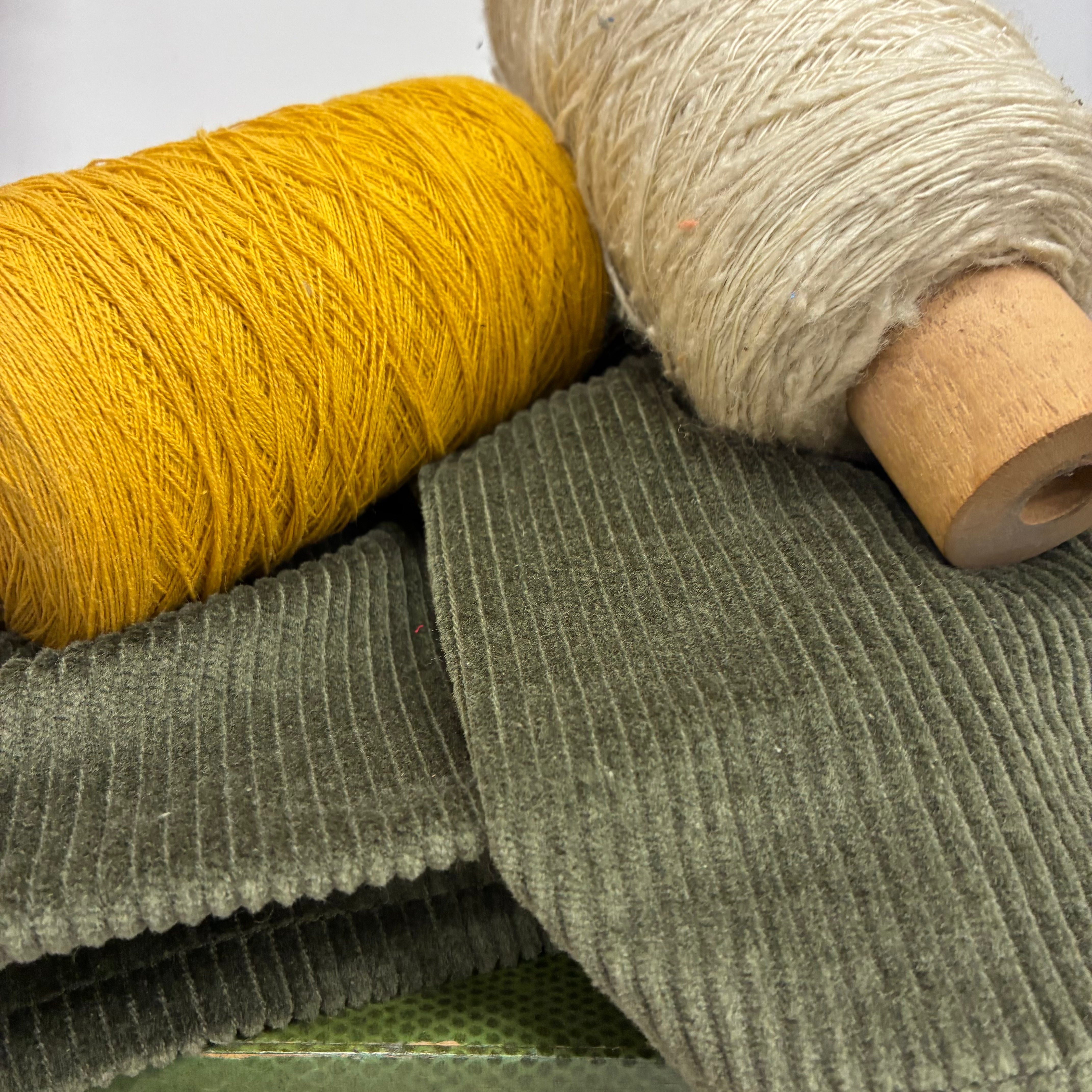 Velours côtelé kaki — 97 % coton, 3 % élasthanne.