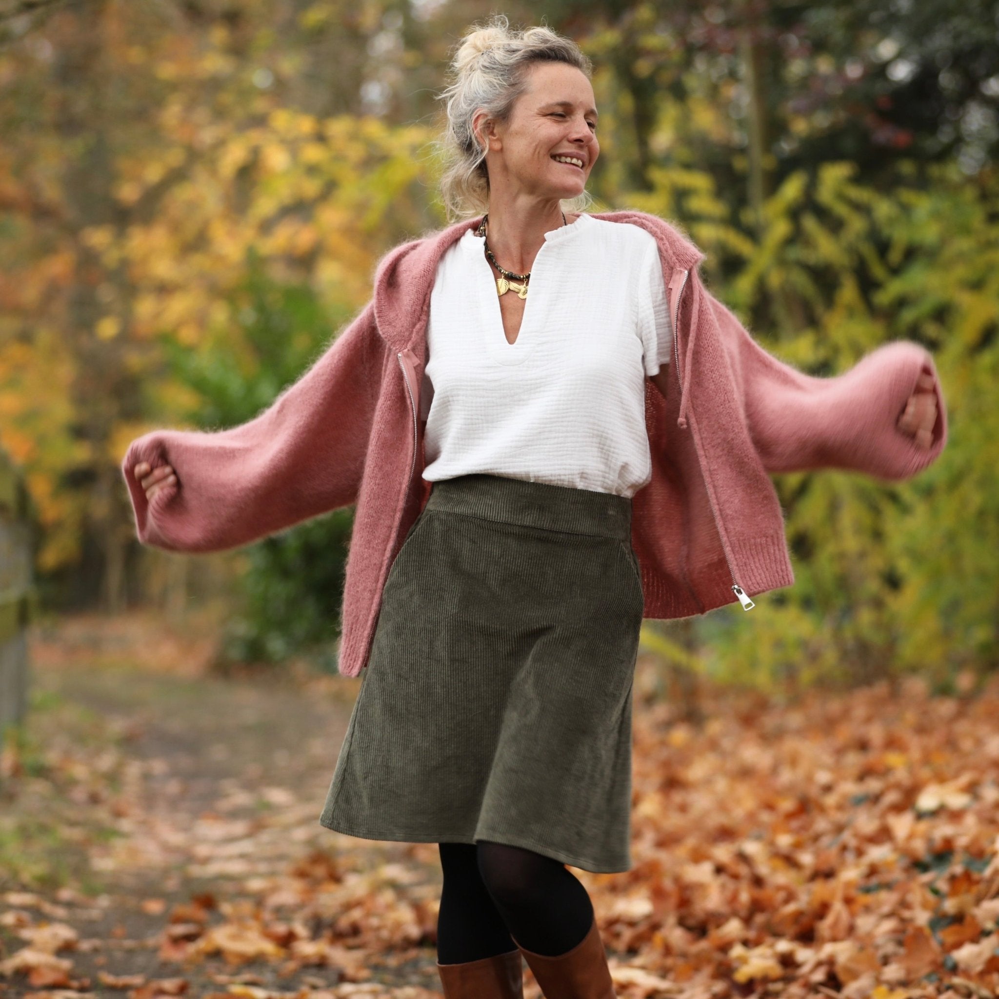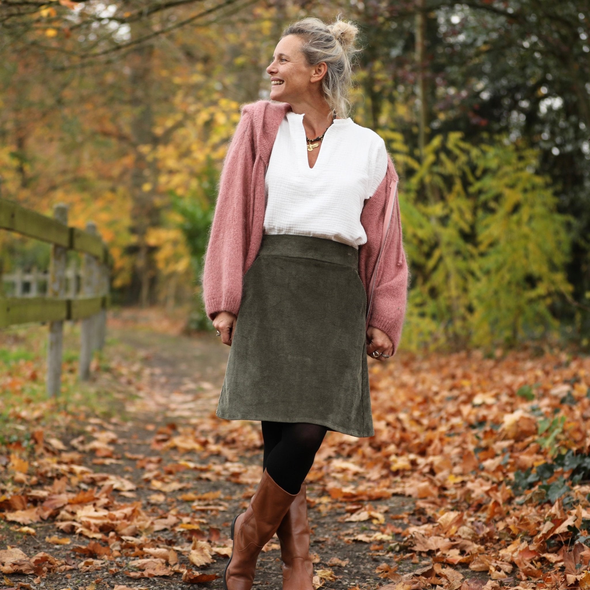 La jupe Maya en velours côtelé kaki séduit par sa coupe trapèze élégante et intemporelle. Sa ceinture plate à l’avant et élastiquée au dos assurent un confort parfait et un tombé fluide qui met la silhouette en valeur avec naturel. Facile à enfiler, elle s’adapte à toutes les morphologies avec grâce.