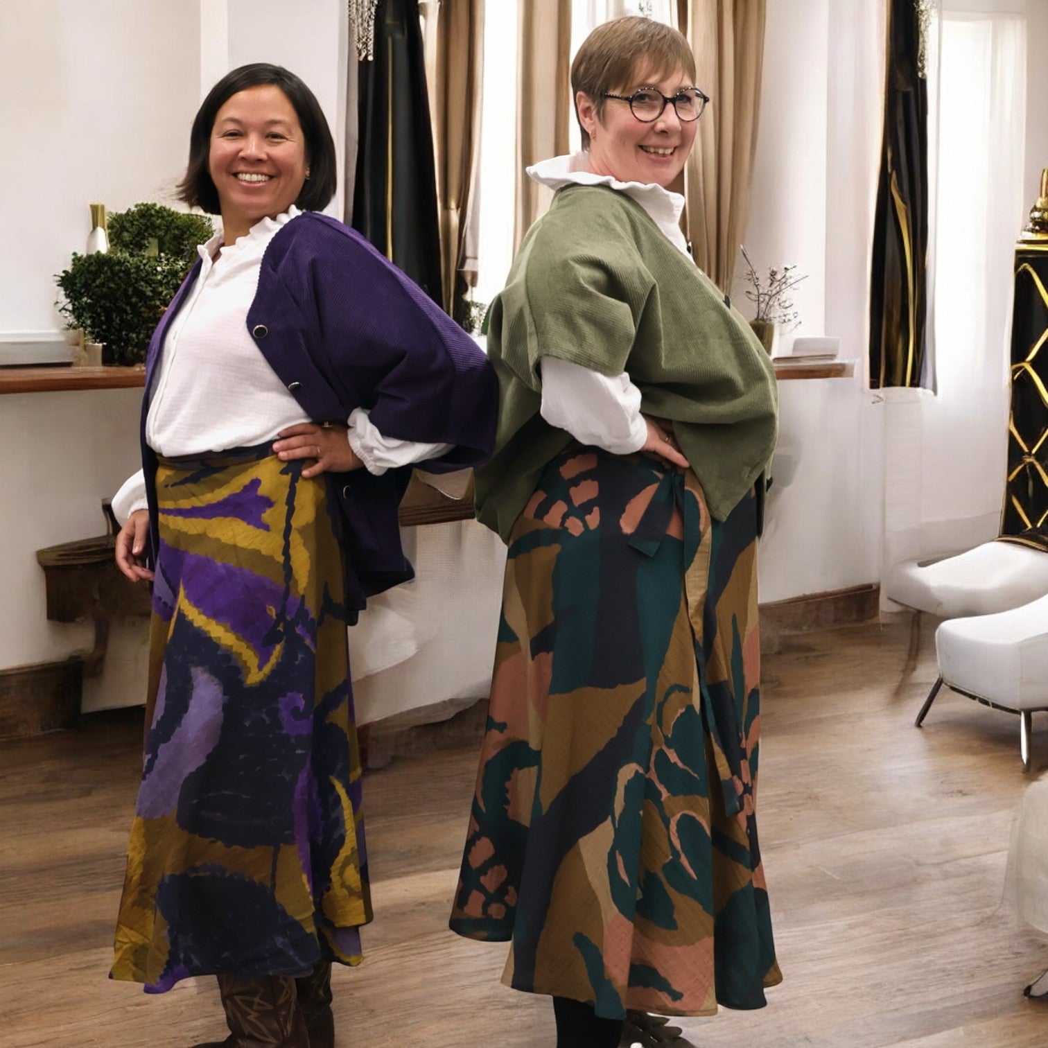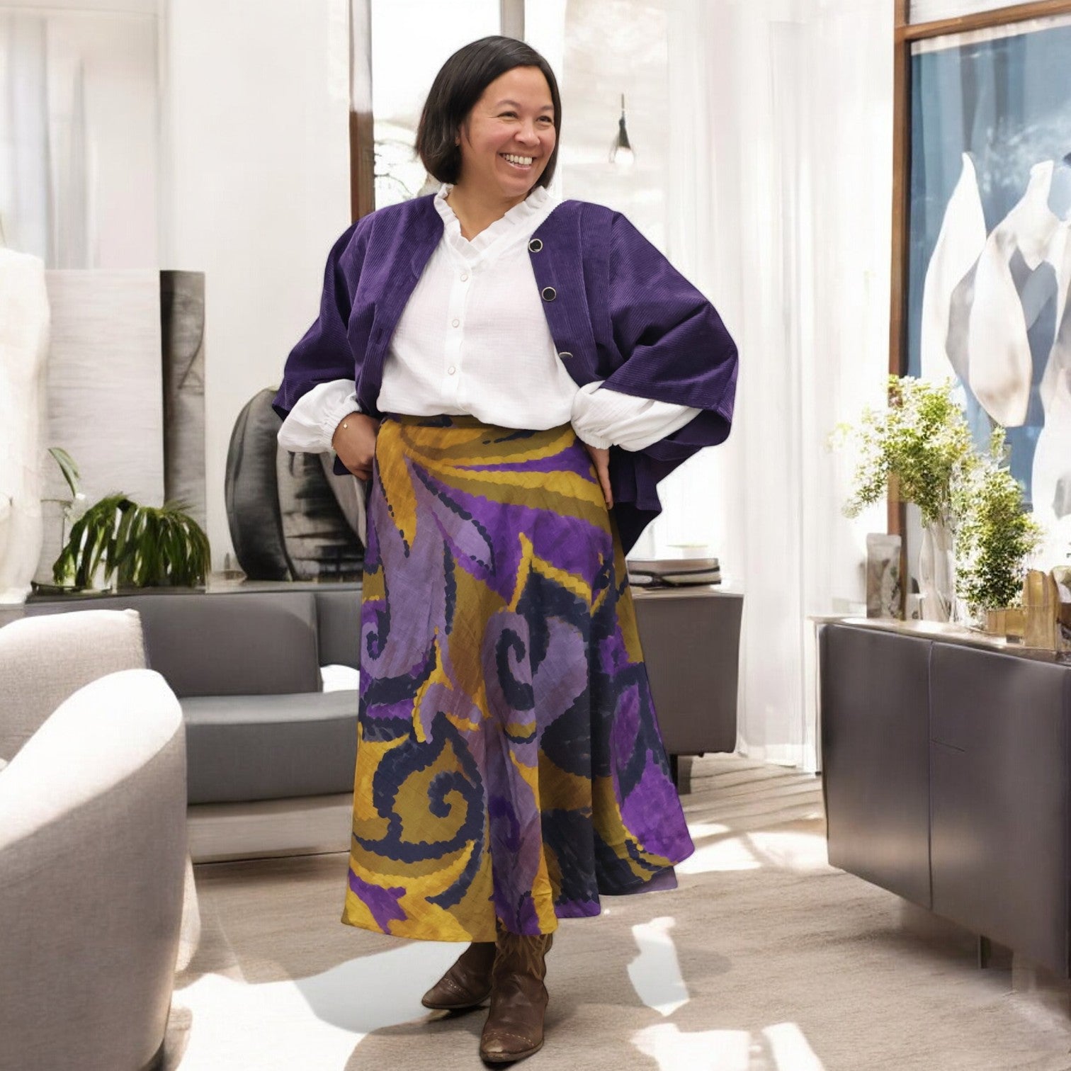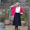 Voici Marie, une jupe portefeuille mi-longue au tombé ample et fluide.