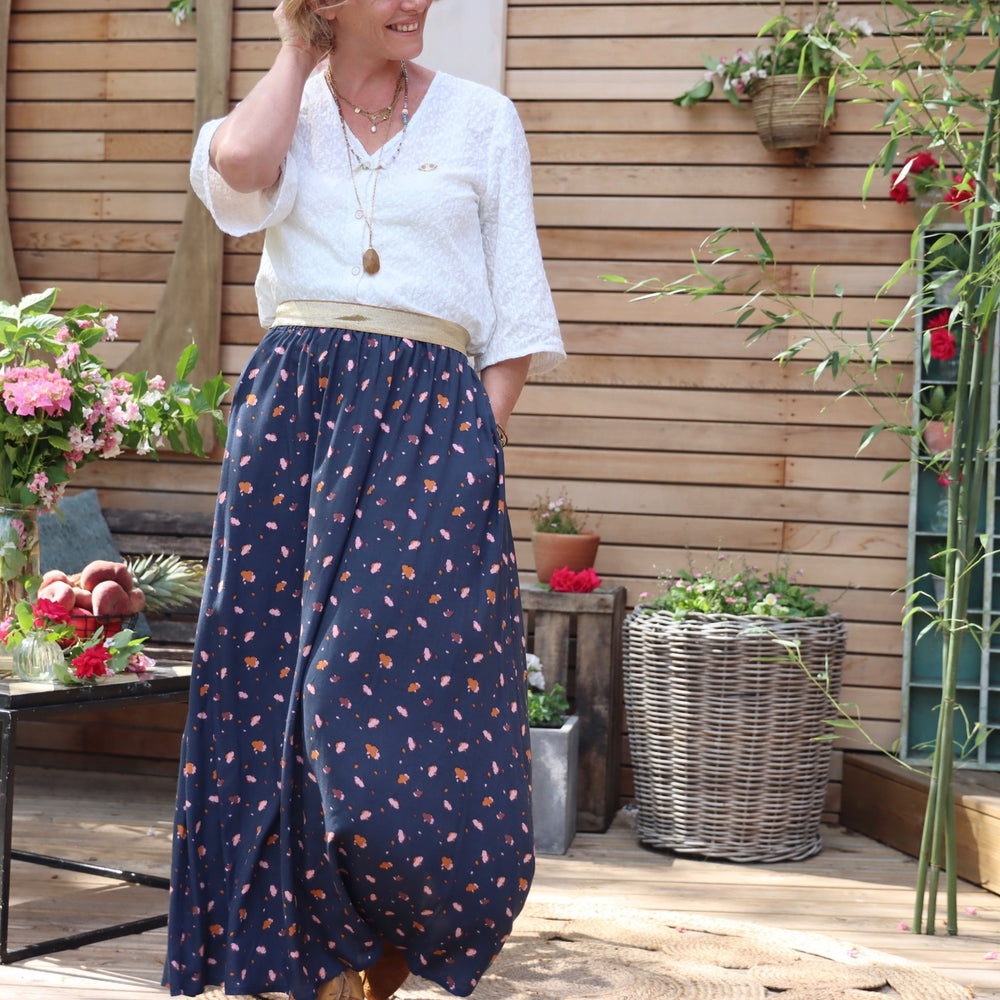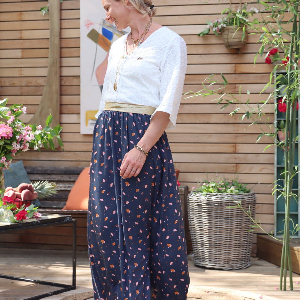 Voici Rachelle, notre jolie jupe élastiquée, longue et fluide.