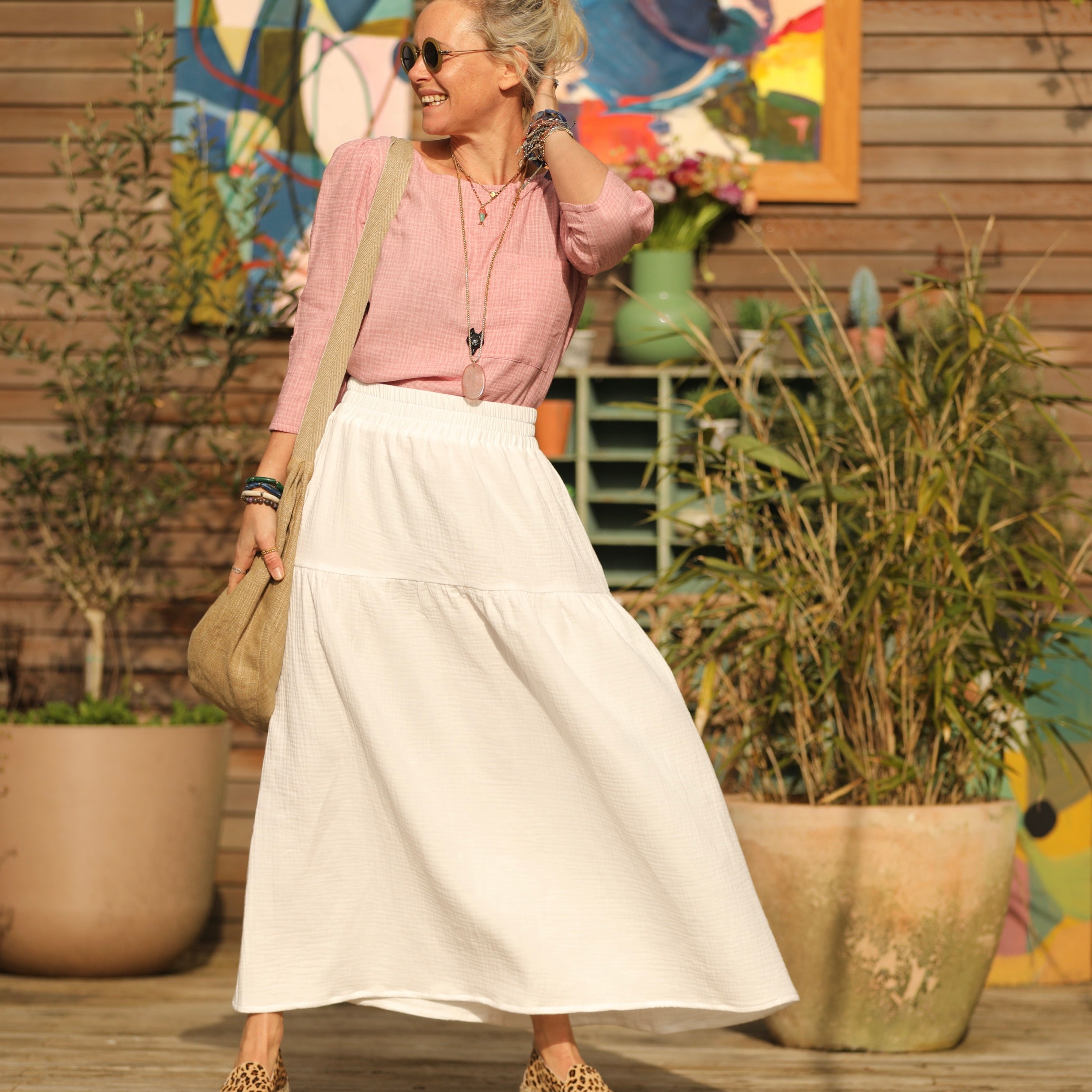 Sarah : une jupe à la ceinture élastiquée de 6 cm de large, agrémentée d’un jeu de volants et de fronces pour un style bohème.