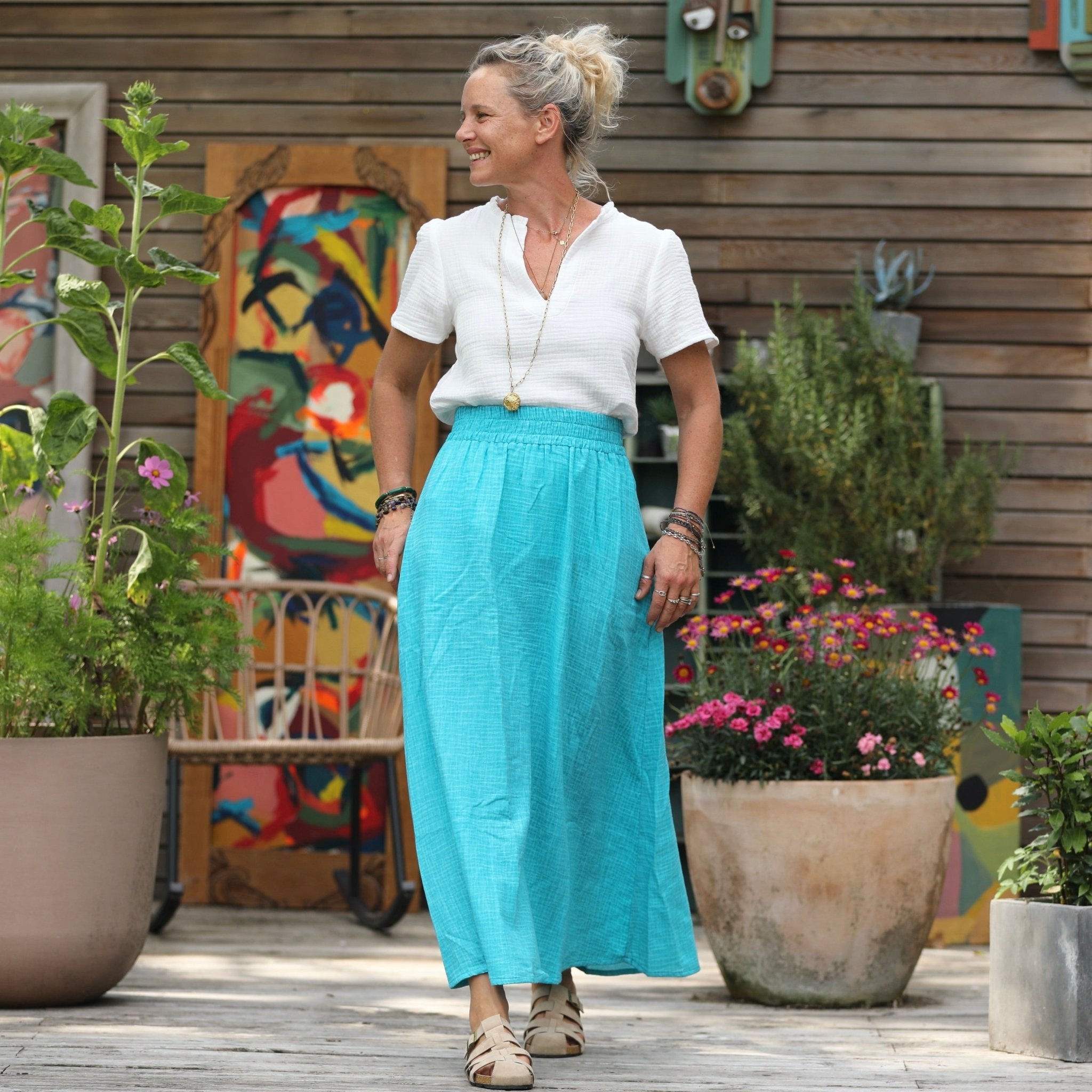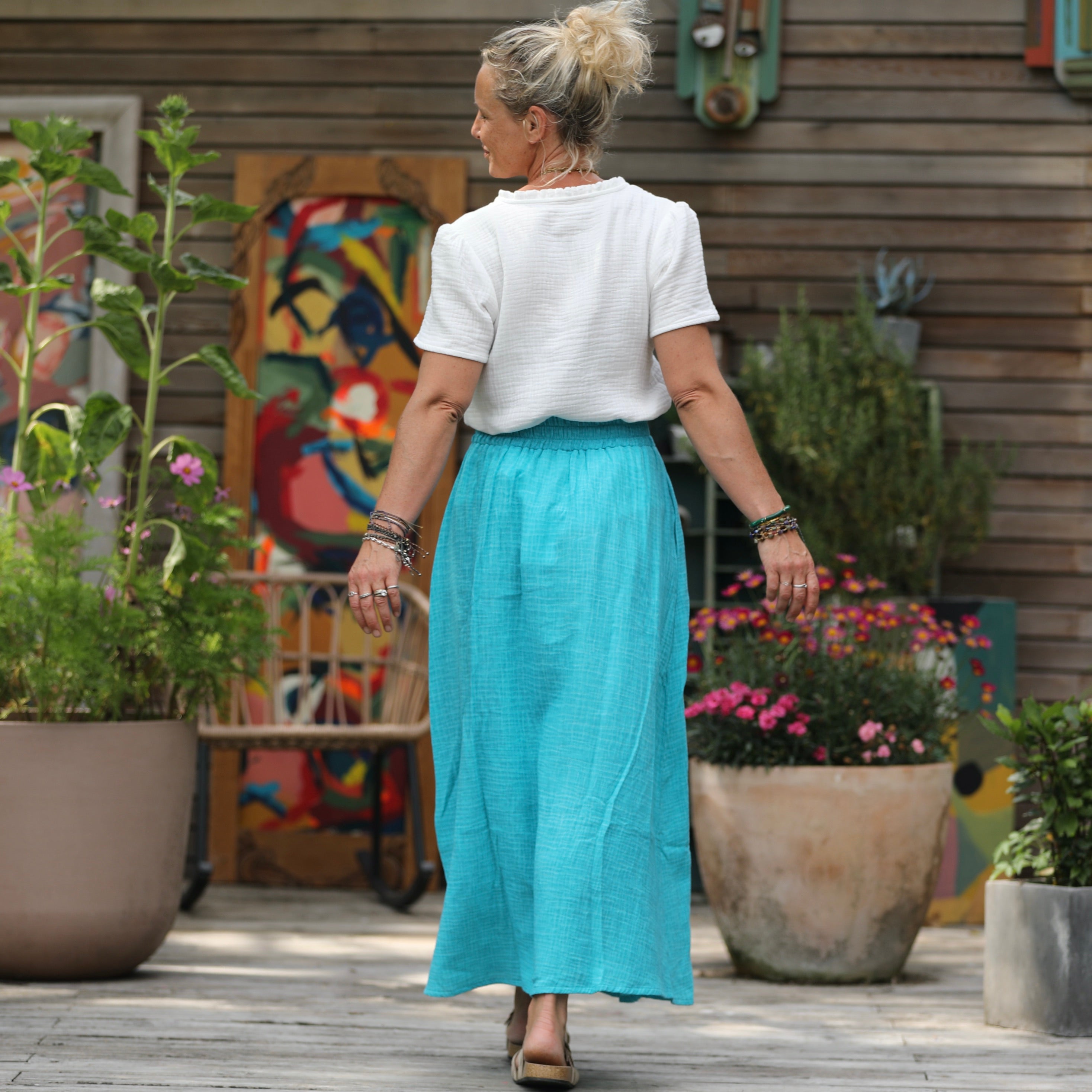 Jupe Tao double gaze de coton tie & dye turquoise - 92cm de hauteur
