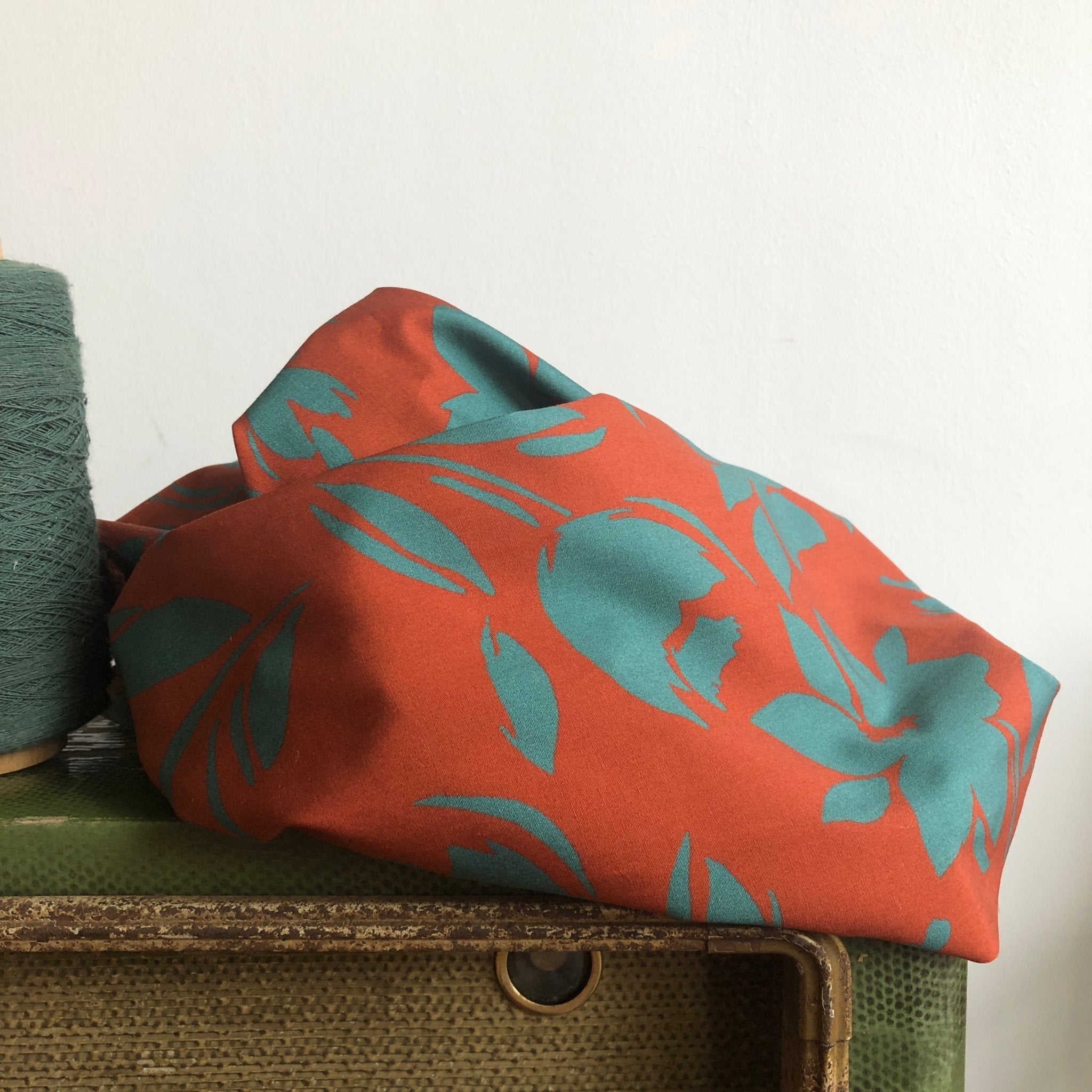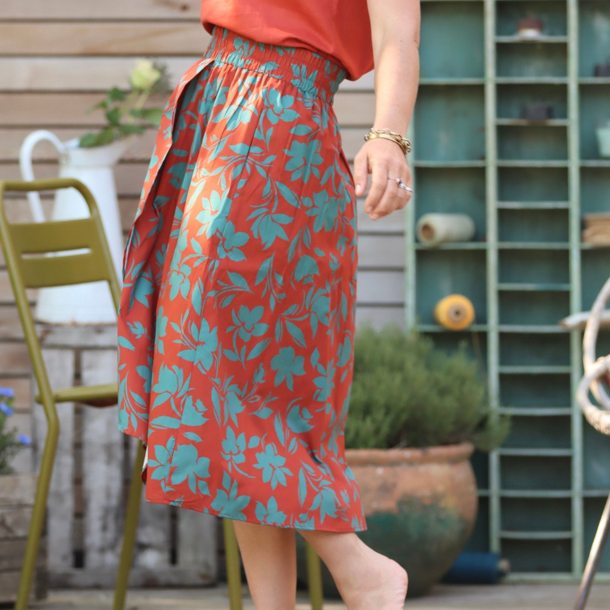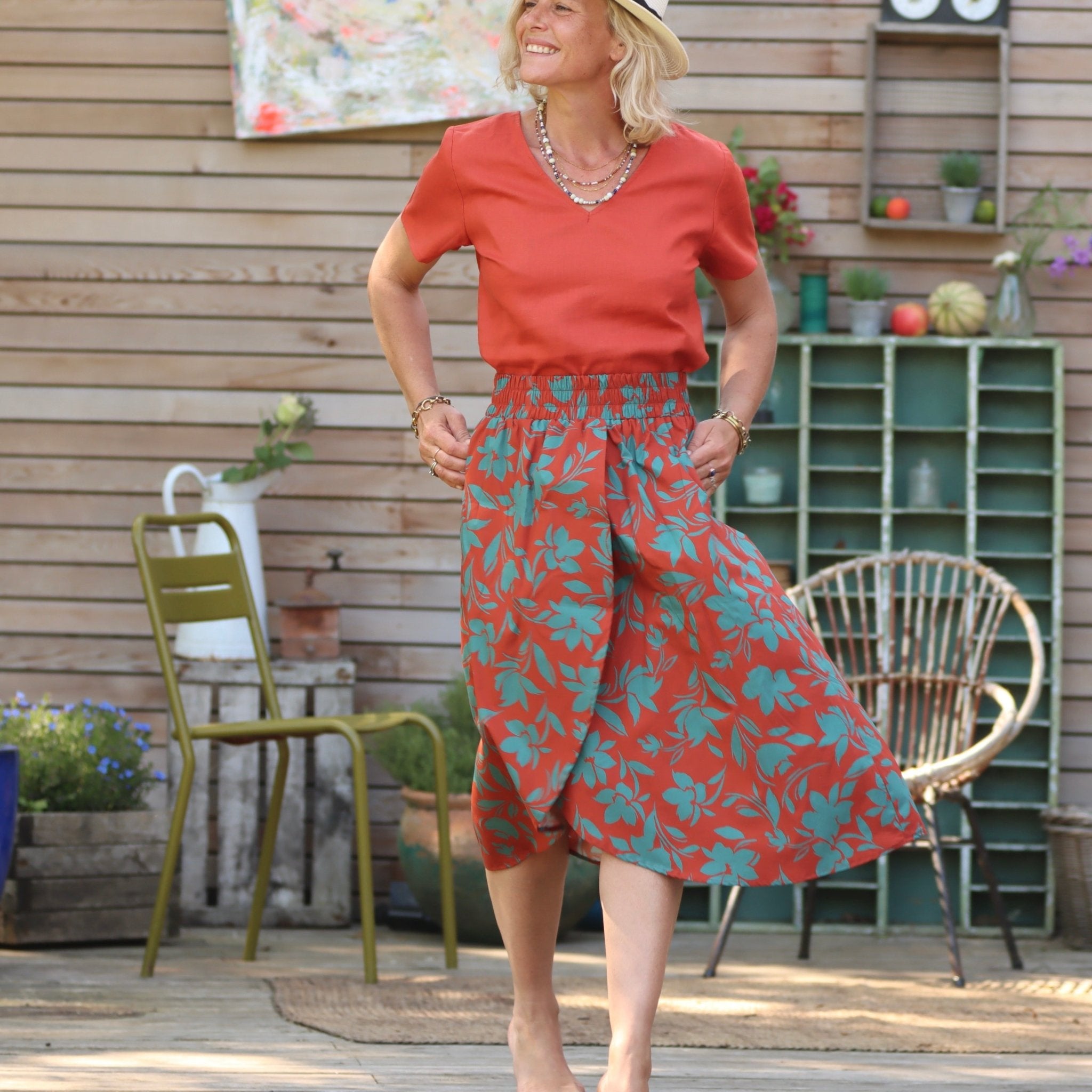 Jupe Tina popeline de coton terracotta fleuri aqua
