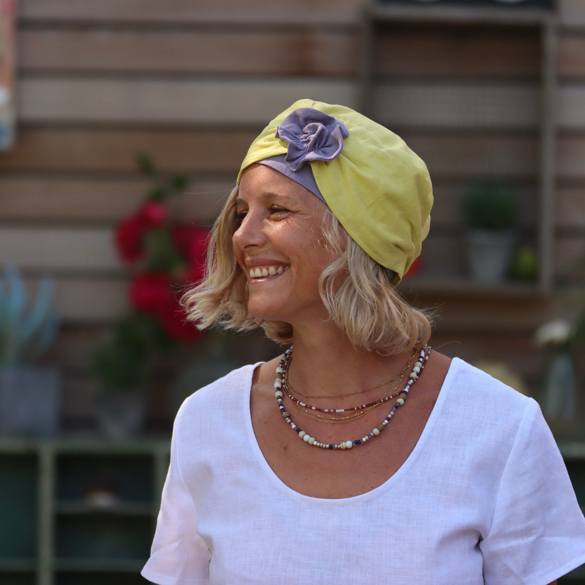 La coiffe Victoire lin jaune vif - fleur parme - Quintessence