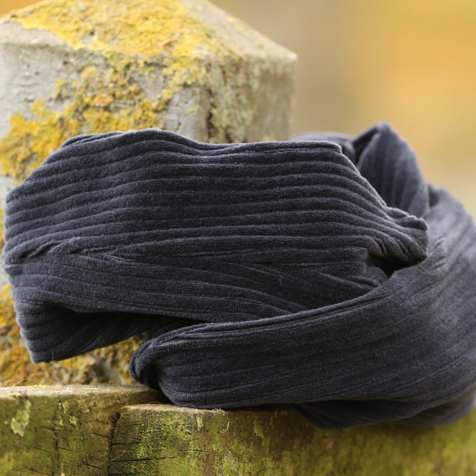 Velours côtelé bleu marine — 95 % polyester, 5 % lycra.