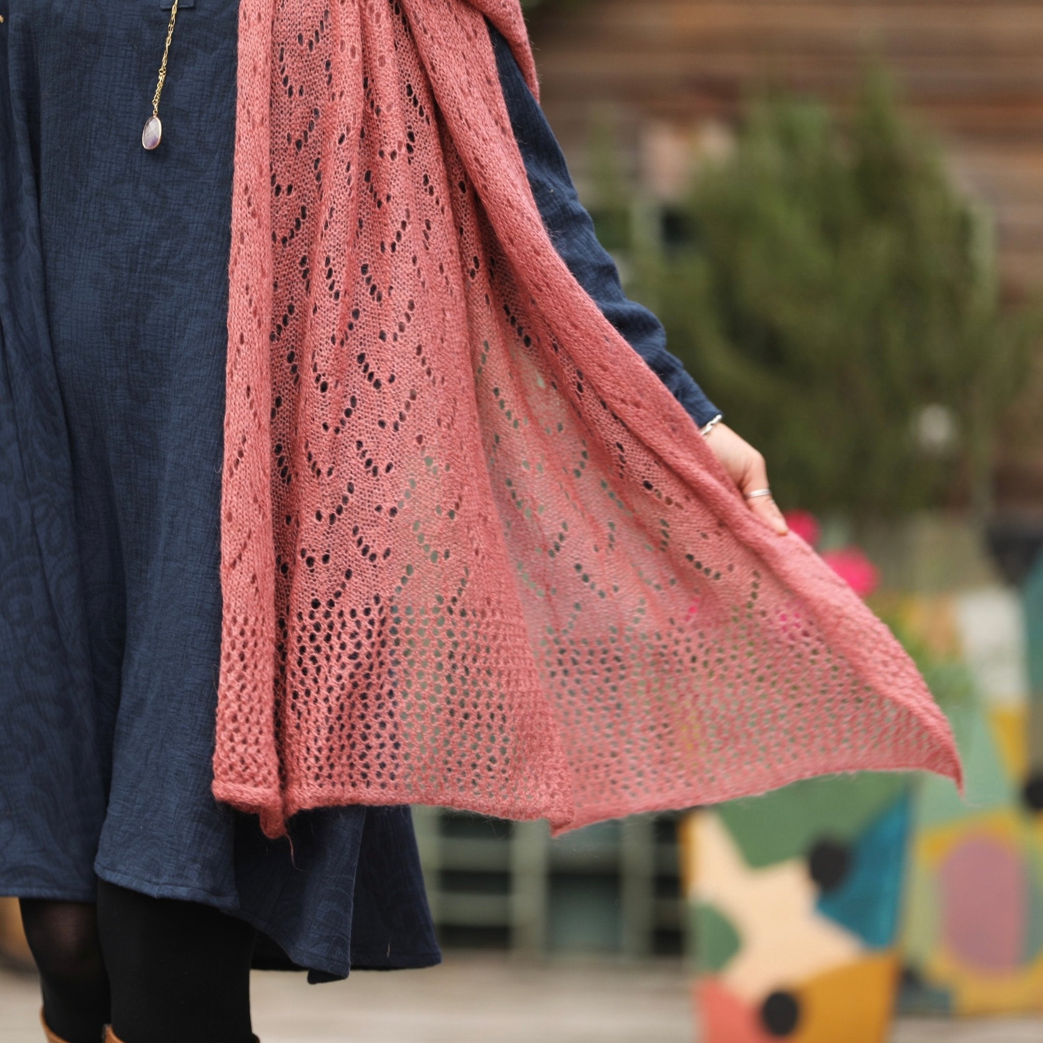 Maille ajourée rose boisé – 40 % acrylique, 30 % polyamide, 22 % mohair, 8 % laine.