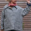 Kai est une veste au style japonais de type kimono, doublée en jean, ornée de boutons français émaillés entourés d'une tresse métallique dorée.