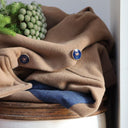 Kai est une veste au style japonais de type kimono, doublée en jean, ornée de boutons français émaillés entourés d'une tresse métallique dorée.