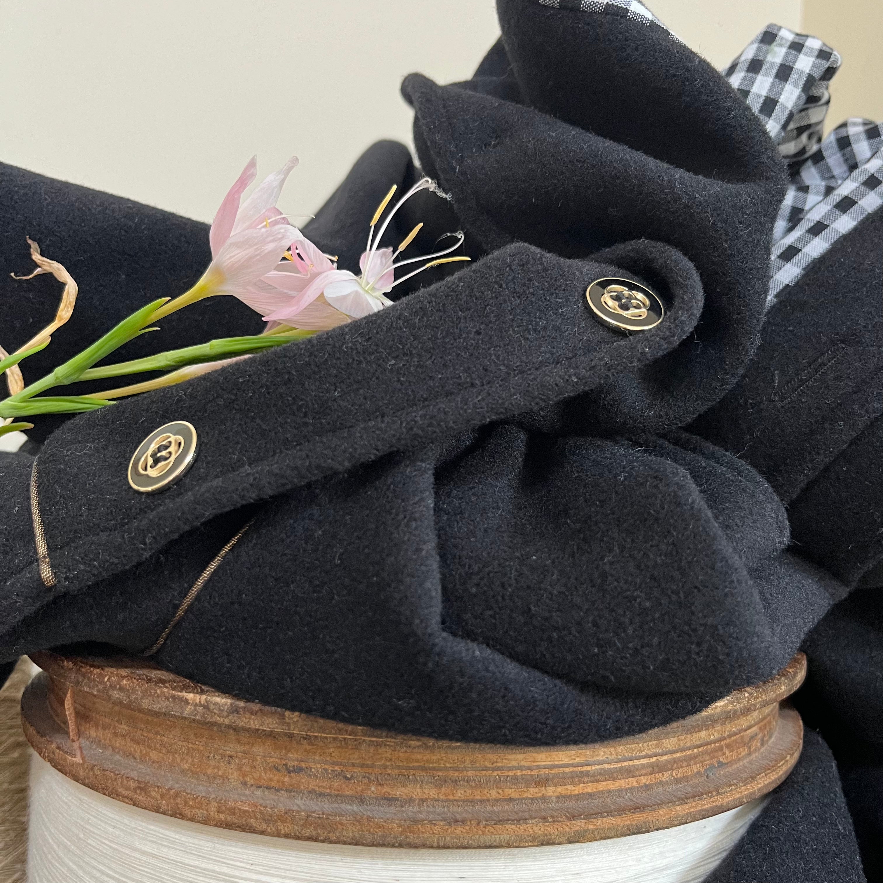 Composition : 70% laine, 20 % polyamide, 10 % cachemire. La doublure est vichy noir/blanc en coton.