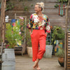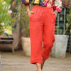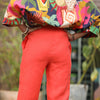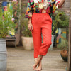 Baptiste est un pantalon élégant coupé en 7/8 avec des finitions en tulipe au bas et doté d'une ceinture élastique et des poches pratiques sur les côtés.