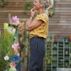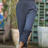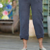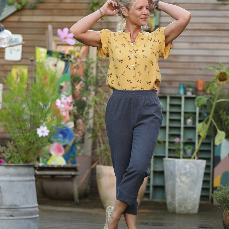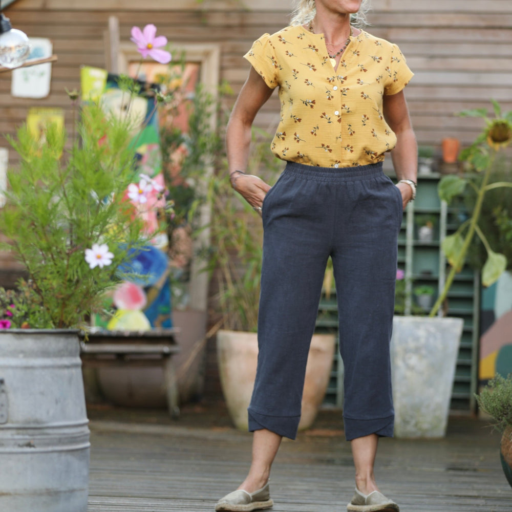 Baptiste est un pantalon élégant coupé en 7/8 avec des finitions en tulipe au bas et doté d'une ceinture élastique et des poches pratiques sur les côtés.
