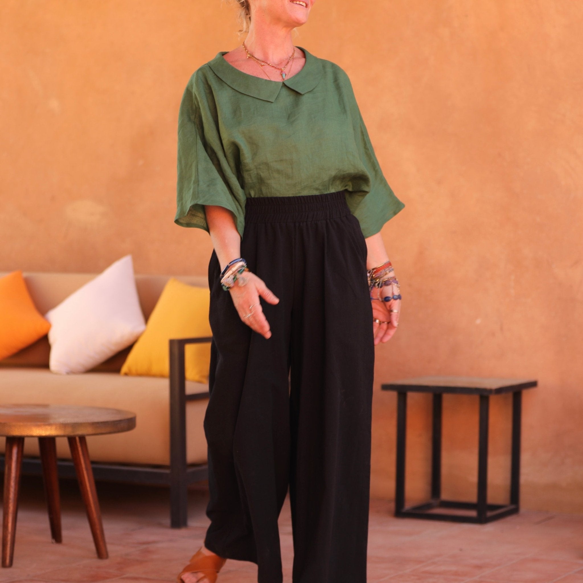 Lazare est un pantalon large doté d'une ceinture entièrement élastiquée, de poches latérales et de belles poches hautes au dos.