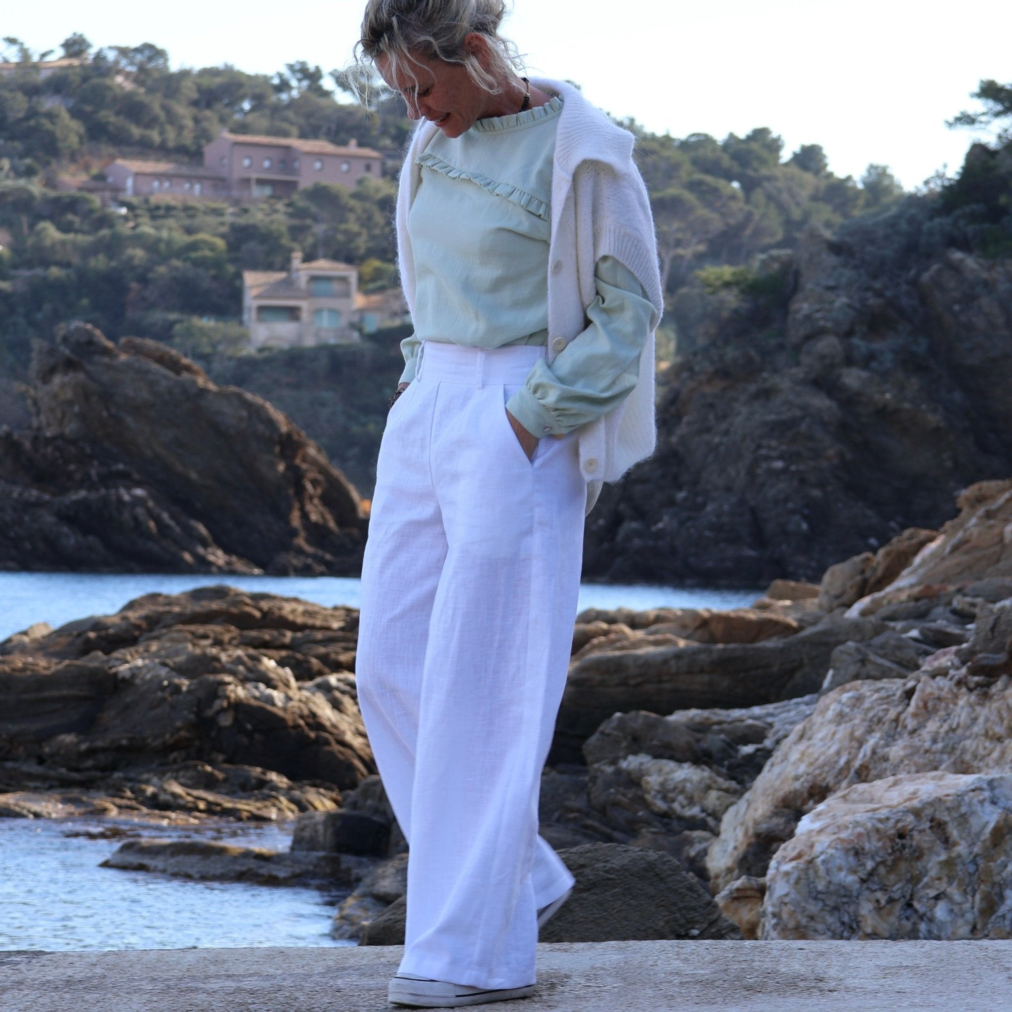 Tom, avec ses jambes larges, ses pinces piqués à la taille et son dos élastiqué, c'est un pantalon chic et  confort.