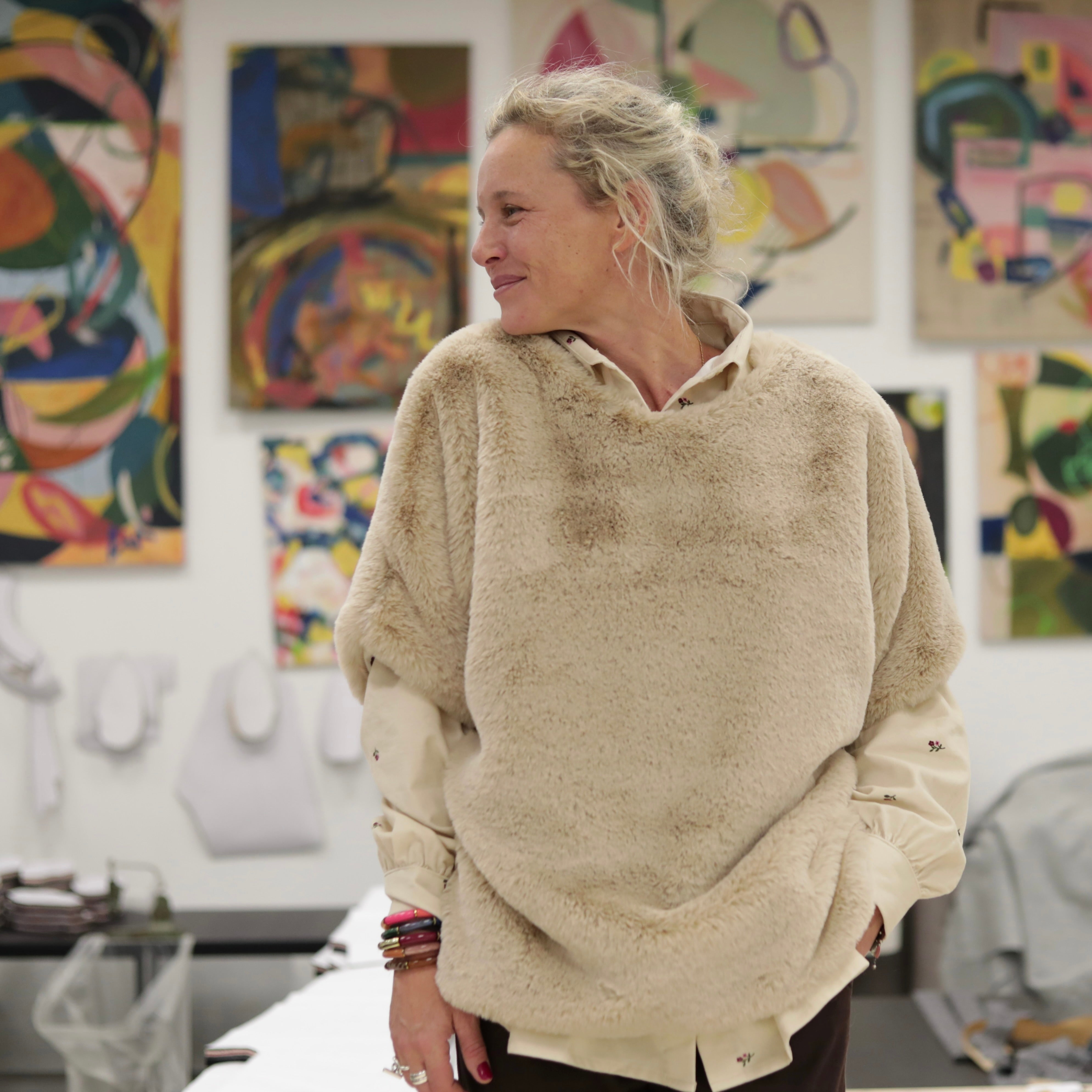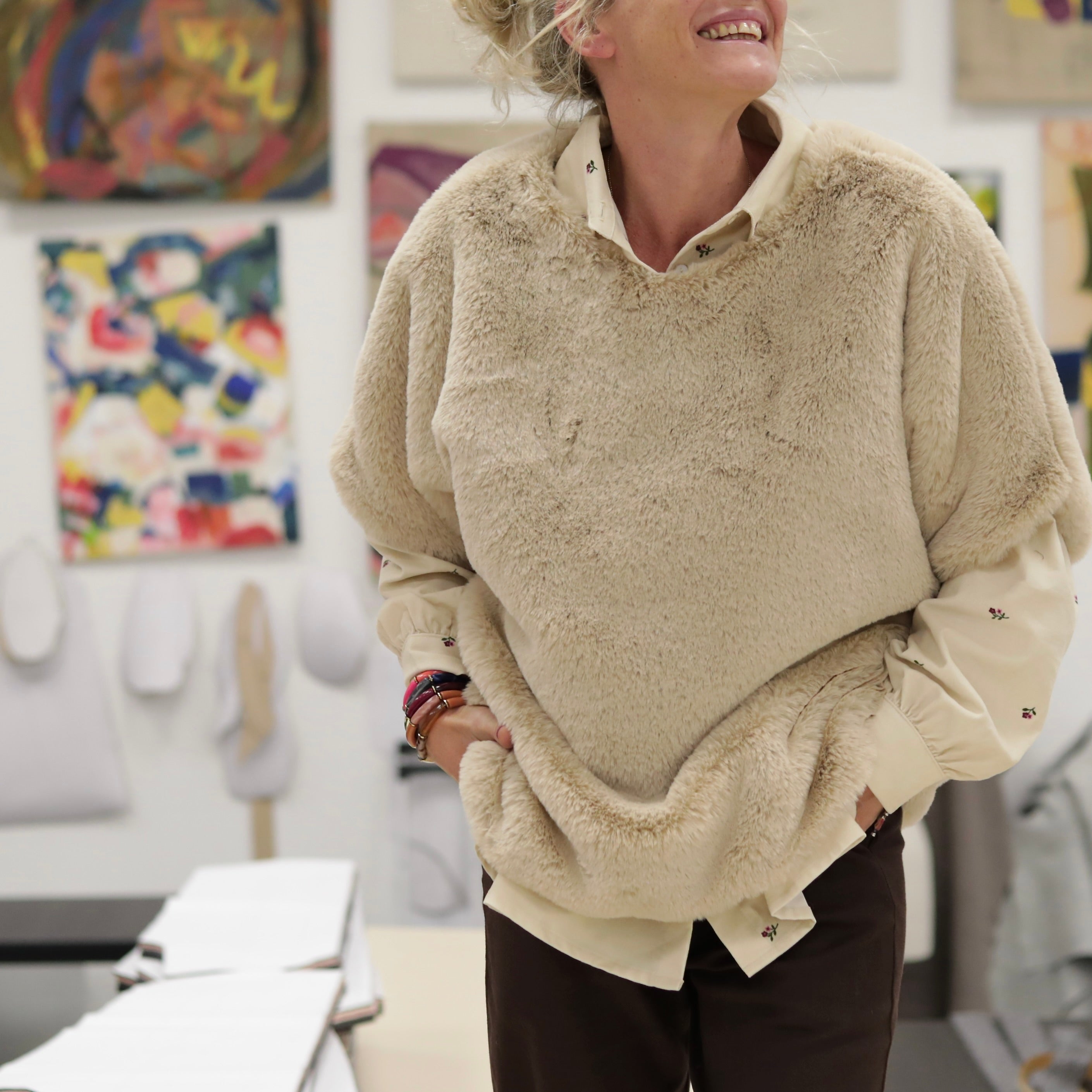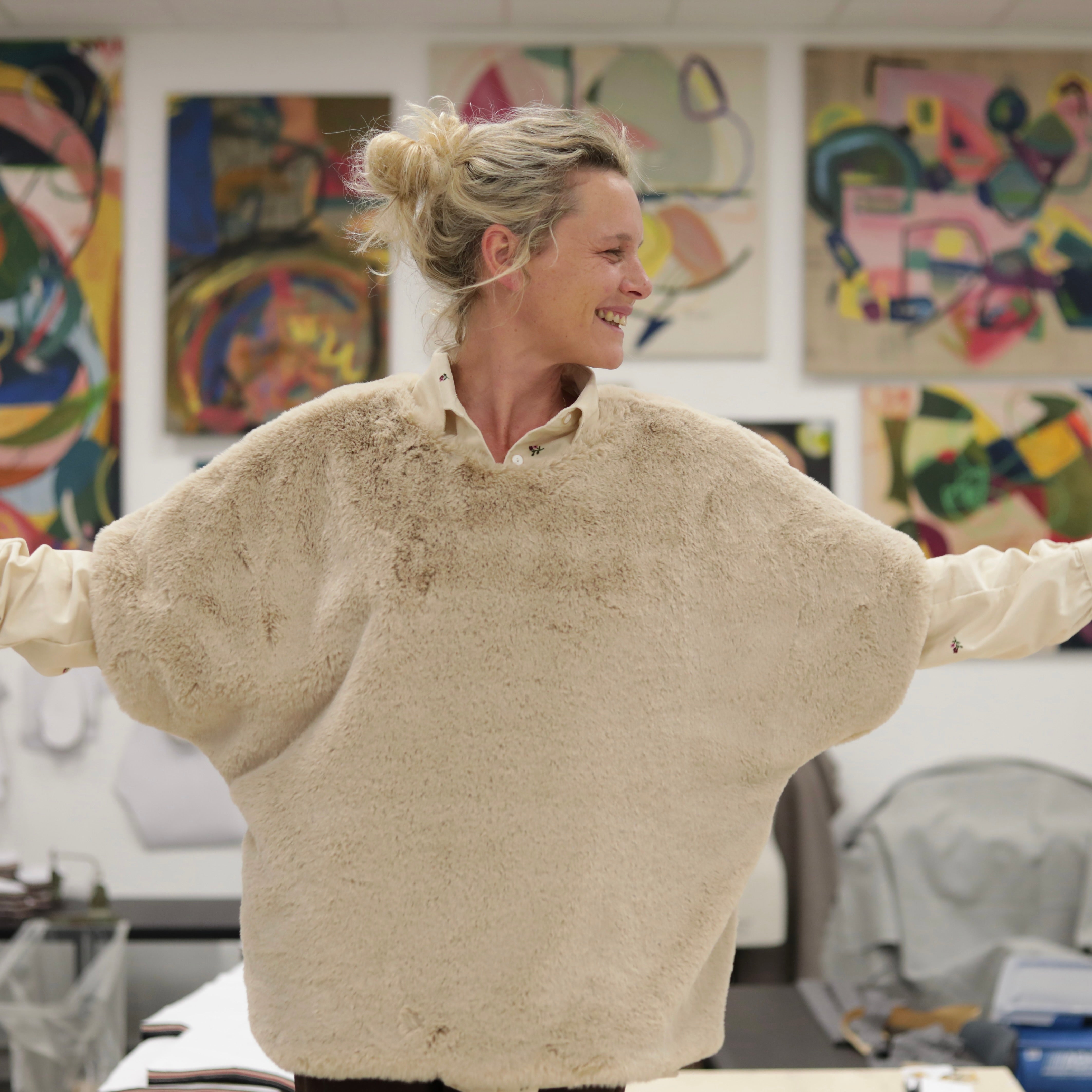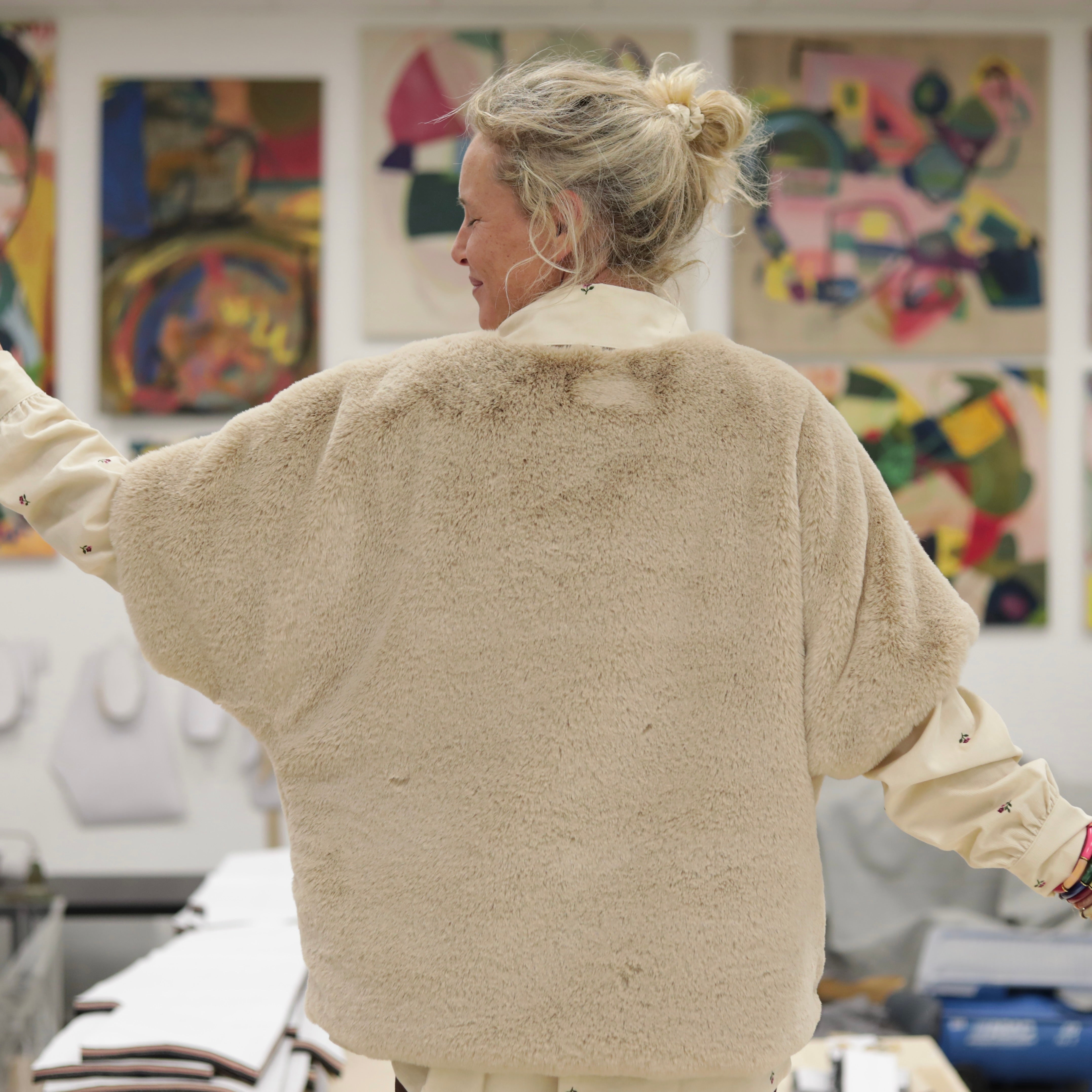 Confectionné dans une fausse fourrure ficelle au toucher moelleux, doux et chaleureux, ce tissu enveloppe la silhouette avec un tombé cocoon. Le tissu est ennobli en France, dans les Hauts-de-France, au sein d’un atelier reconnu pour son savoir-faire.