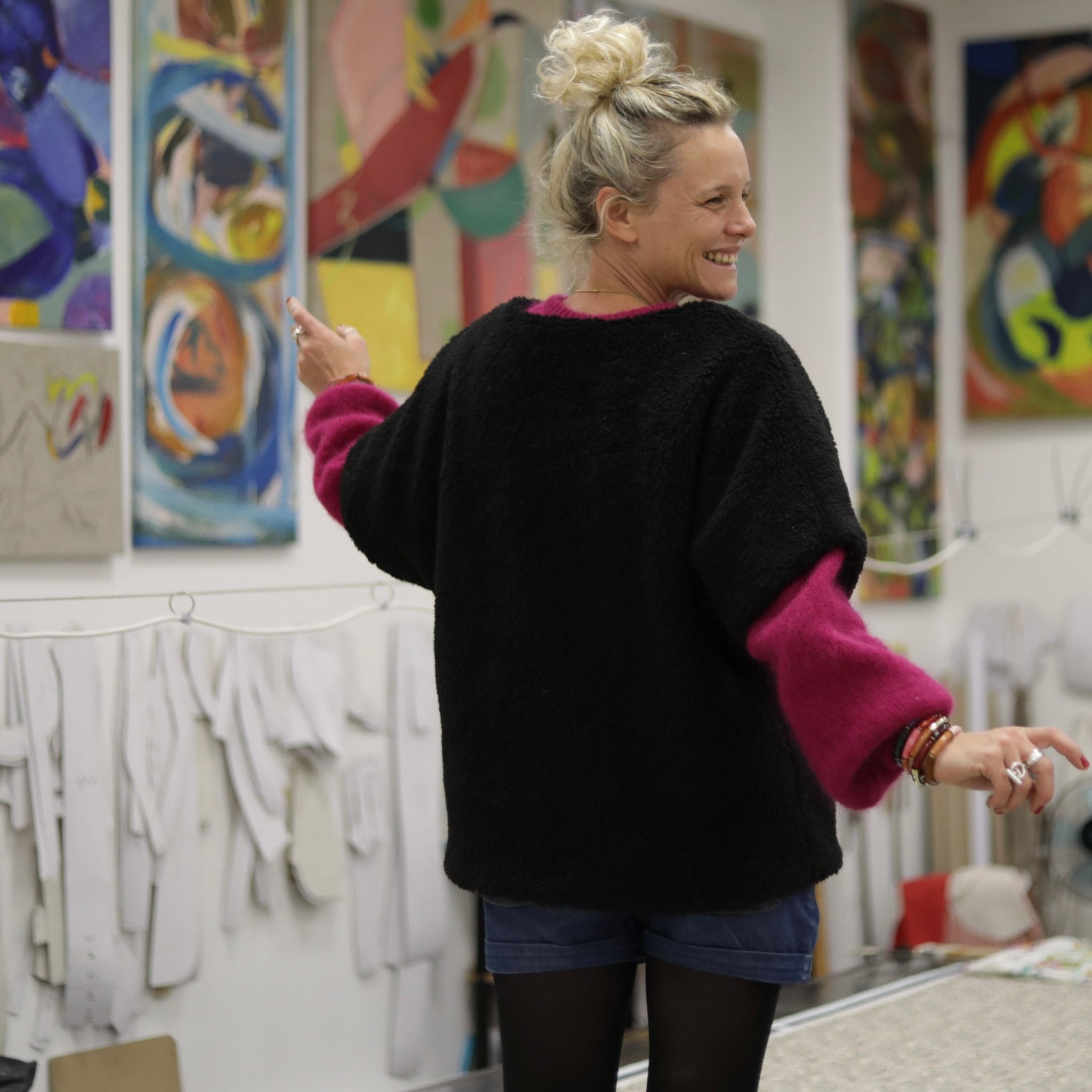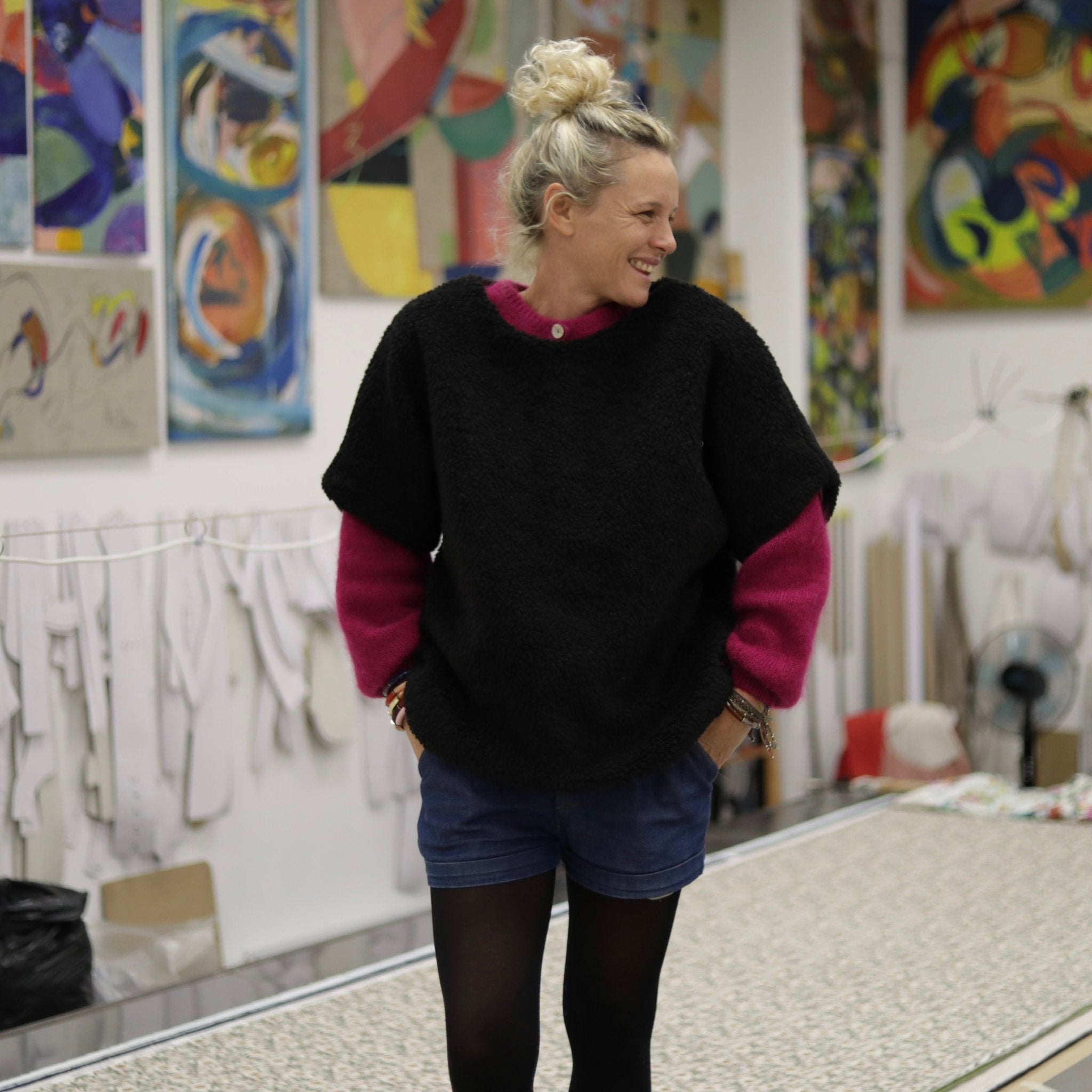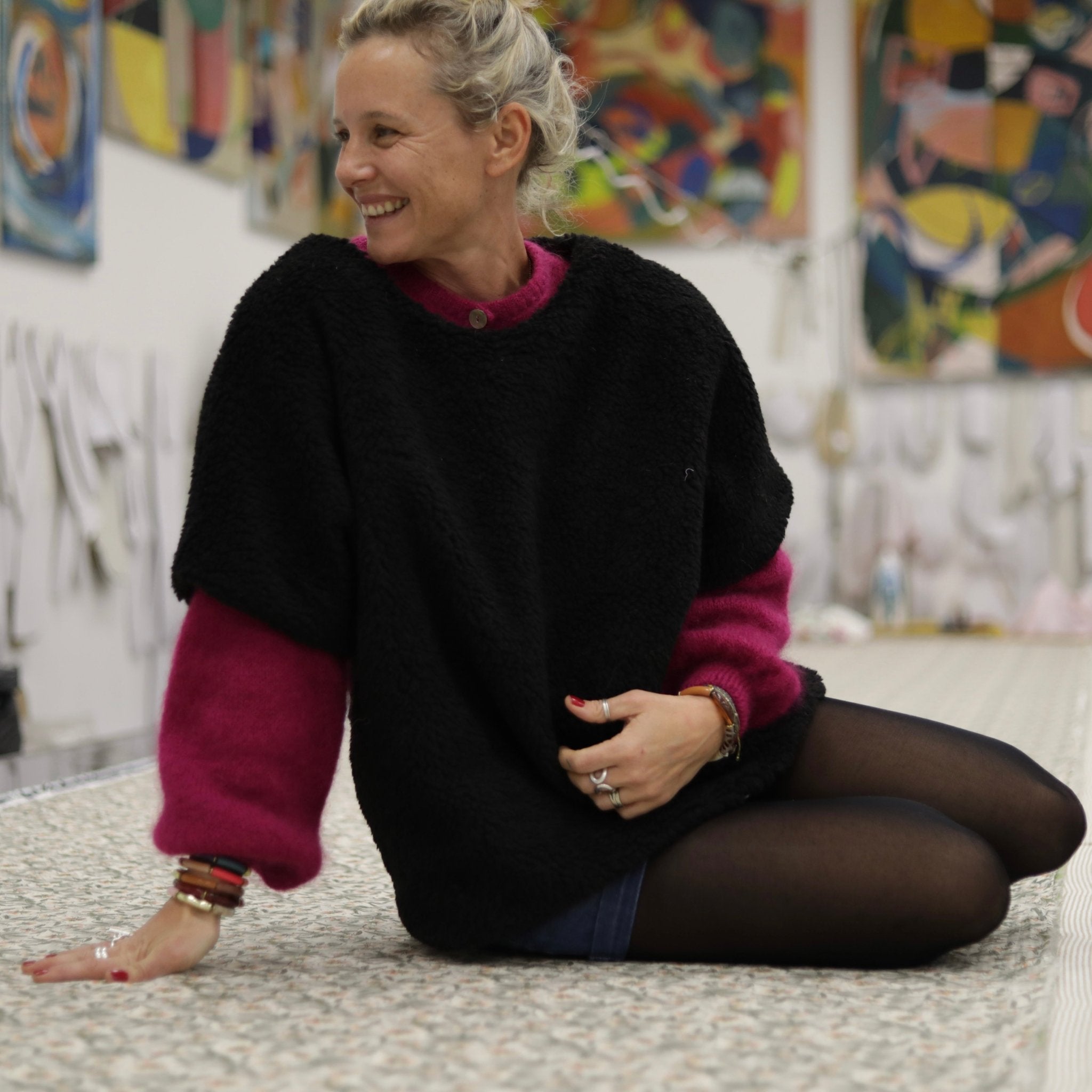 Confectionné dans un Sherpa noir, ce tissu présente un toucher moelleux, dense et chaleureux. Il offre une esthétique chic et affirmée, tout en conservant un tombé cocoon idéal pour la saison froide. Le tissu est ennobli en France dans un atelier reconnu pour son expertise textile.