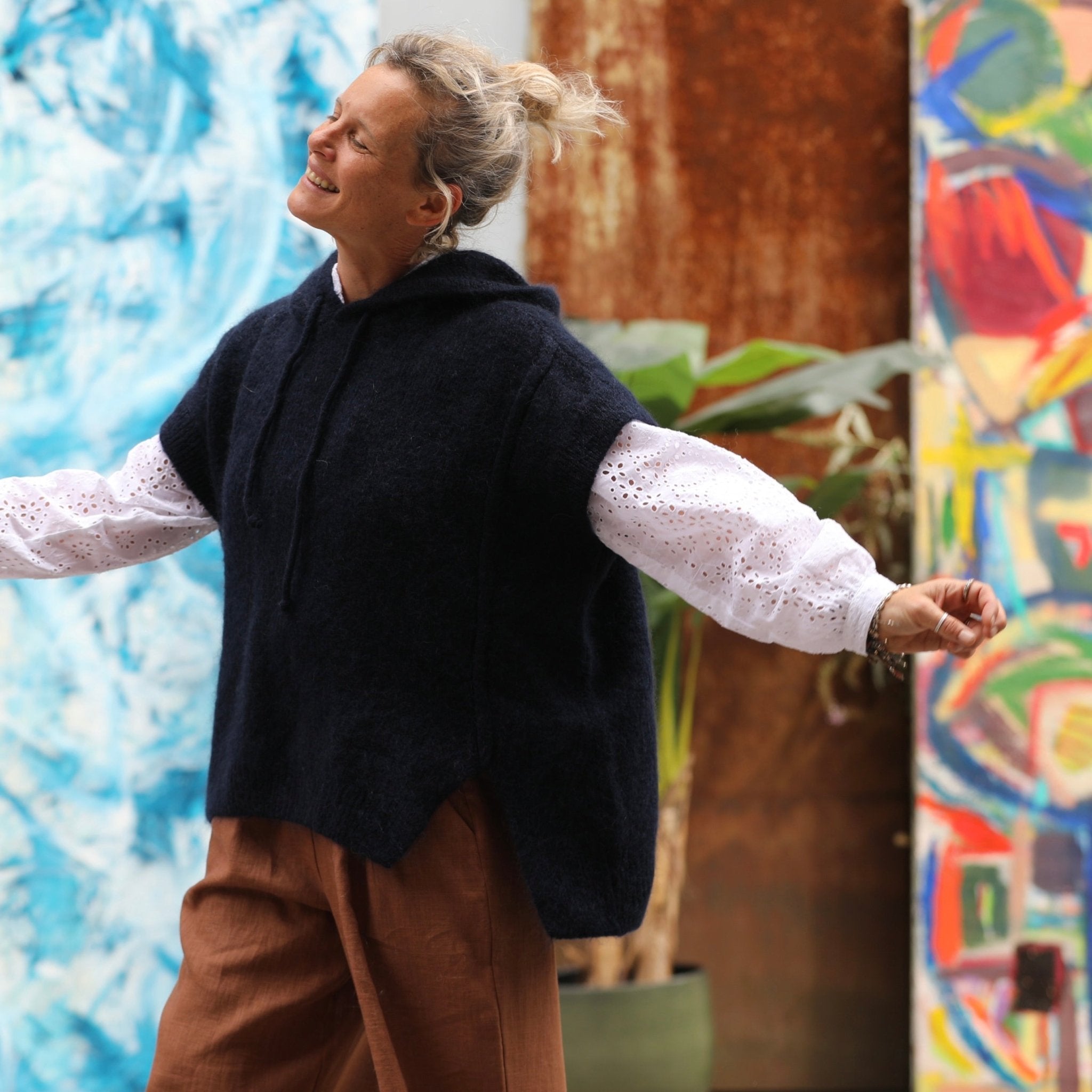 Calypso est un pull ample sans manches au style enveloppant, enrichi d’une capuche dotée d’un lien tricoté ton sur ton.