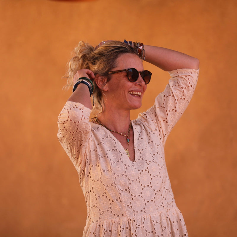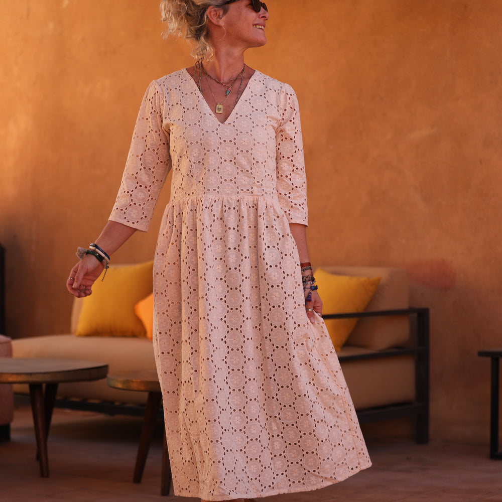 Anastasia est une robe brodée ajourée, entièrement doublée à l’exception des manches.