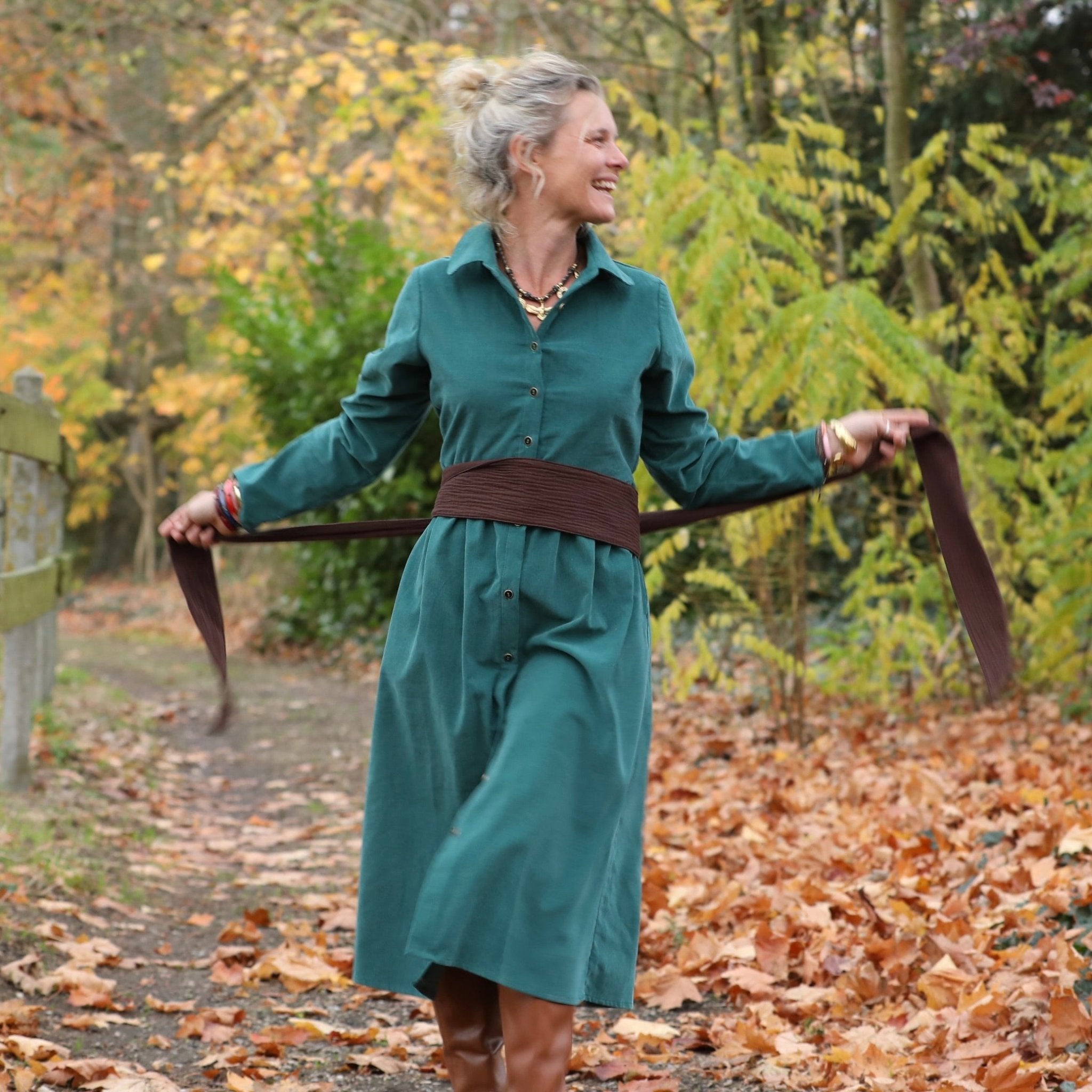 La robe Arlène révèle une silhouette fluide et gracieuse : le col est tout en rondeur, apportant une délicate douceur. À l’avant, une ouverture intégrale par boutons français dessine une courbe élégante, tandis qu’au dos une courbe subtile est soulignée par des fronces à la taille, pour une mise en valeur raffinée. Deux poches latérales complètent la ligne avec fonctionnalité.