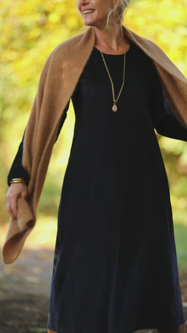 La robe Armande charme par sa coupe trapèze fluide et son élégante simplicité. Son col rond souligne le port de tête avec délicatesse, tandis que sa ligne épurée offre un tombé harmonieux et confortable. Une pièce facile à enfiler, à la fois décontractée et féminine, parfaite pour le quotidien.