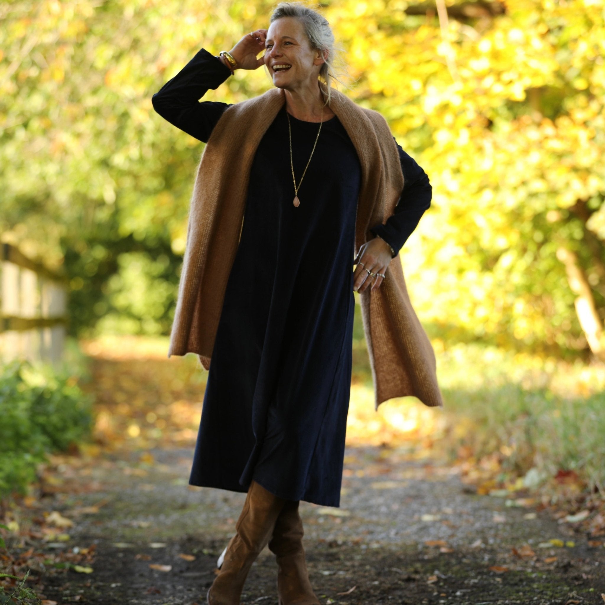 Réalisée dans un velours côtelé marine d’une grande douceur, cette robe allie chaleur et raffinement. Ses finitions soignées mettent en valeur le travail précis de notre atelier. Portée seule, avec une maille moelleuse ou un gilet ample, elle traverse les saisons avec élégance.
