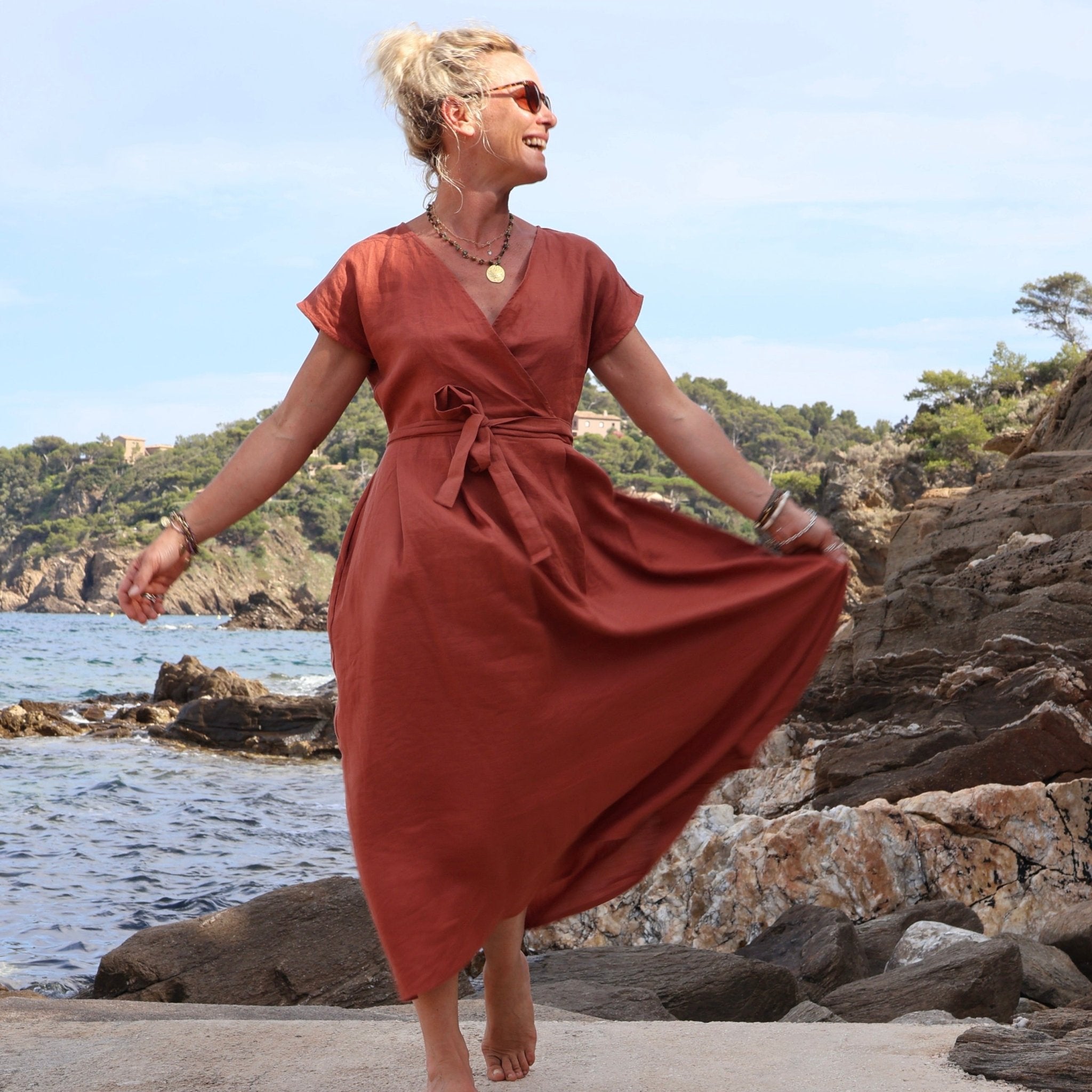 Athéna est une robe élégante avec un décolleté cache-cœur et une découpe sous la poitrine.