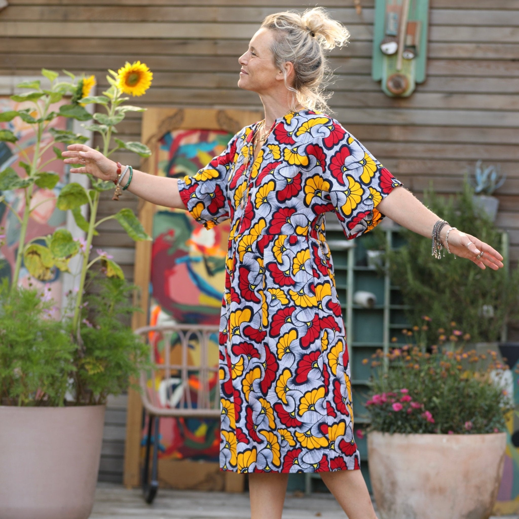 Capucine, une robe légère à la coupe kimono, dotée d’un décolleté V discret, d’une taille froncée subtile, de deux poches invisibles sur les côtés et d’une élégante longueur midi.