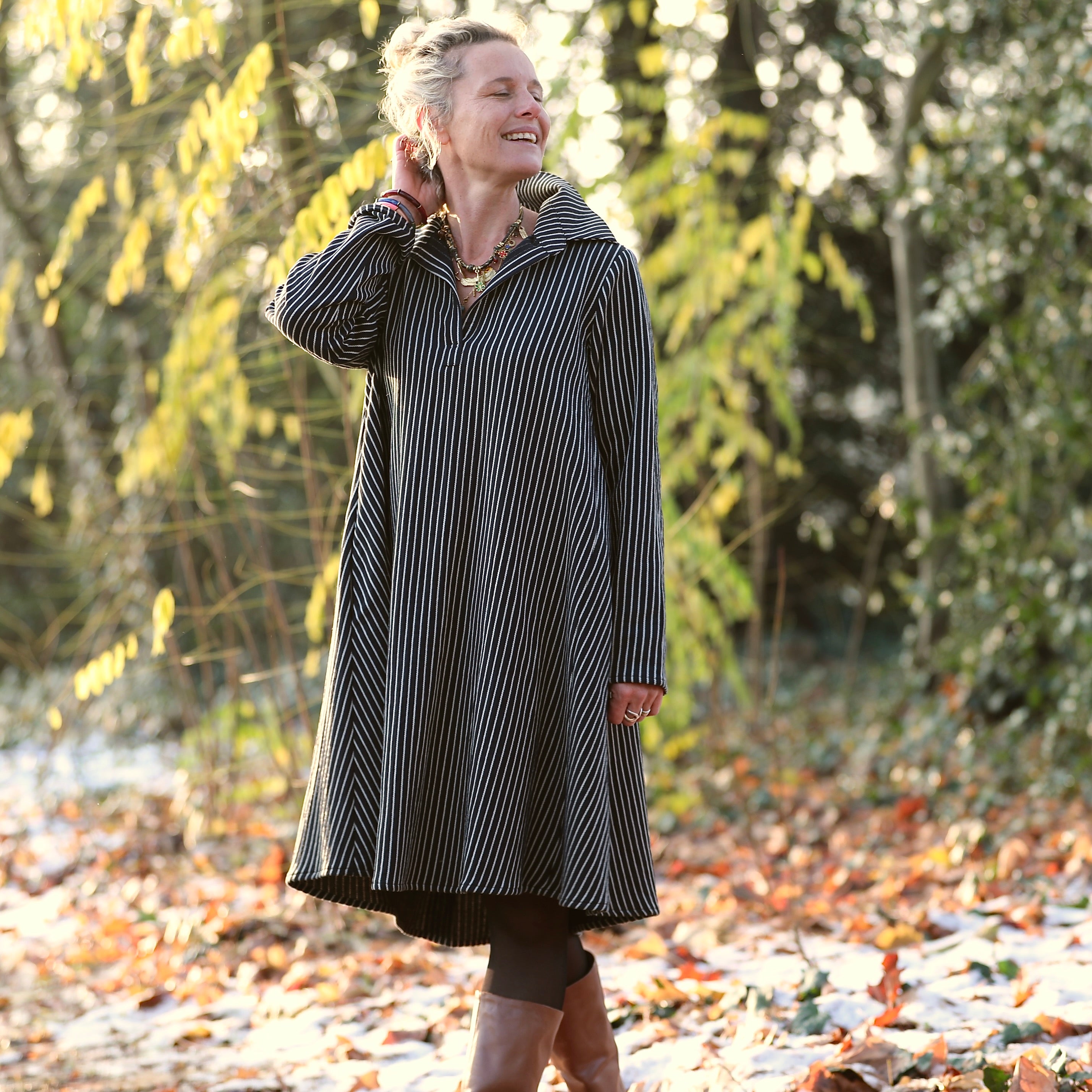La robe Carole séduit par sa coupe courte et très évasée, offrant une ampleur généreuse et un tombé fluide. Un pli généreux dans le dos souligne la silhouette et lui confère une élégance naturelle.