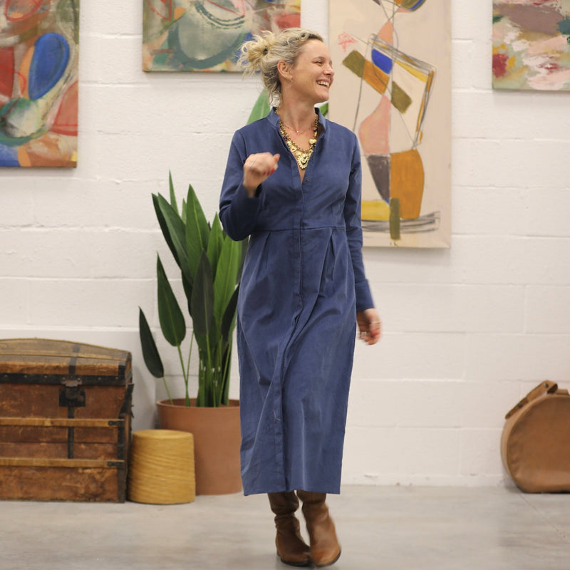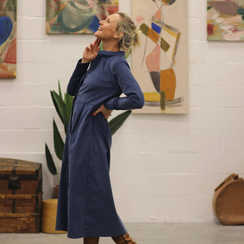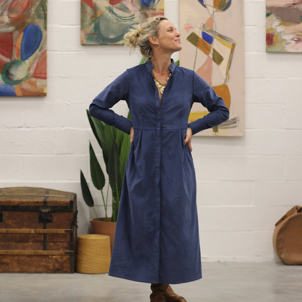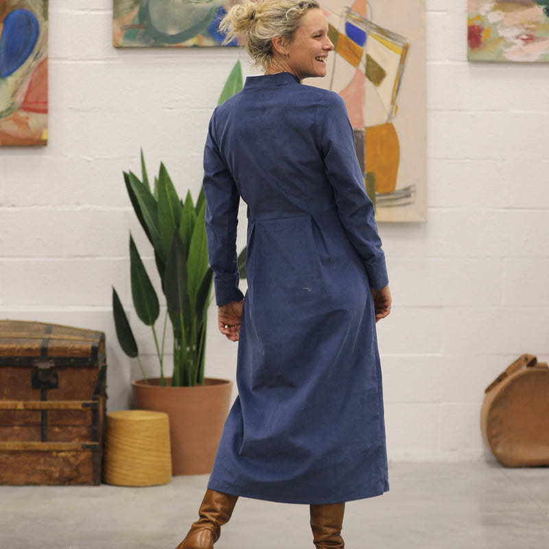 Cyrielle est une robe élégante dotée de quatre pinces et d'une ouverture complète grâce à des boutons-pression dissimulés sous une patte de boutonnage.