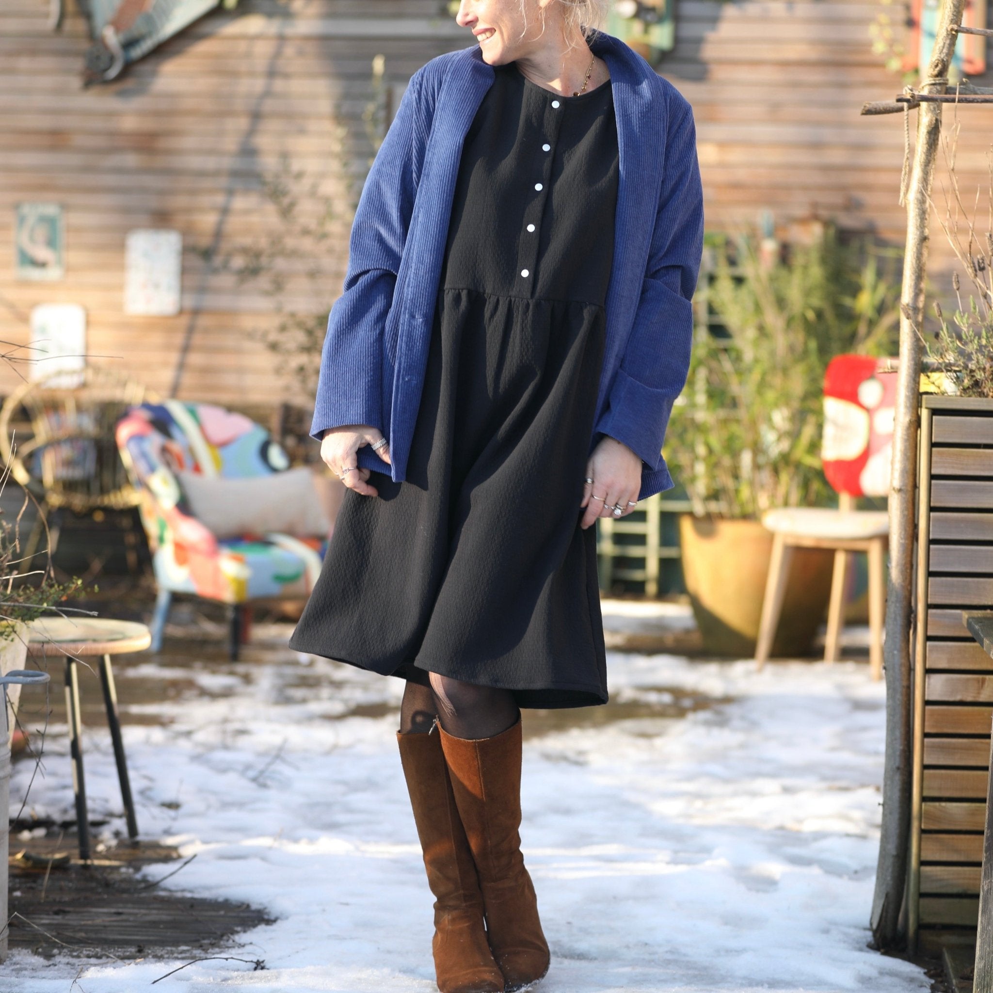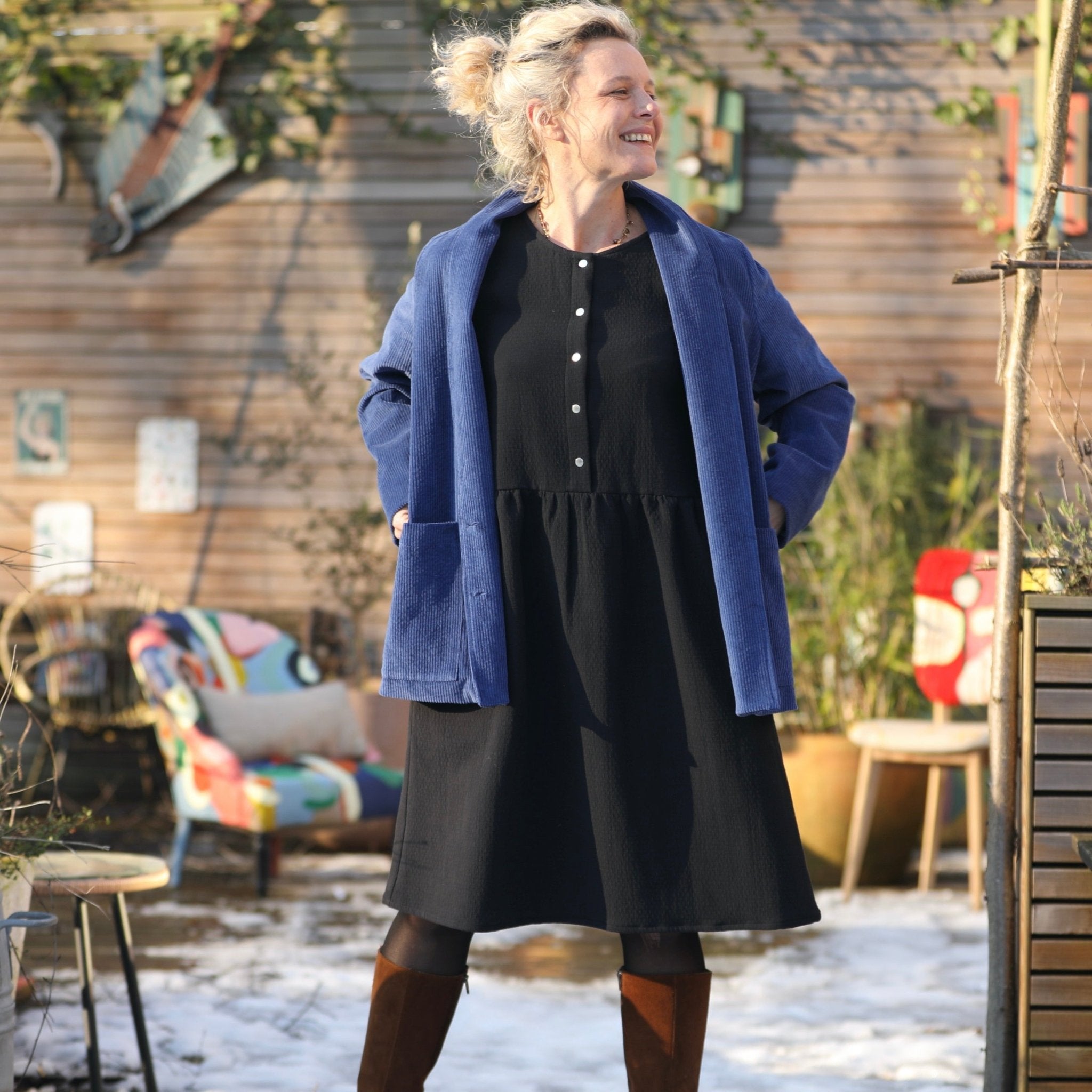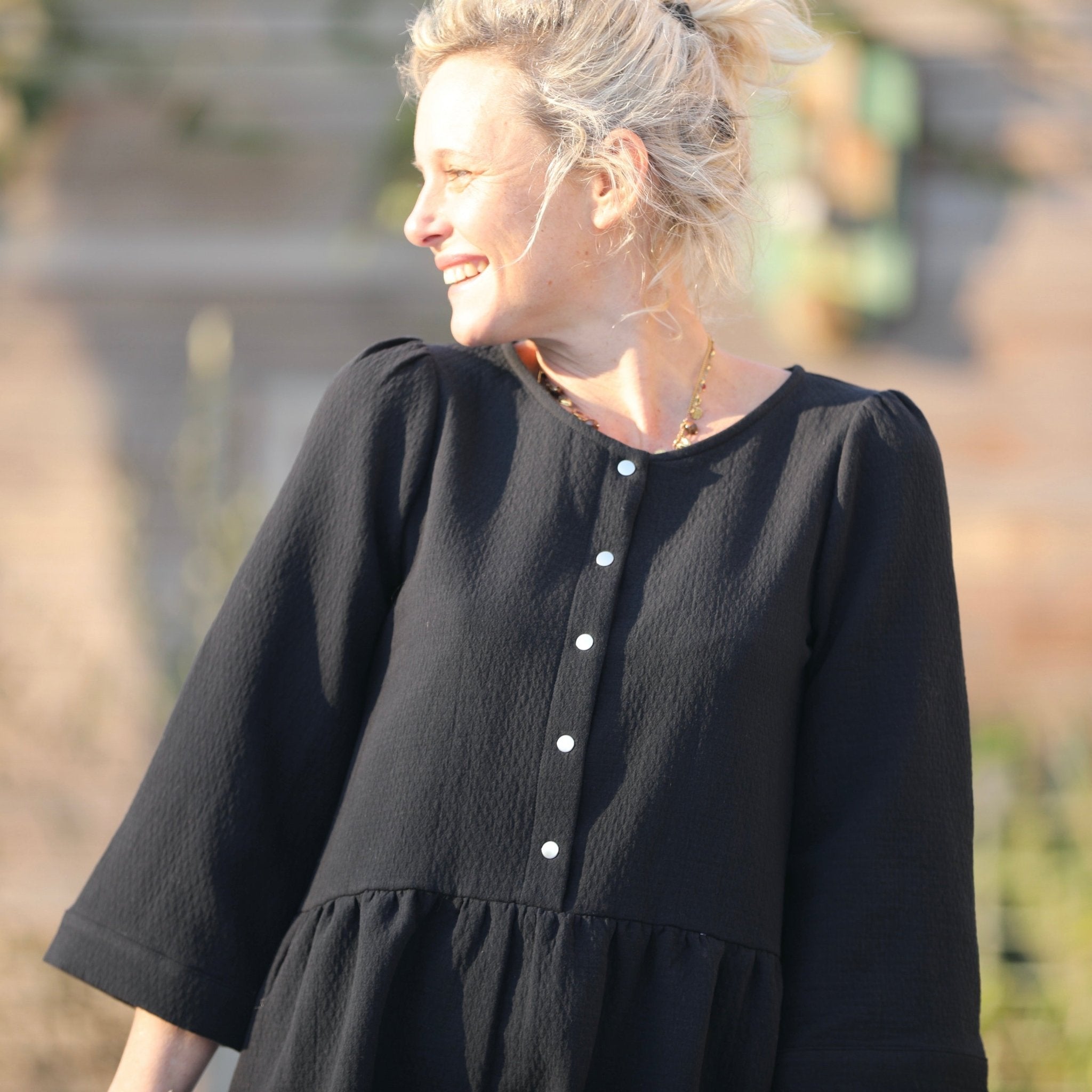 La robe Églantine se distingue par sa coupe midi et son joli col rond ajustable en col V grâce à des pressions. Sa jupe froncée à la taille garantit une grande liberté de mouvement, tandis que ses manches 3/4 dotées de poignets renforcés par un thermocollant assurent une tenue impeccable. Ce modèle offre une silhouette féminine et rafraîchissante.