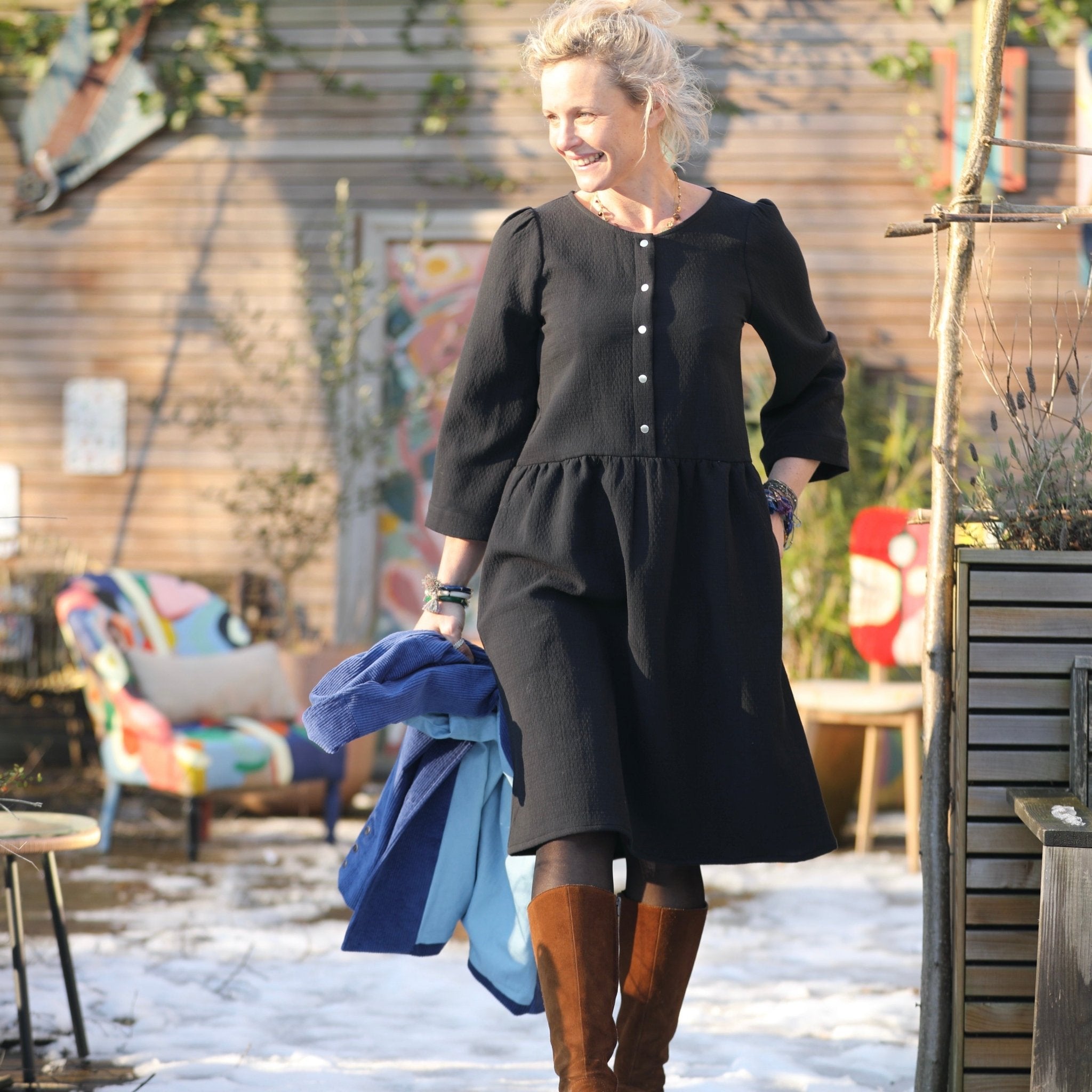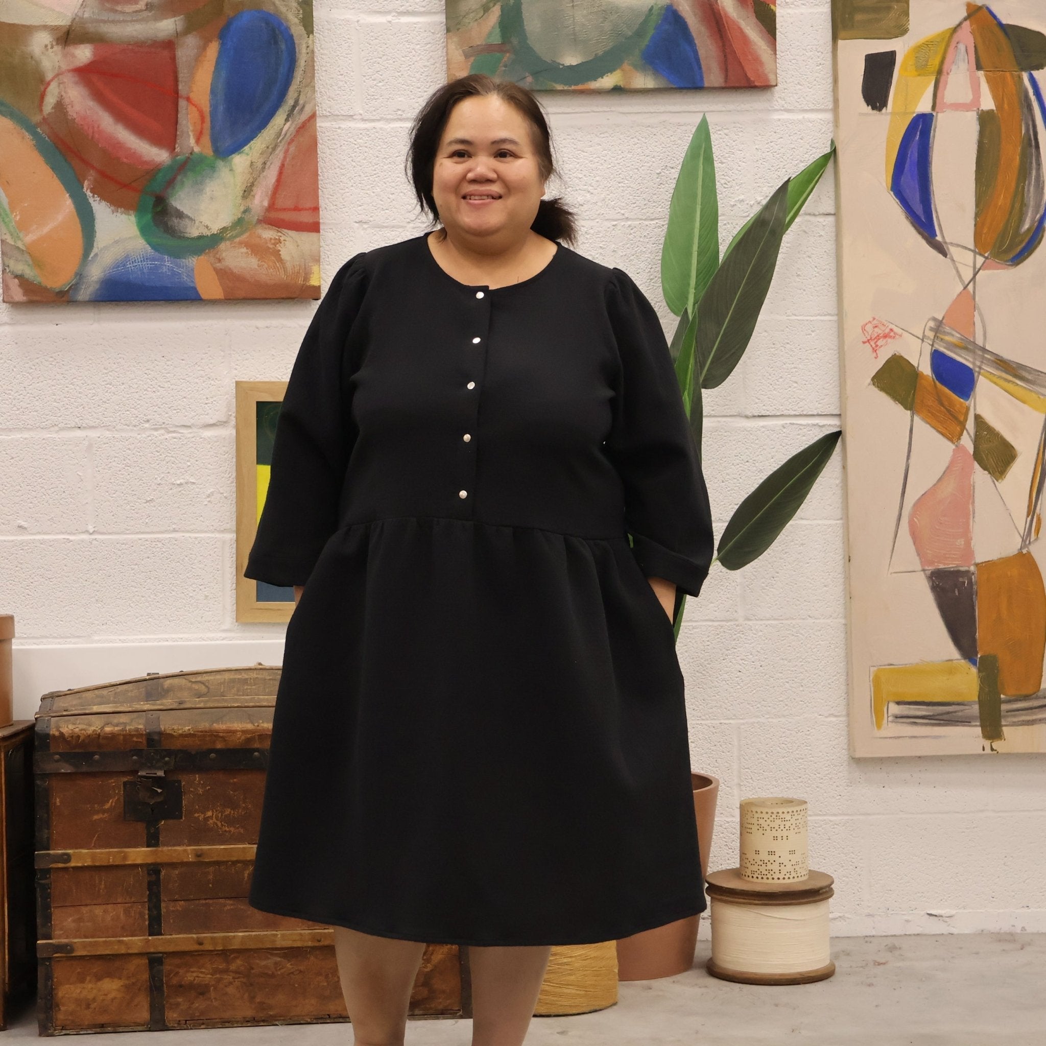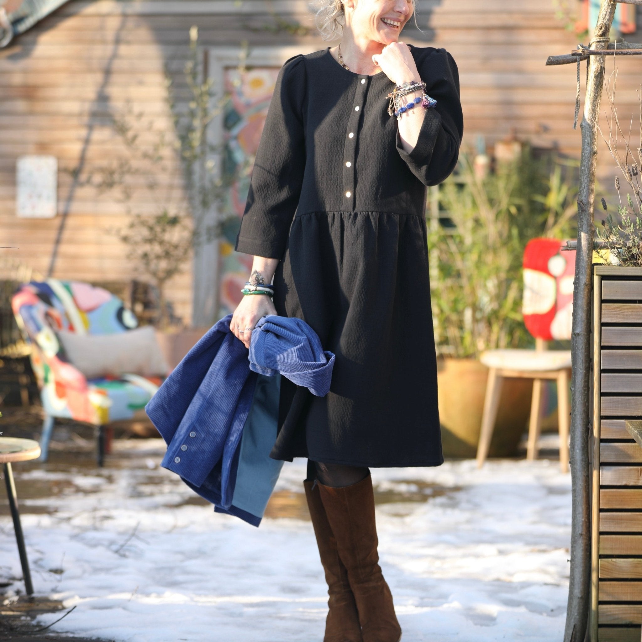 La robe Églantine se distingue par sa coupe midi et son joli col rond ajustable en col V grâce à des pressions. Sa jupe froncée à la taille garantit une grande liberté de mouvement, tandis que ses manches 3/4 dotées de poignets renforcés par un thermocollant assurent une tenue impeccable. Ce modèle offre une silhouette féminine et rafraîchissante.