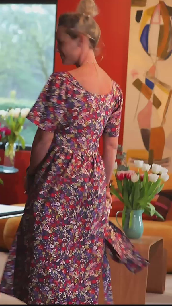 Confectionnée dans un coton imprimé Floraison améthyste, ce tissu est doux, léger et respirant. Son imprimé floral riche et joyeux mêle des tons framboise, rose et touches plus profondes, pour une allure lumineuse et vivante. Le coton offre un tombé souple et naturel, parfait pour accompagner le mouvement sans alourdir la silhouette.