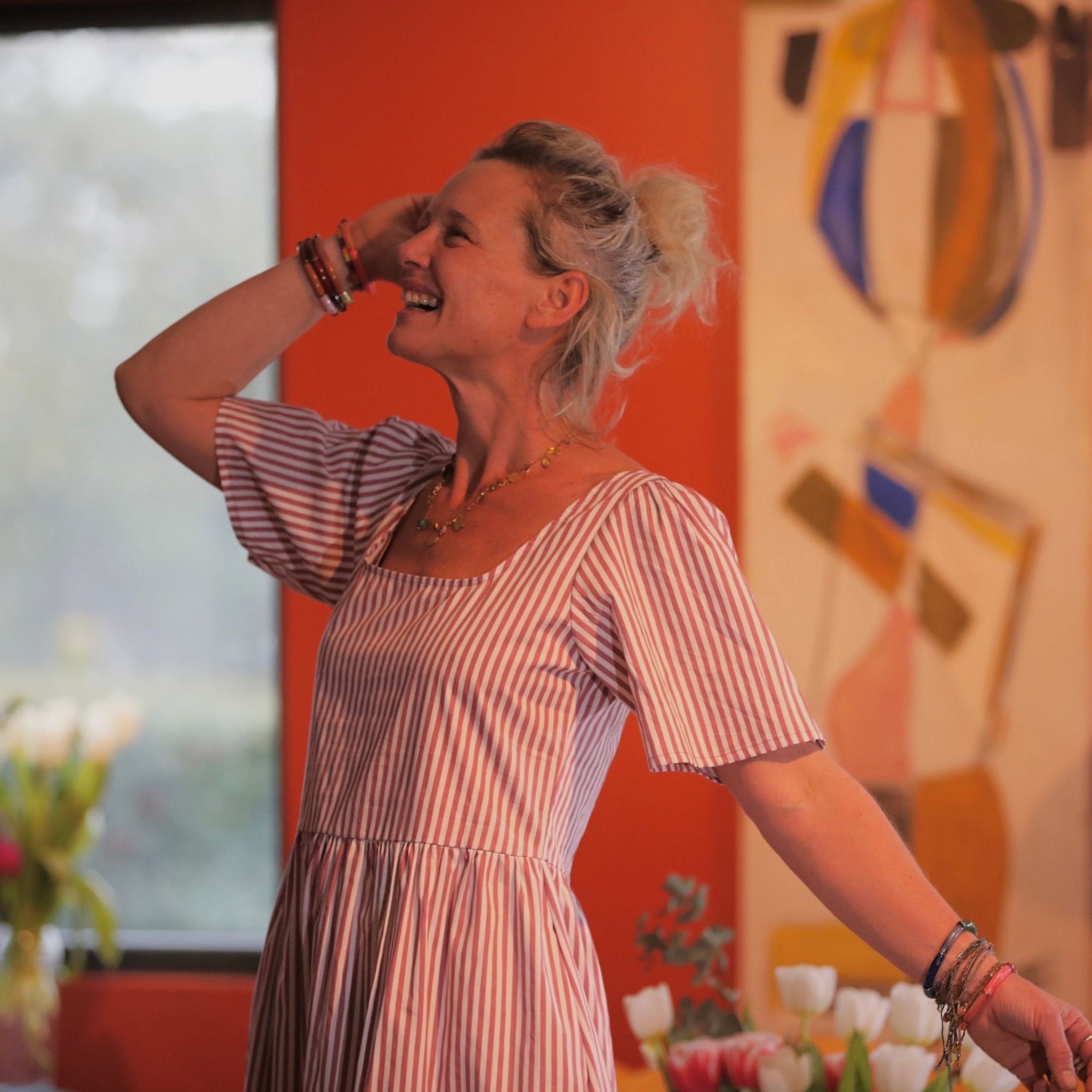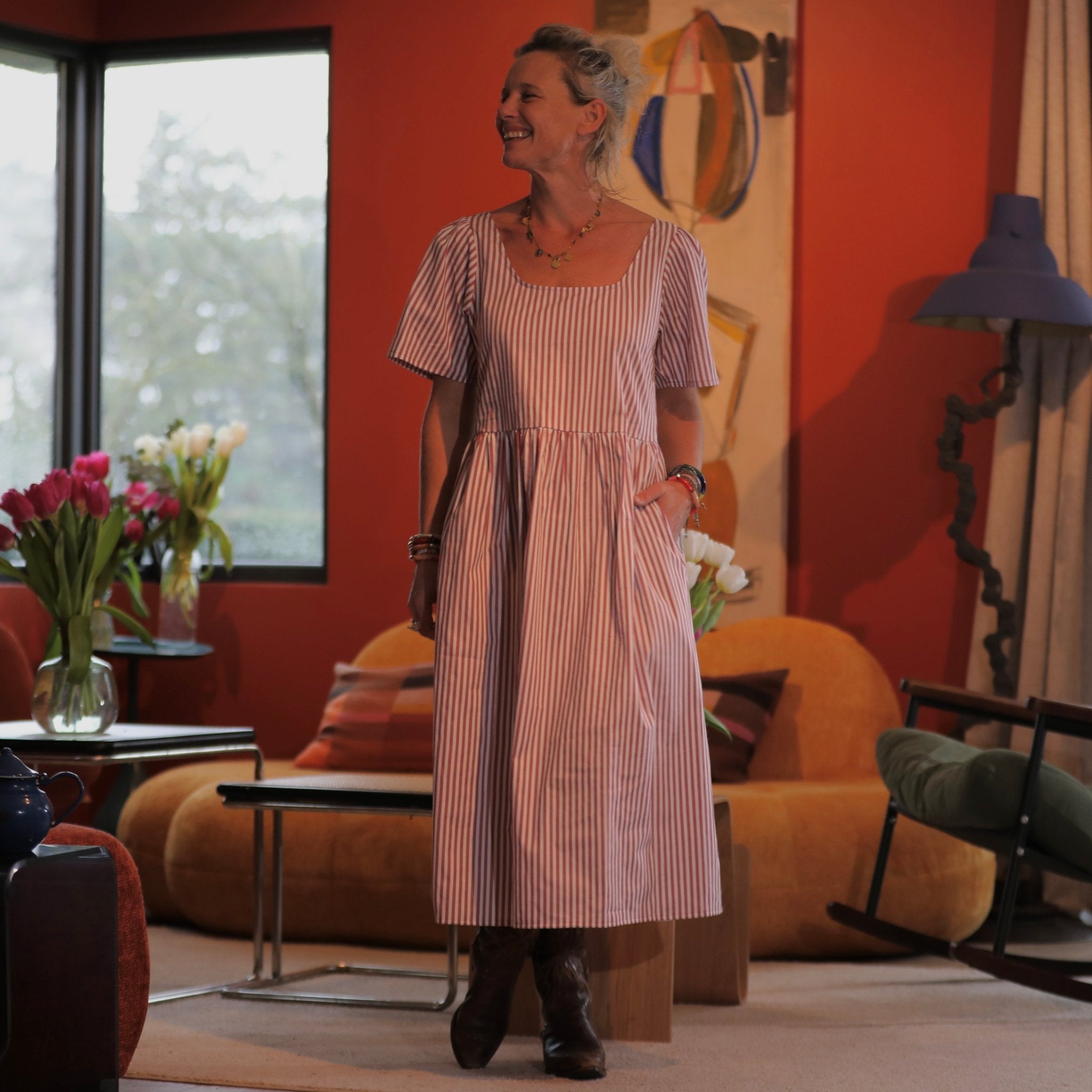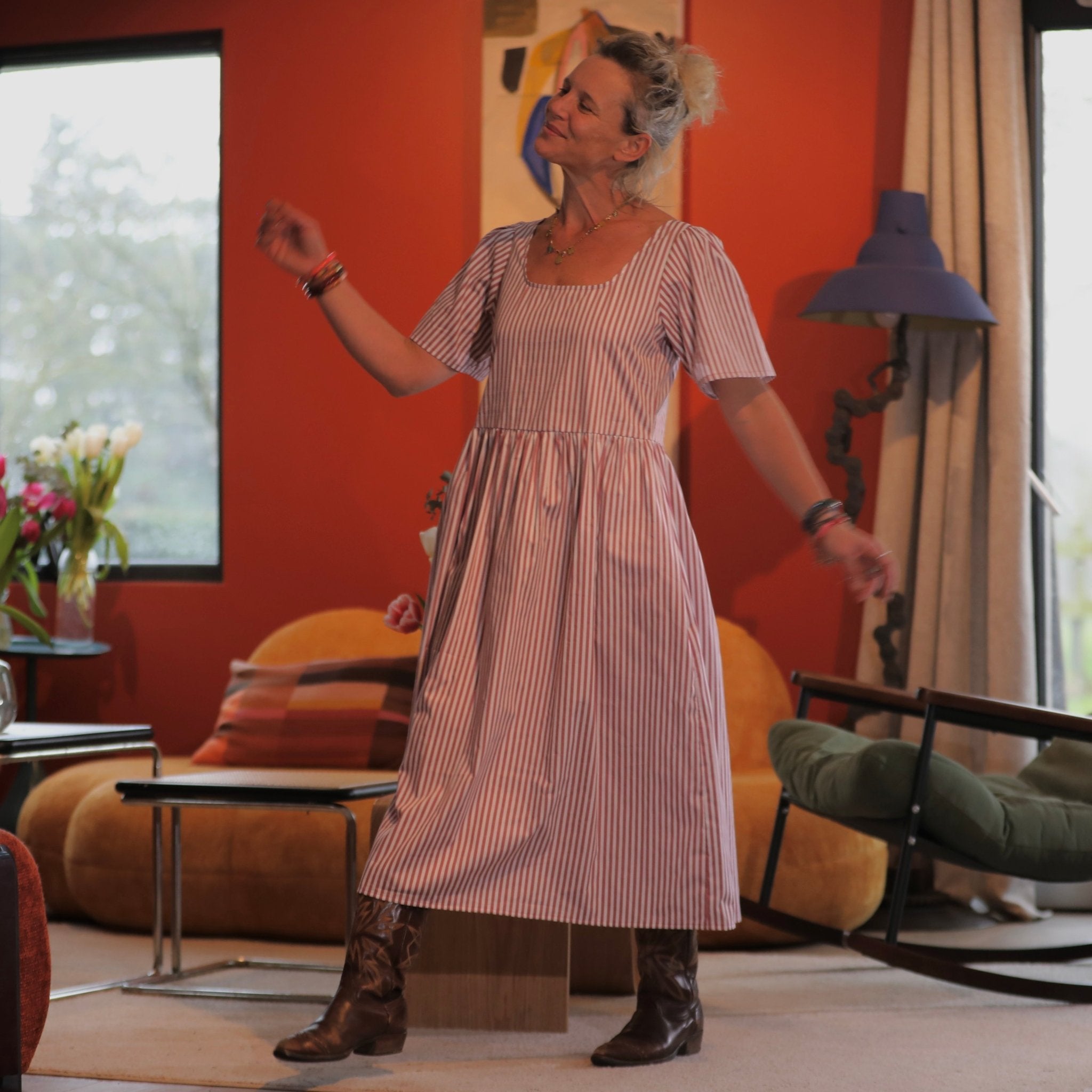 La robe Gwenaëlle présente une taille haute marquée, soulignée par une découpe sous poitrine, puis une jupe délicatement froncée qui apporte du mouvement et une belle aisance au porté. Son encolure carrée, nette et féminine, met joliment en valeur le buste et les épaules. La ligne est fluide, flatteuse et confortable, parfaite pour accompagner le quotidien comme les moments plus habillés.