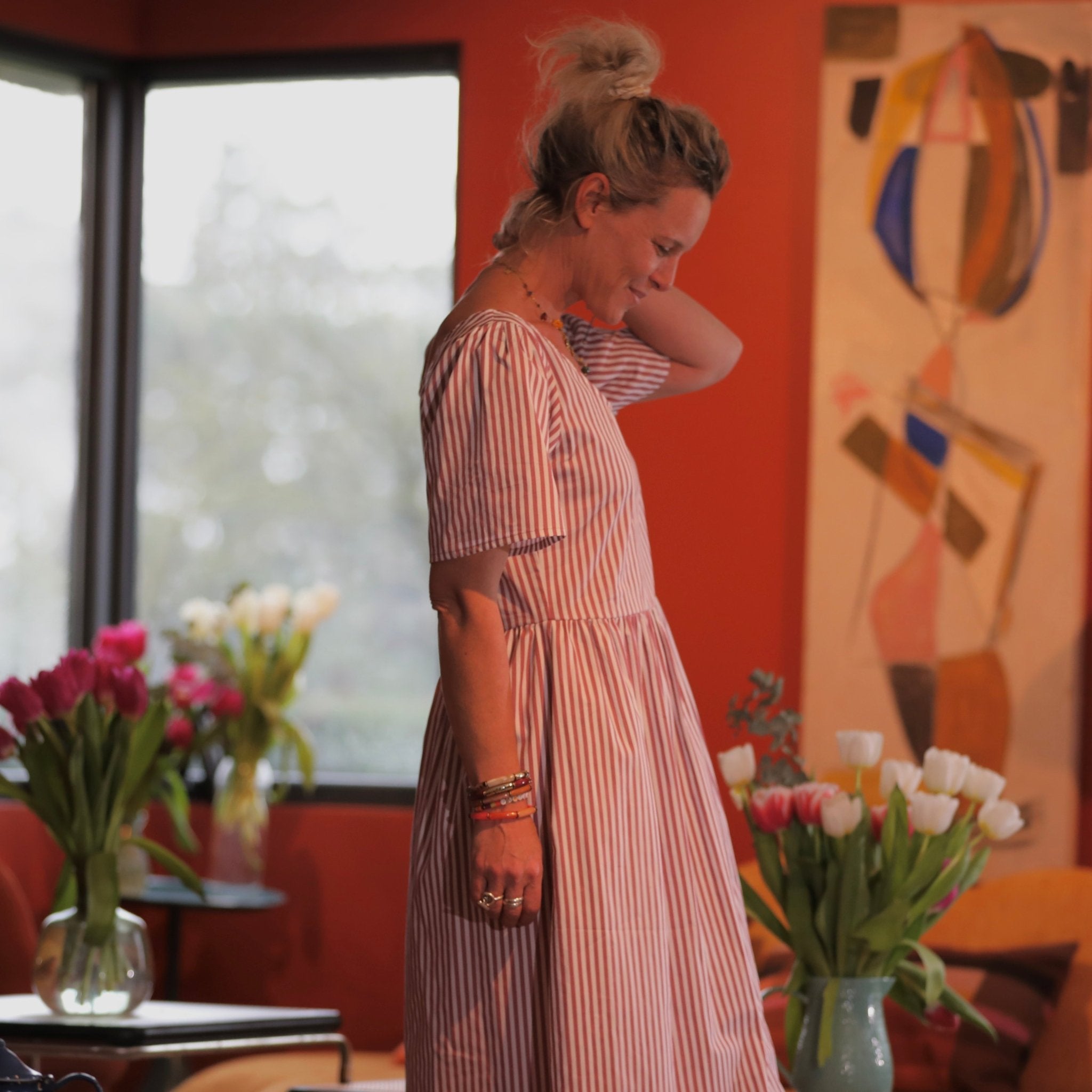 La robe Gwenaëlle se suffit à elle-même dès les beaux jours. Elle peut aussi se porter avec un boléro, un gilet léger ou une maille fine pour les matinées plus fraîches. Avec des sandales, des baskets ou des bottines, elle s’adapte à tous les moments de la saison.