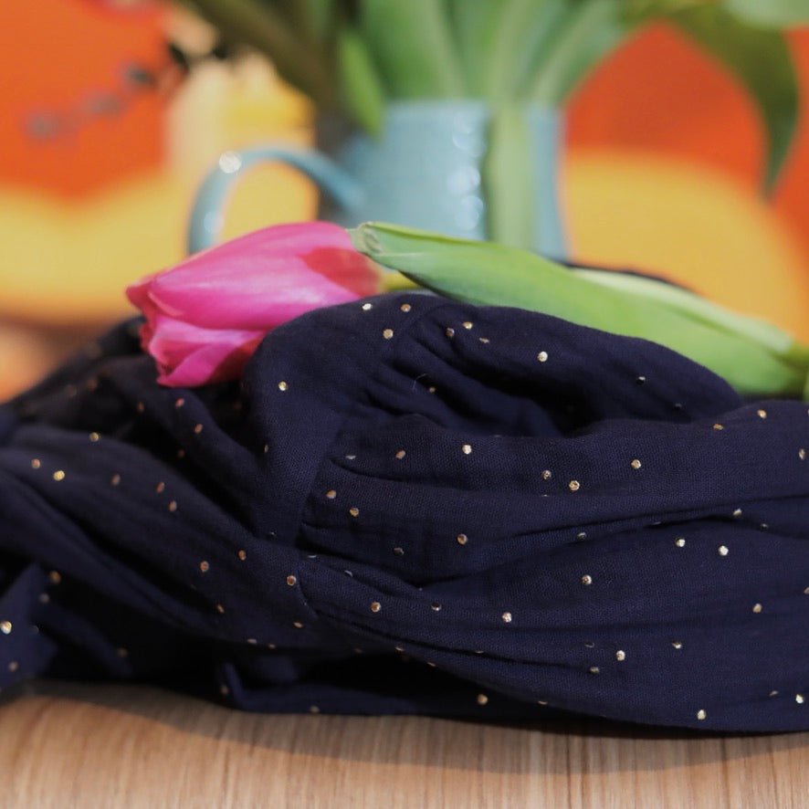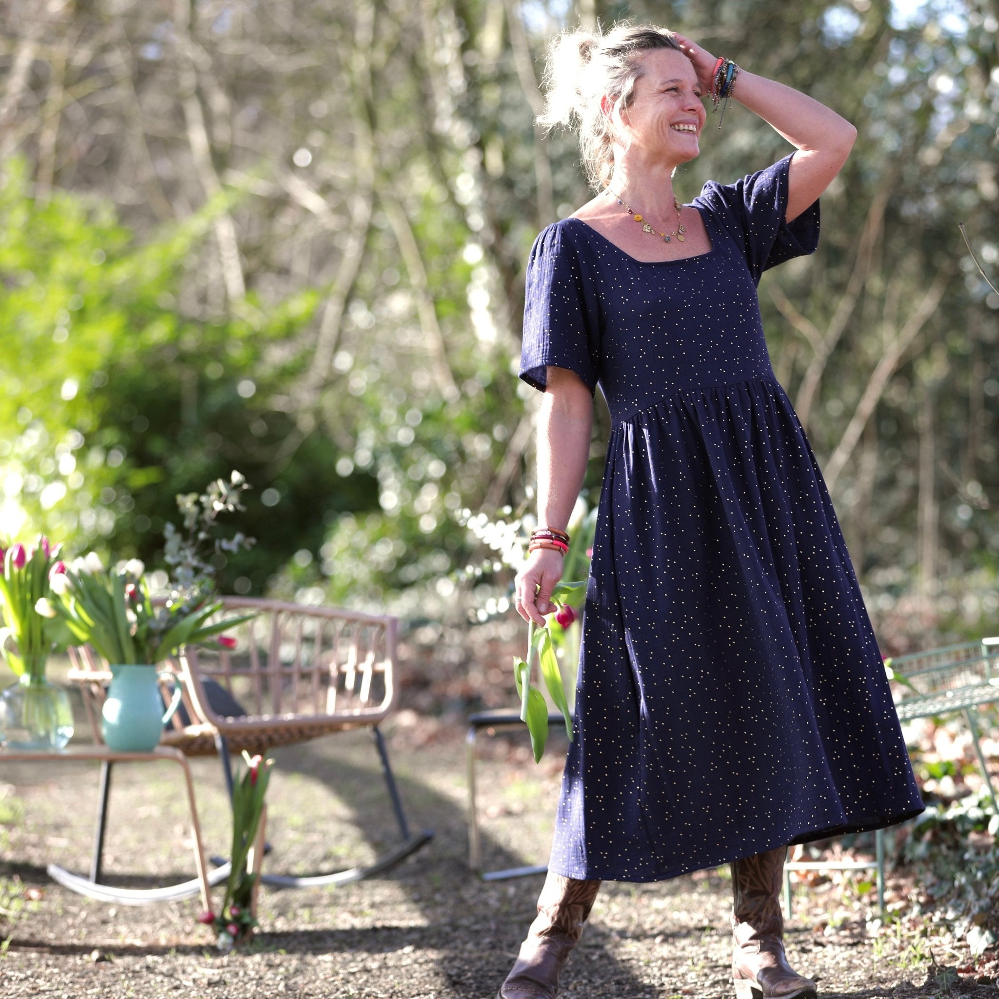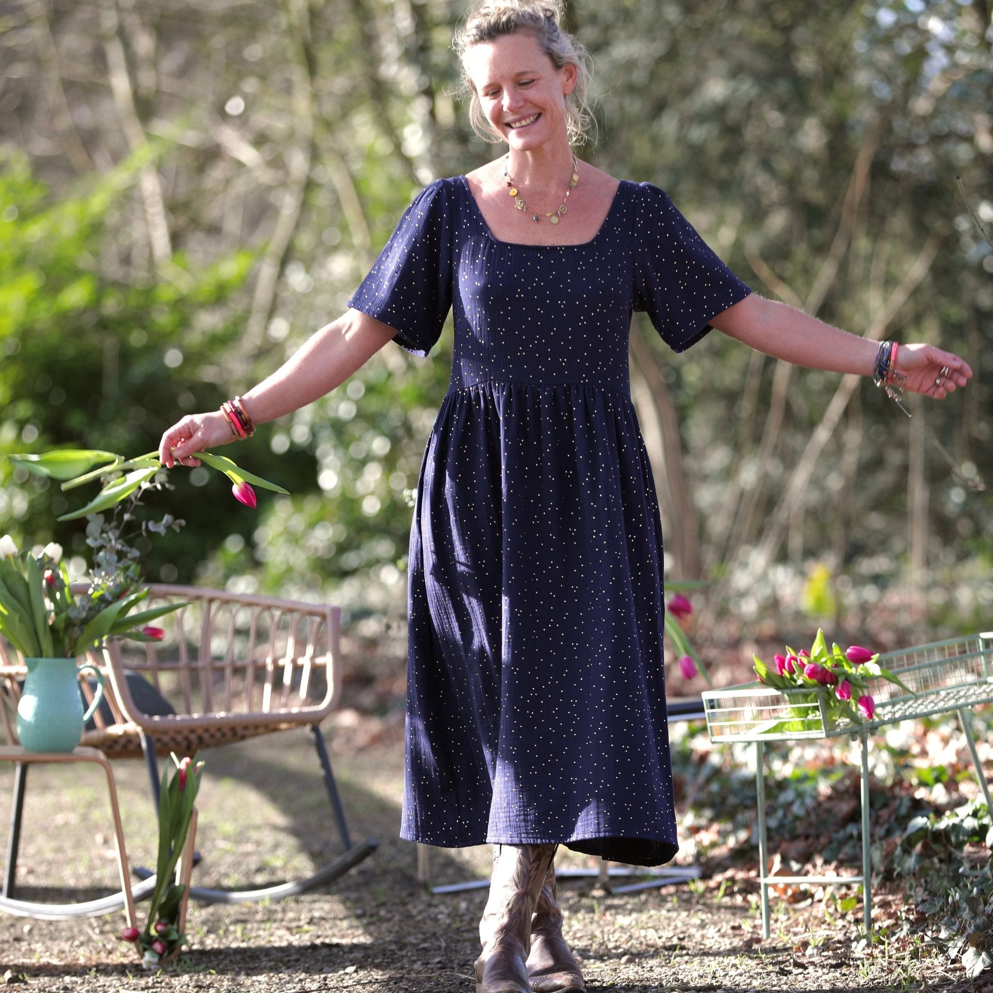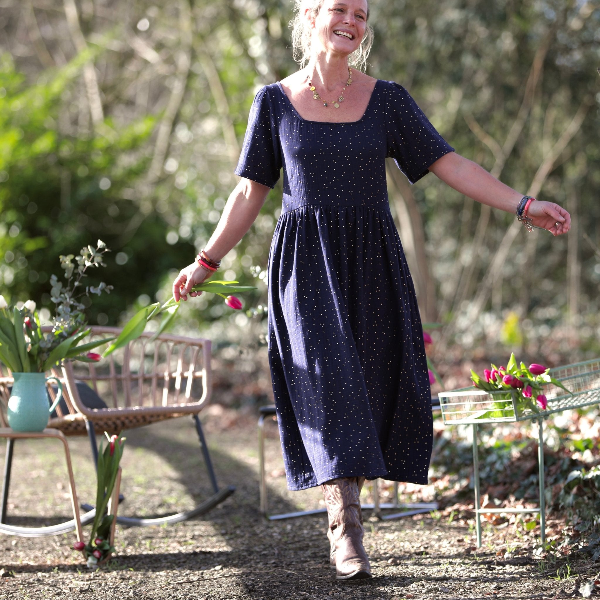 Robe Gwenaëlle - Double gaze de coton bleu nuit plumetis or