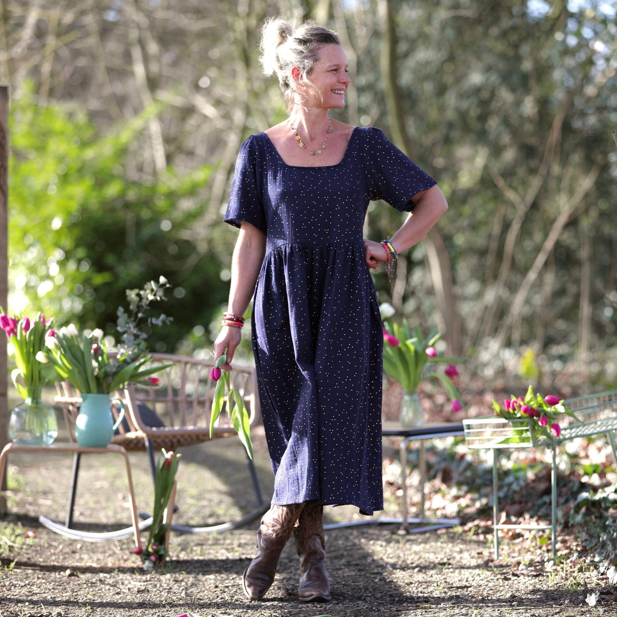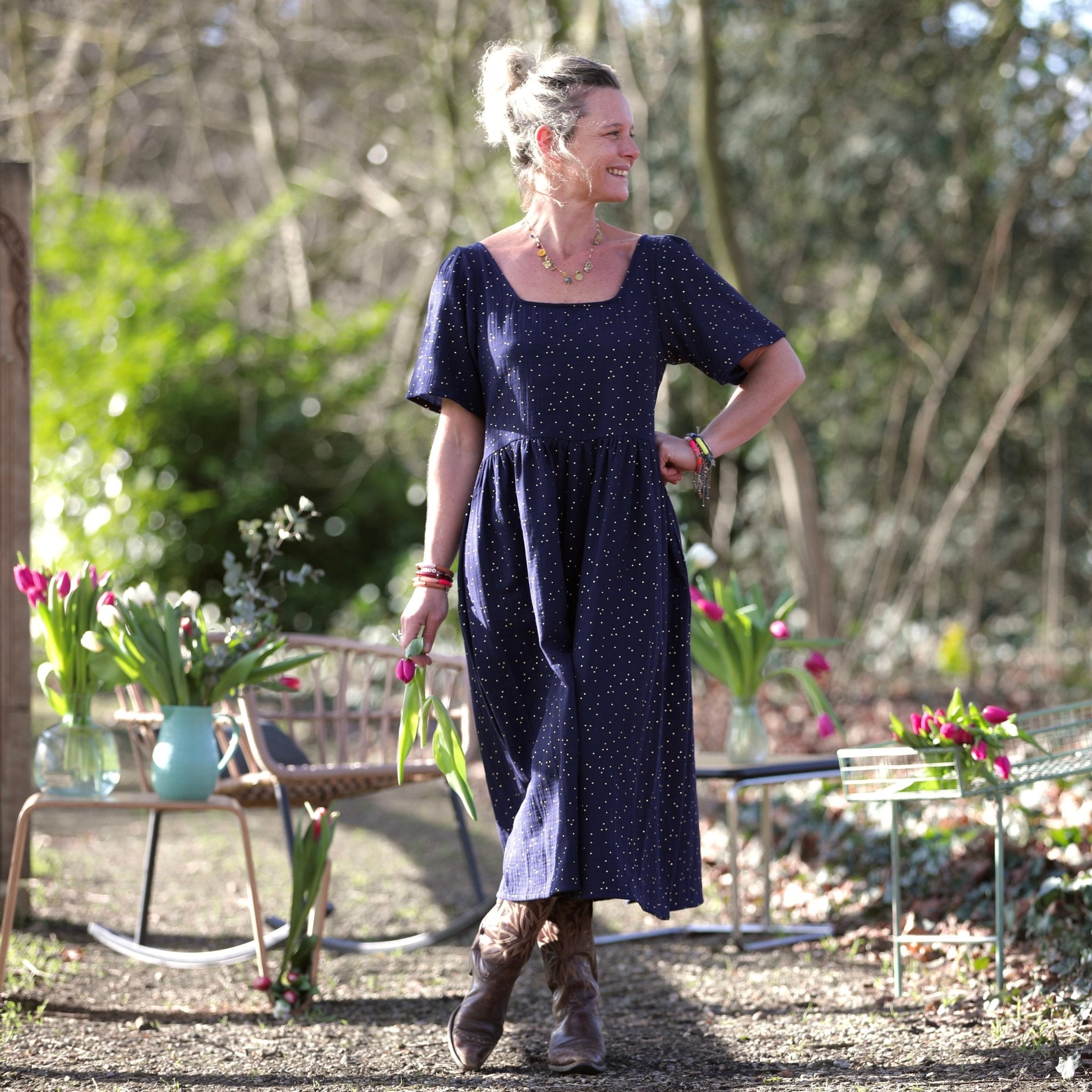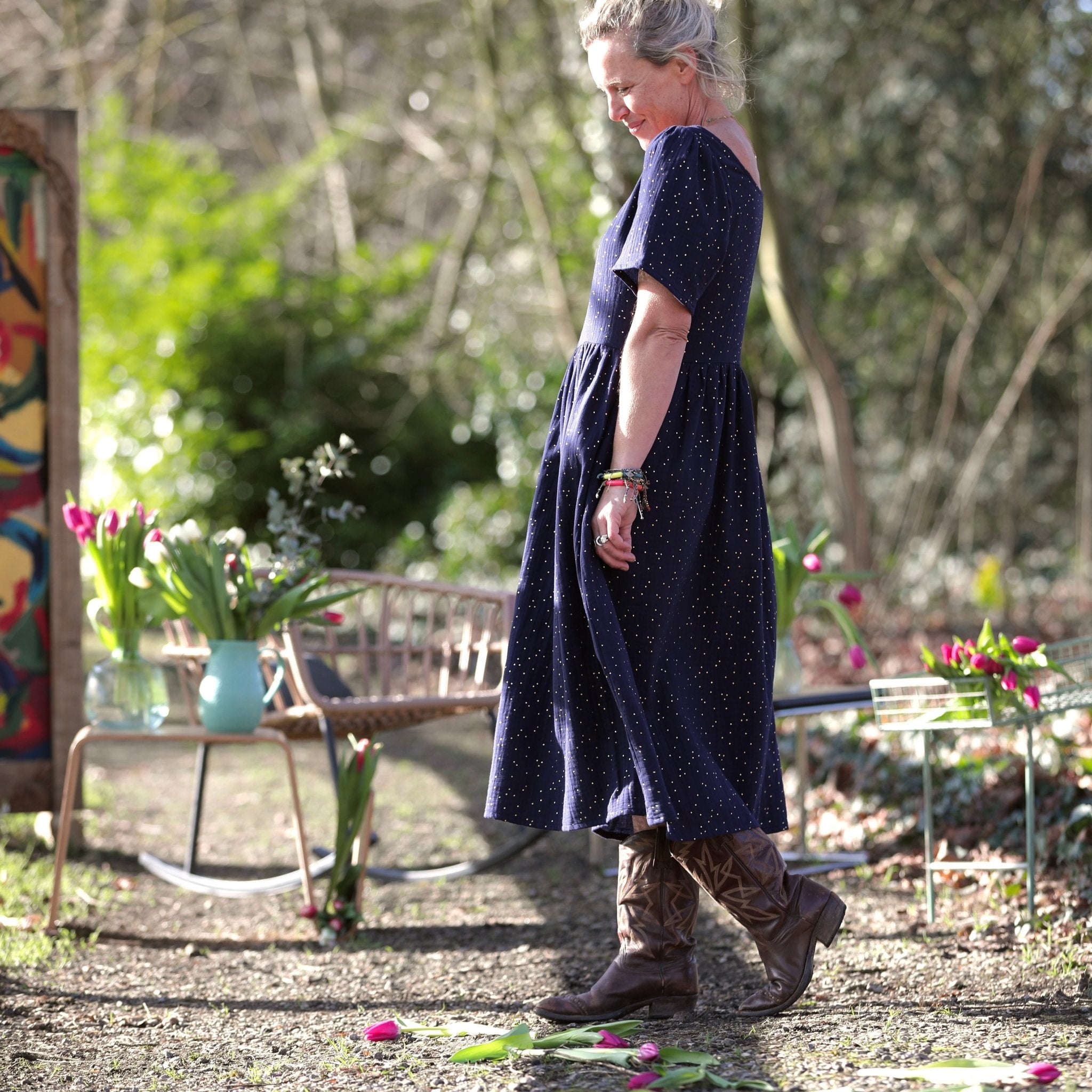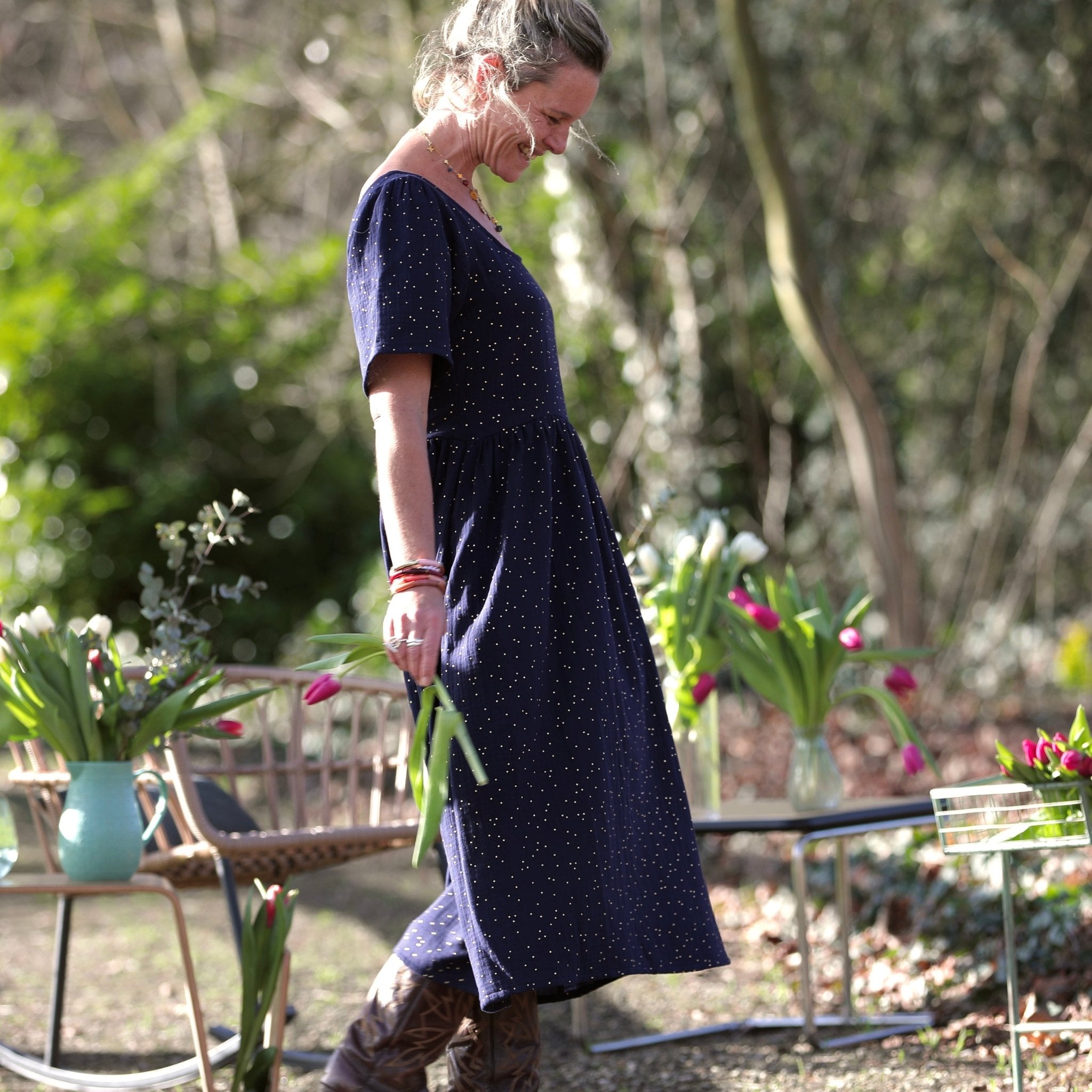 Robe Gwenaëlle - Double gaze de coton bleu nuit plumetis or
