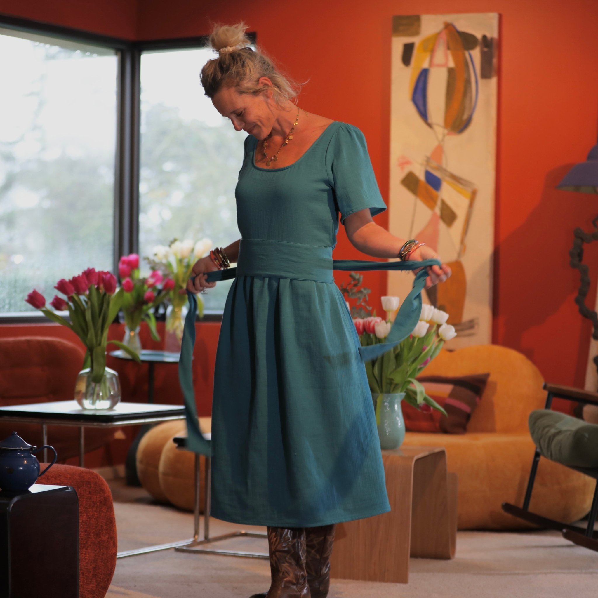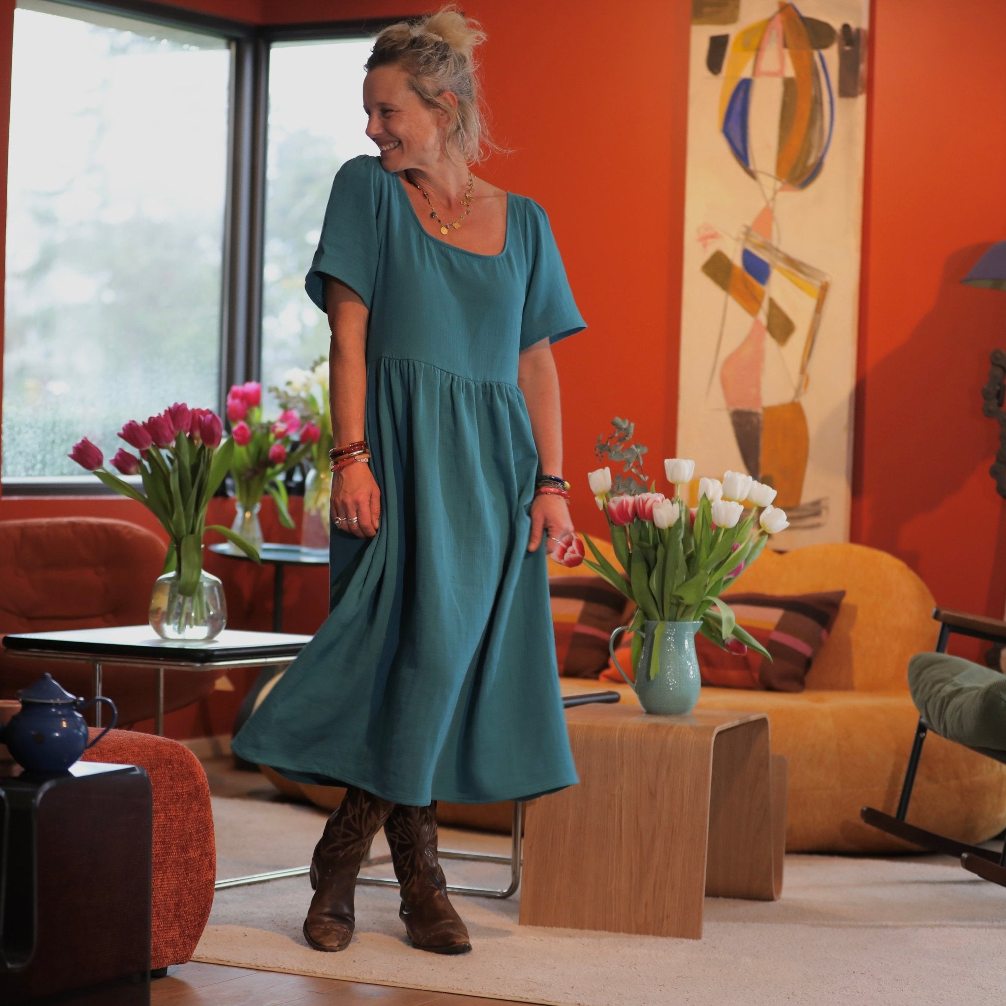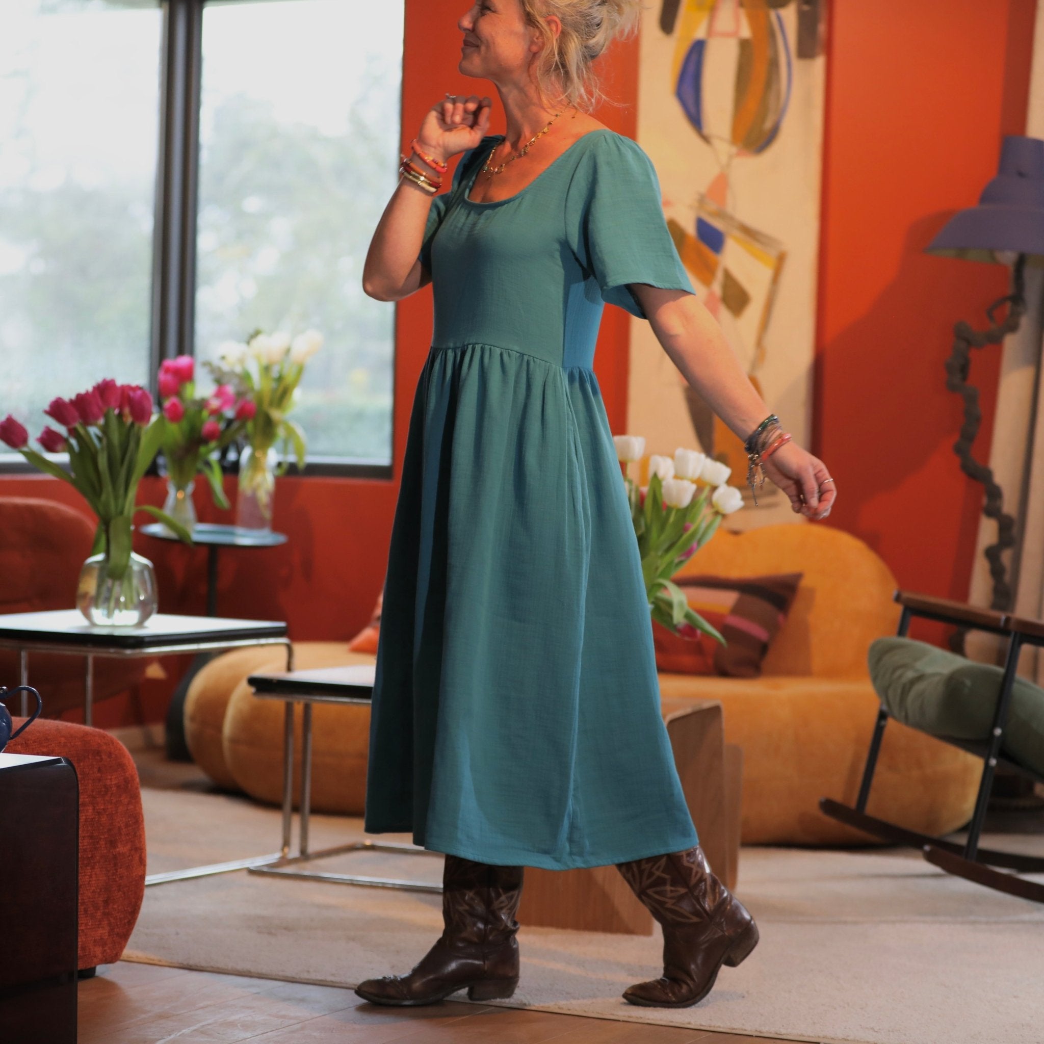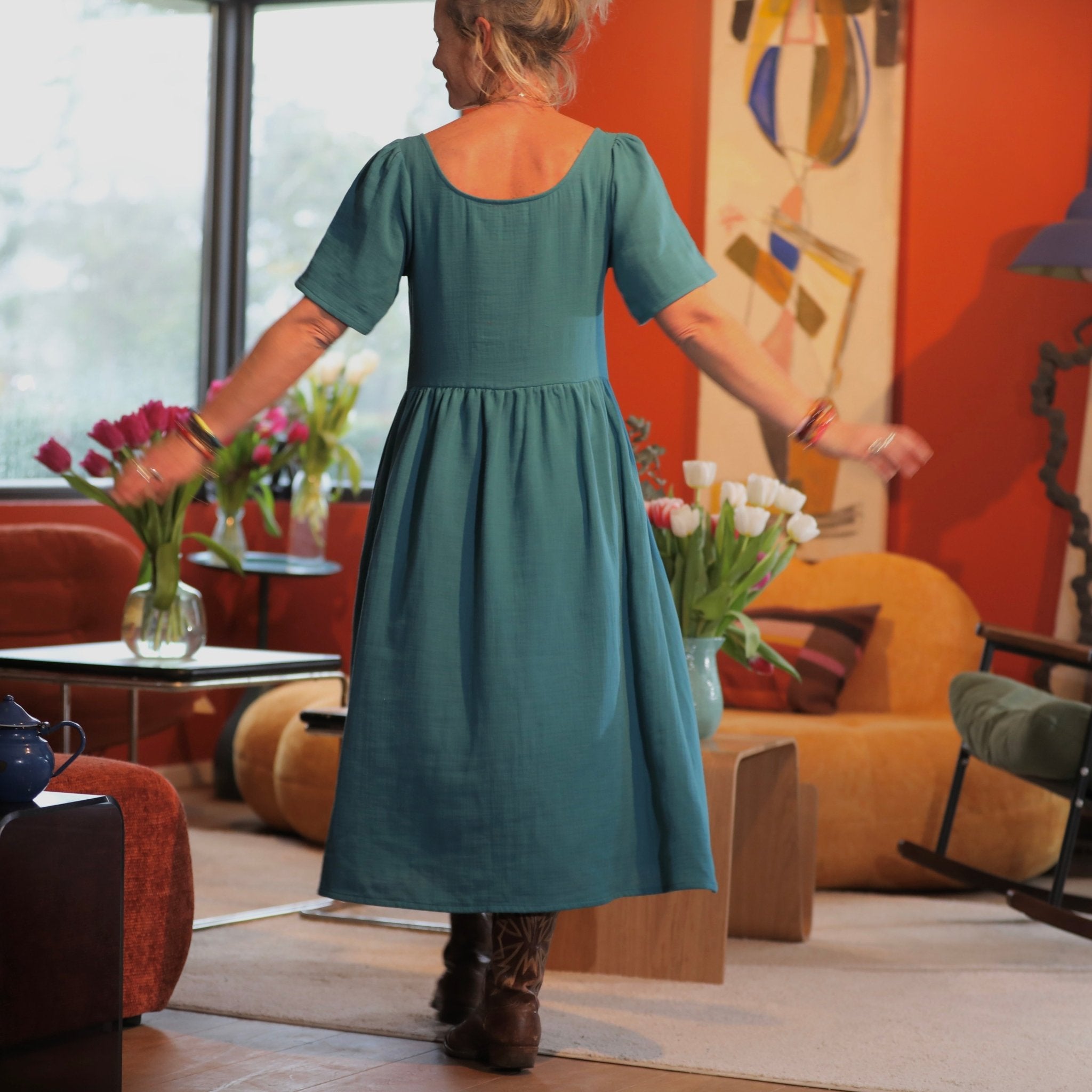 La robe Gwenaëlle se distingue par sa taille haute, marquée par une découpe sous poitrine, puis une jupe délicatement froncée qui donne du volume sans alourdir. Son encolure carrée, graphique et féminine, met en valeur le buste et les épaules, tout en restant très confortable au quotidien.