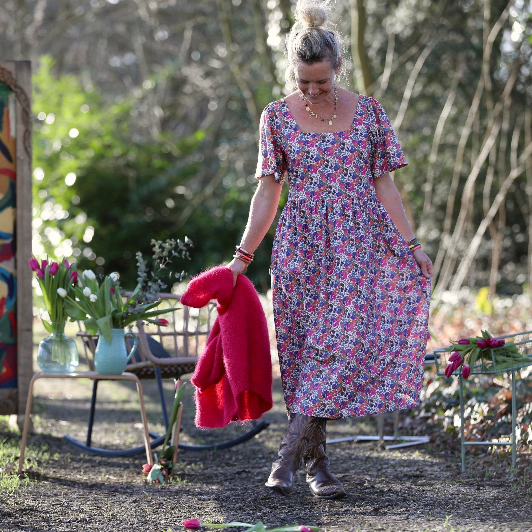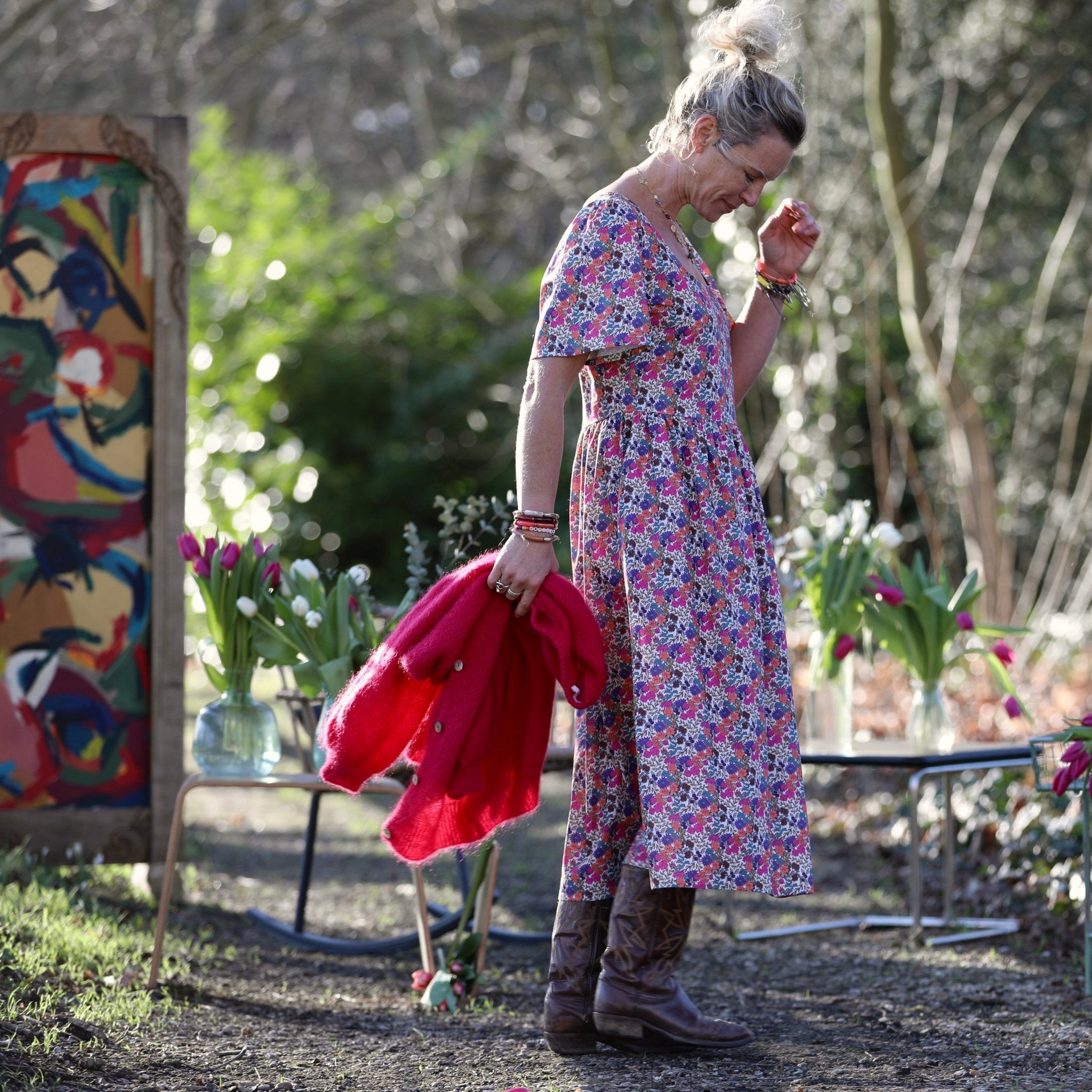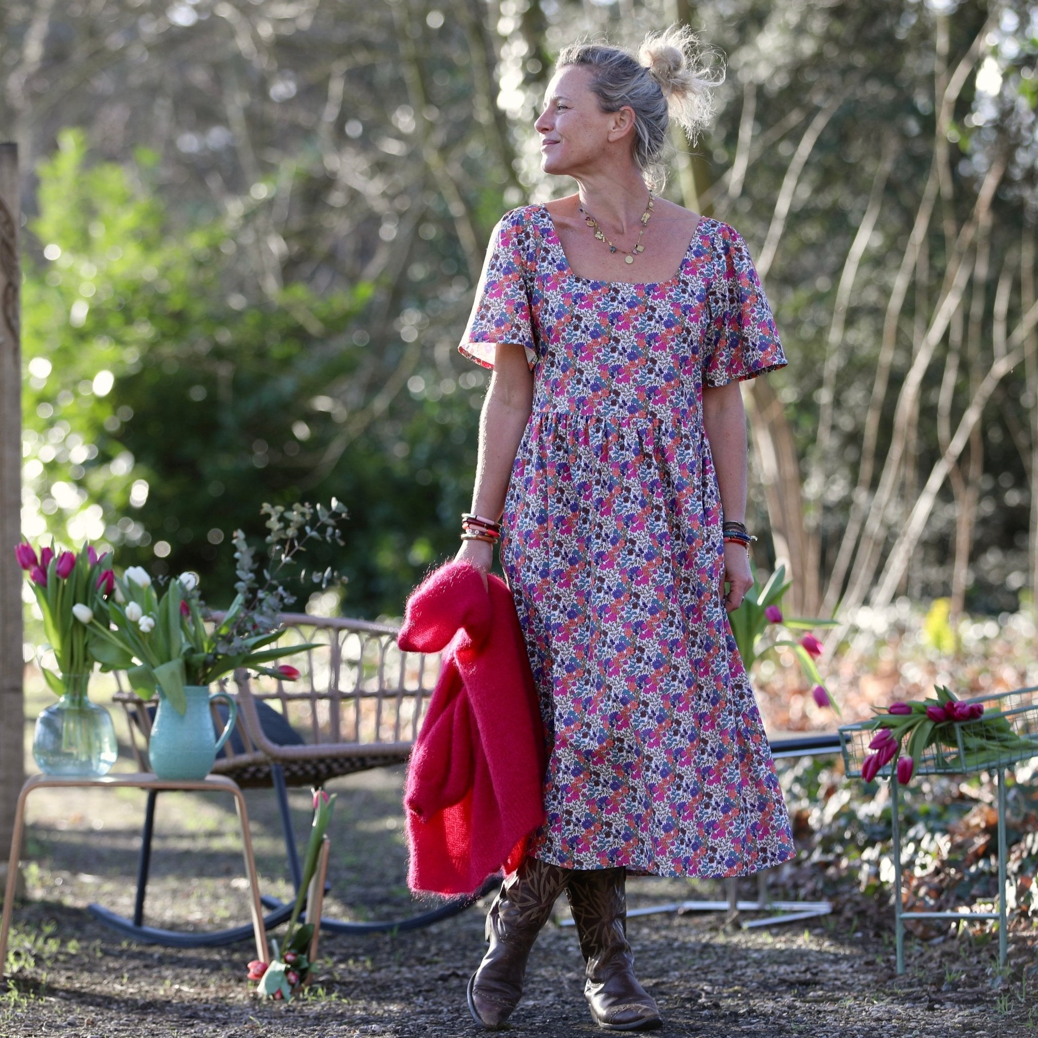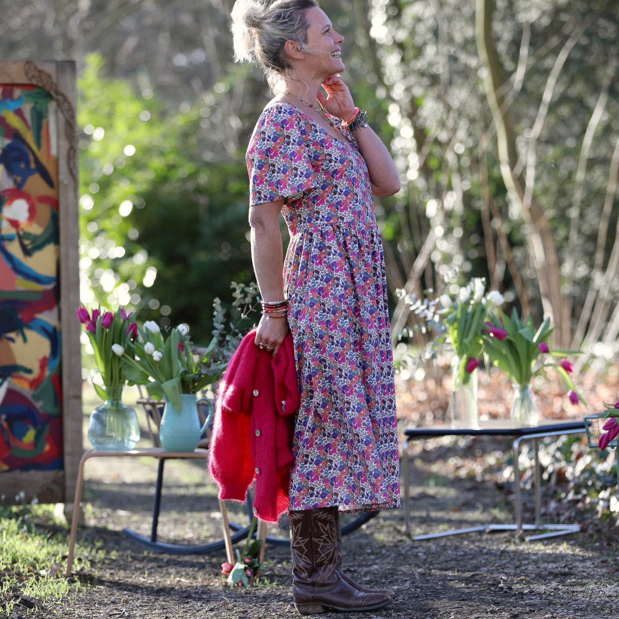 La robe Gwenaëlle se porte facilement seule, ses manches élégantes permettant un porté habillé sans superposition. Elle peut aussi s’associer à une maille fine, un boléro ou un gilet doux pour les journées plus fraîches. Avec des bottines, des sandales ou des baskets, elle s’adapte à tous les moments de la saison.