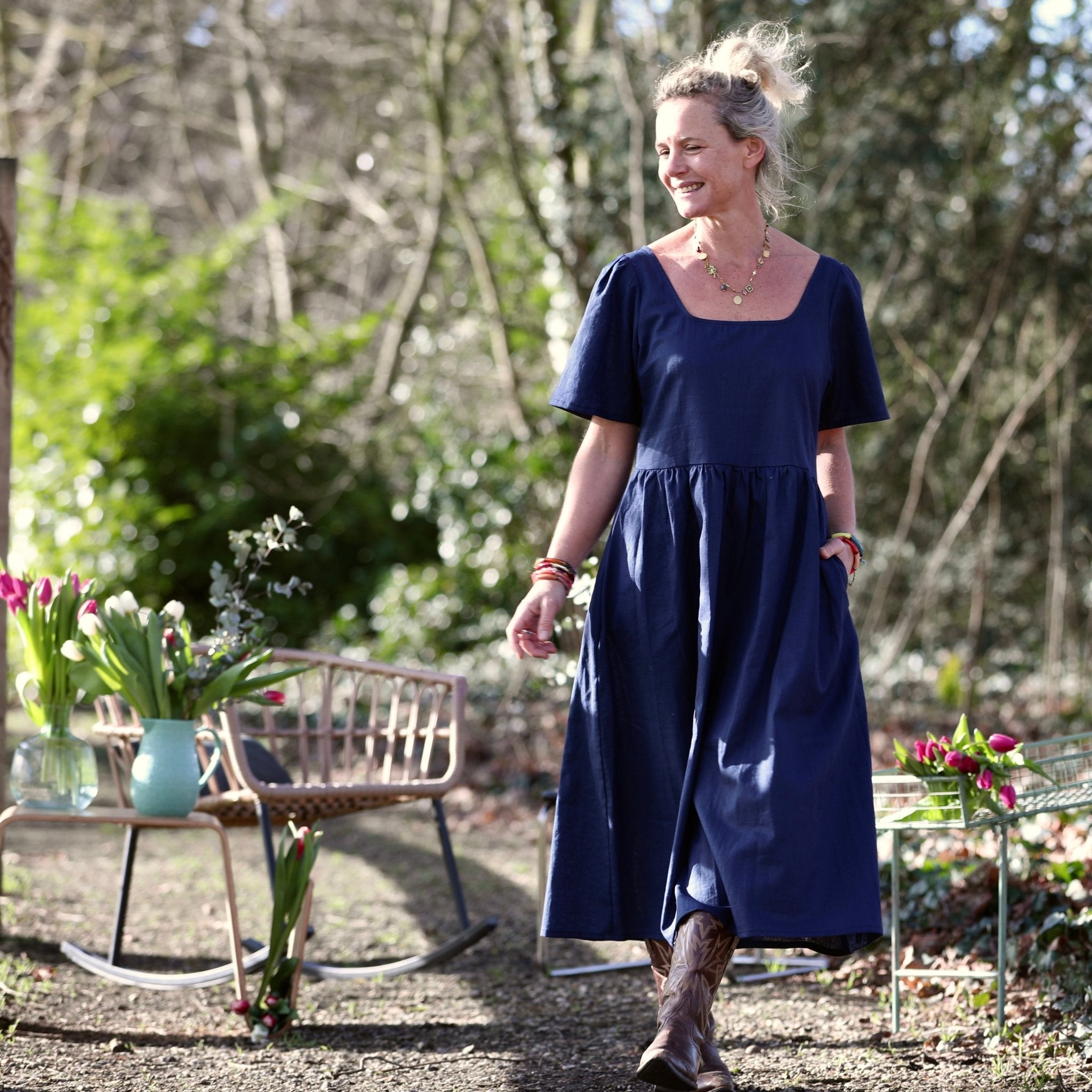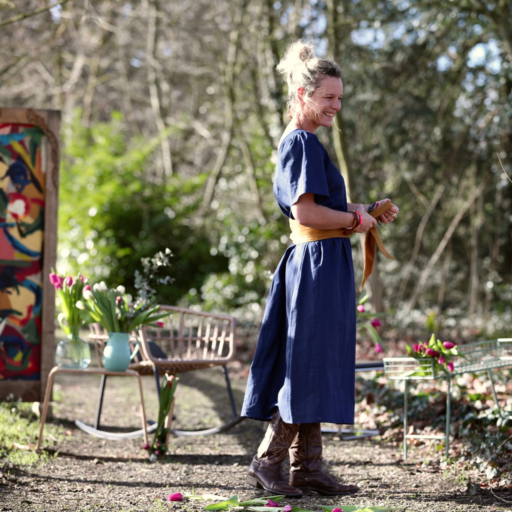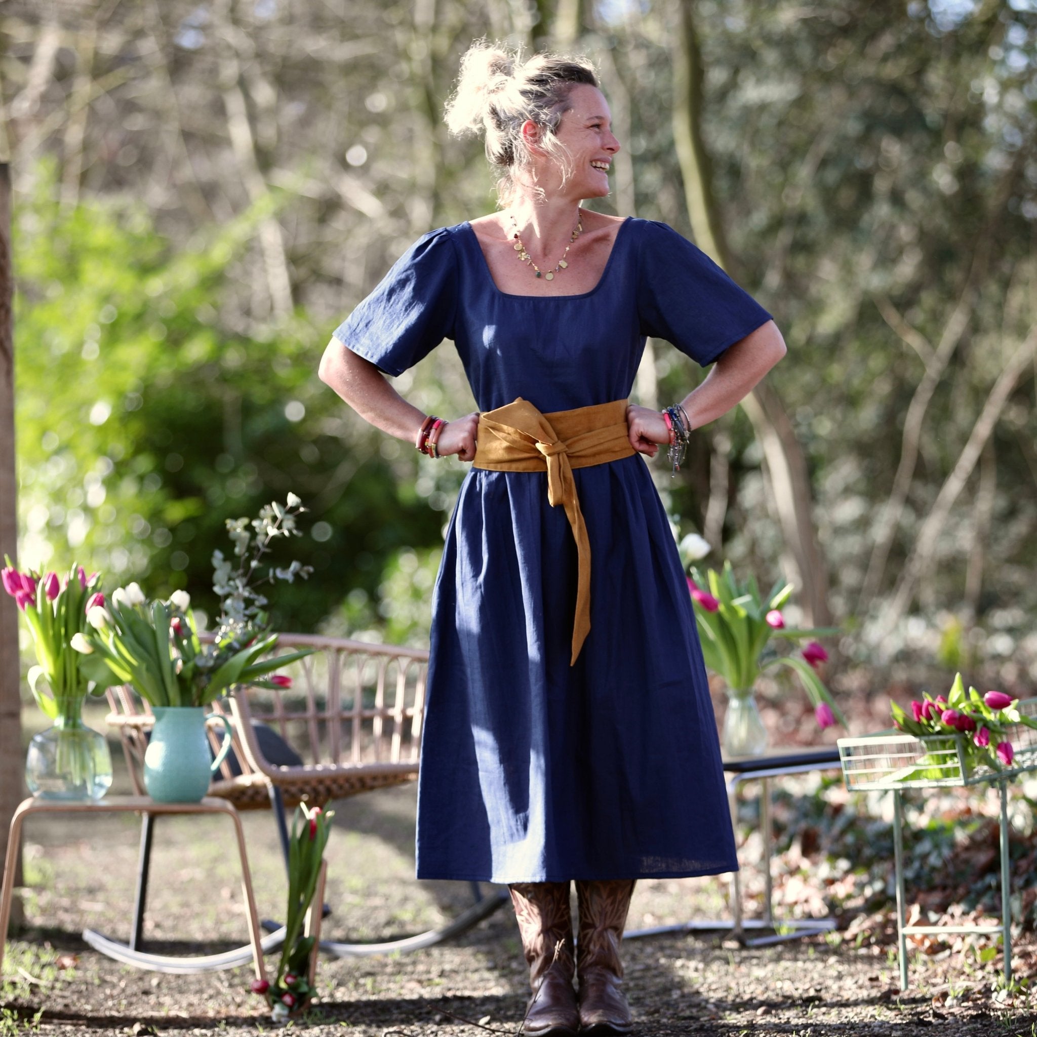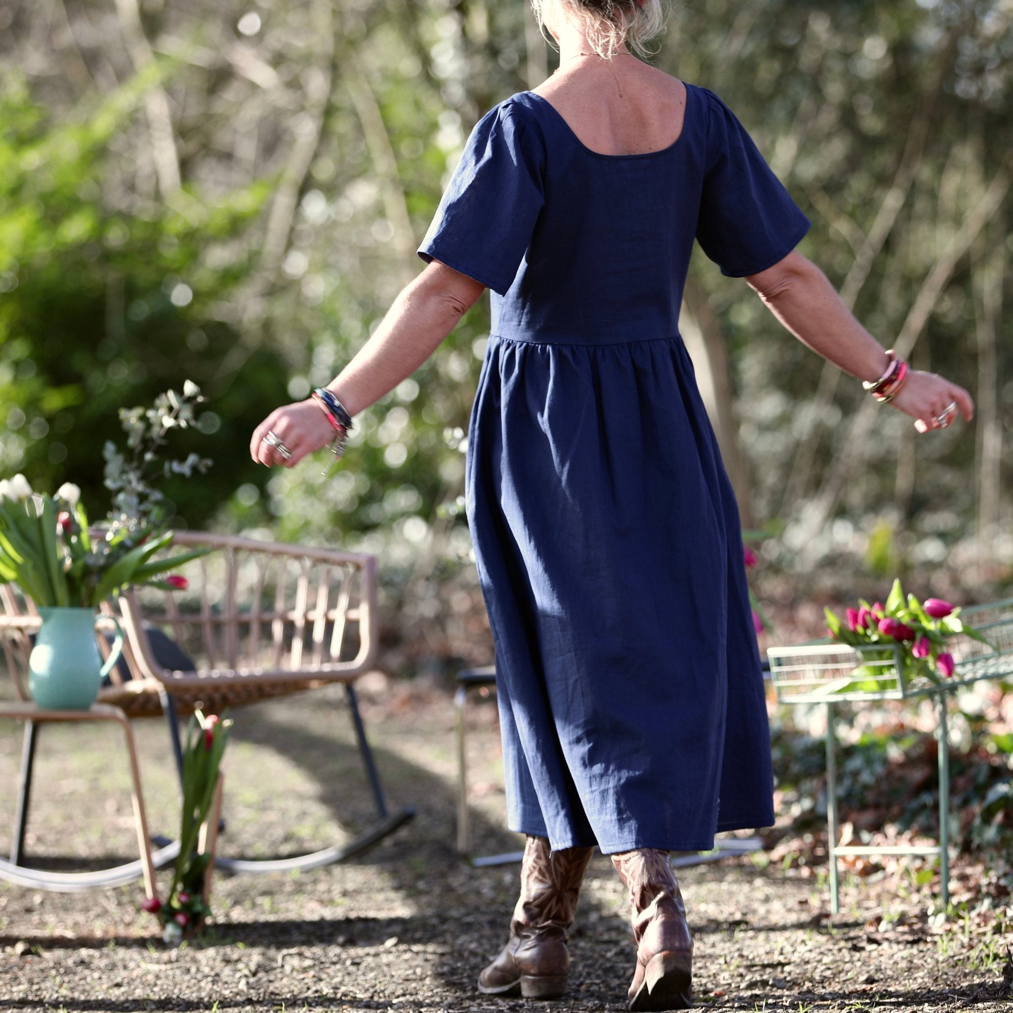 Confectionnée dans un lin bleu indigo 100 % lin, léger et fluide, cette robe offre un tombé naturel et respirant, idéal pour la saison estivale. Le lin apporte fraîcheur et authenticité, tandis que le bleu navy, profond et chic, traverse les saisons avec une élégance intemporelle.