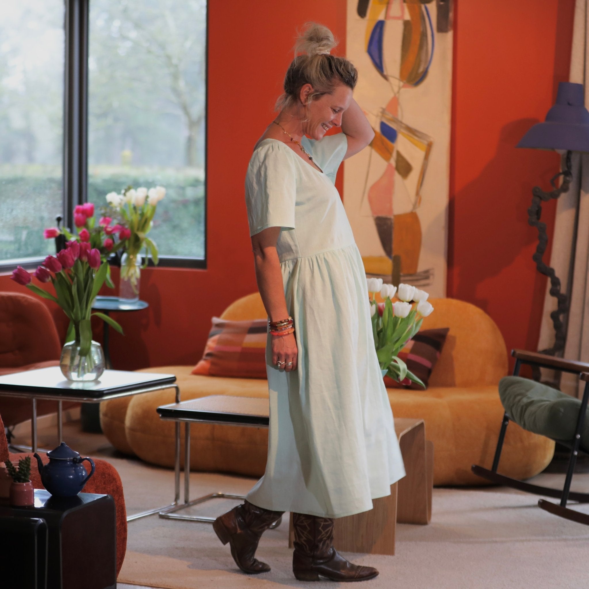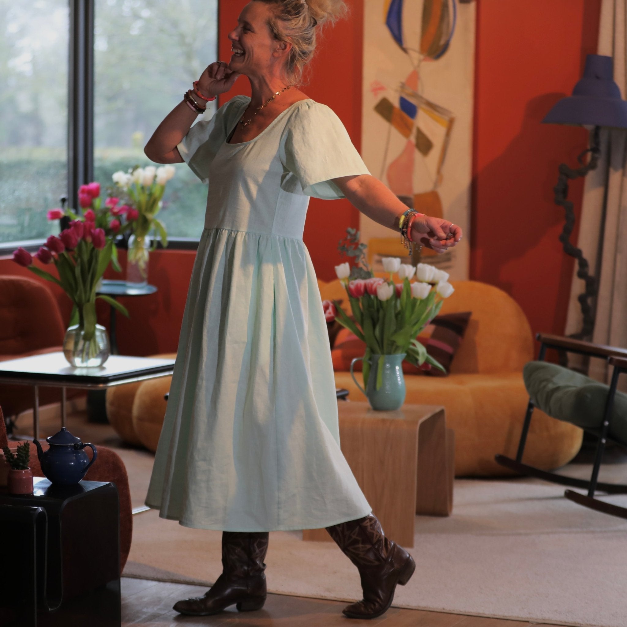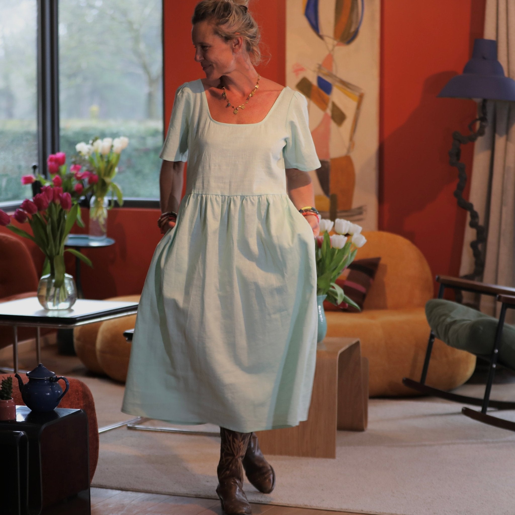 Confectionnée dans un lin vert pep's 100 % lin, léger et fluide, cette robe offre un tombé naturel et respirant, idéal pour la saison estivale.   Le lin apporte fraîcheur et authenticité, tandis que la teinte rose dragé illumine la silhouette avec douceur et délicatesse.