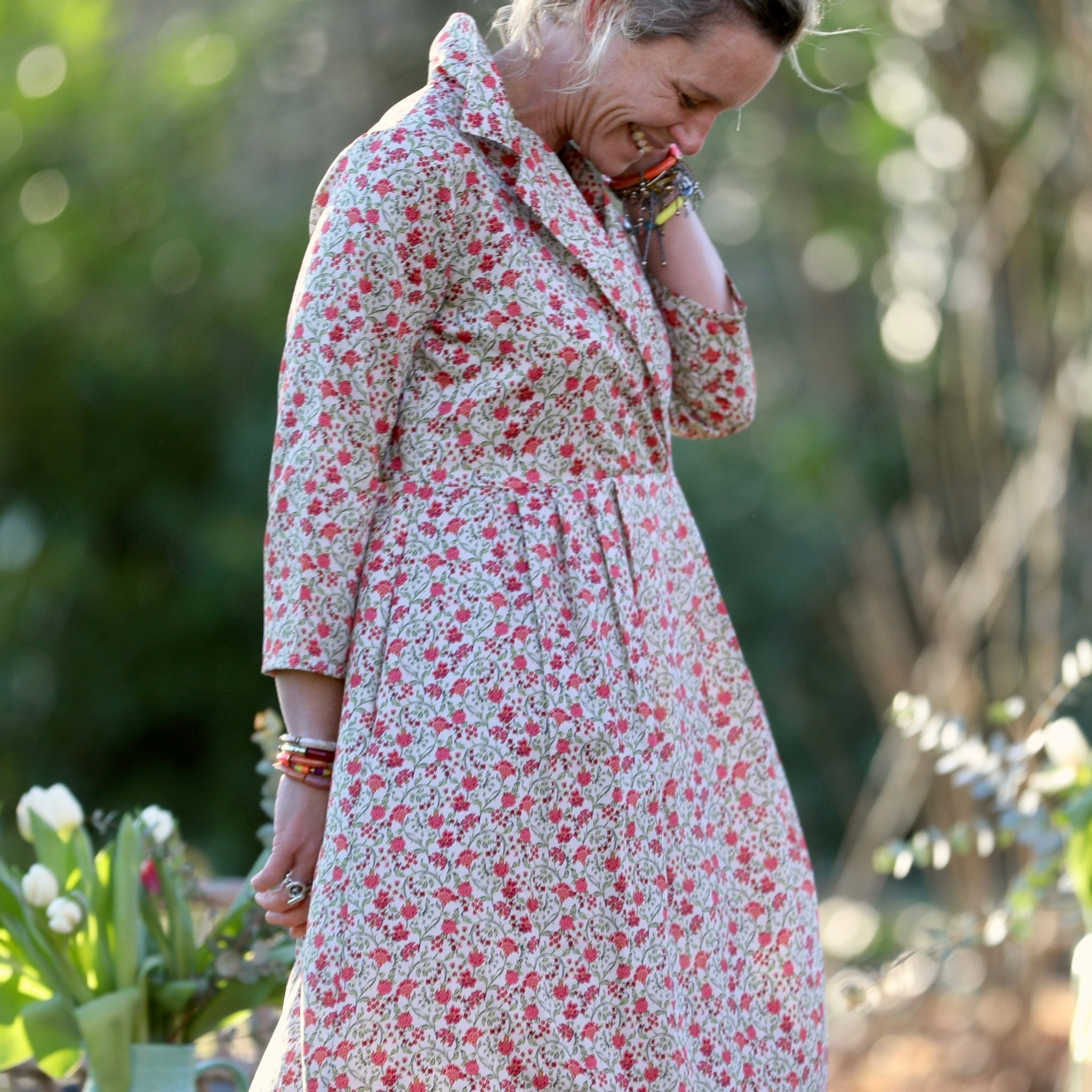 Confectionnée dans un satin de coton léger, fluide et lumineux, cette matière offre un tombé souple et une douceur agréable sur la peau. L’imprimé Hortensias roses, délicat et poétique, est imprimé en France dans un savoir-faire textile reconnu. Le tissu capte subtilement la lumière et apporte fraîcheur et féminité à la silhouette.